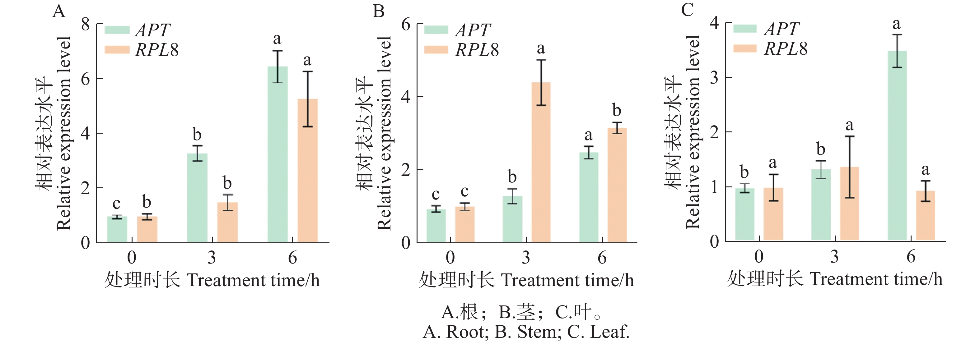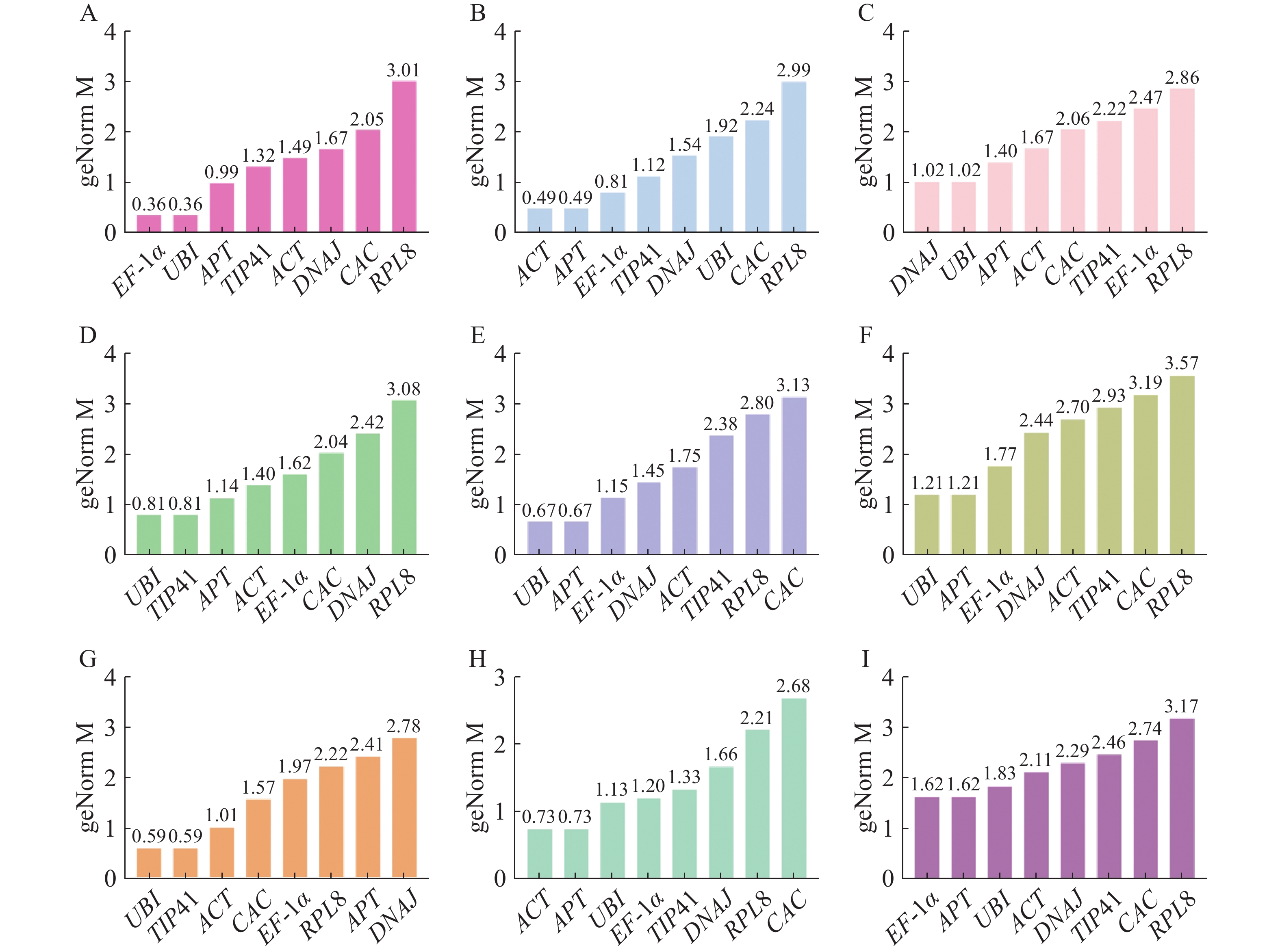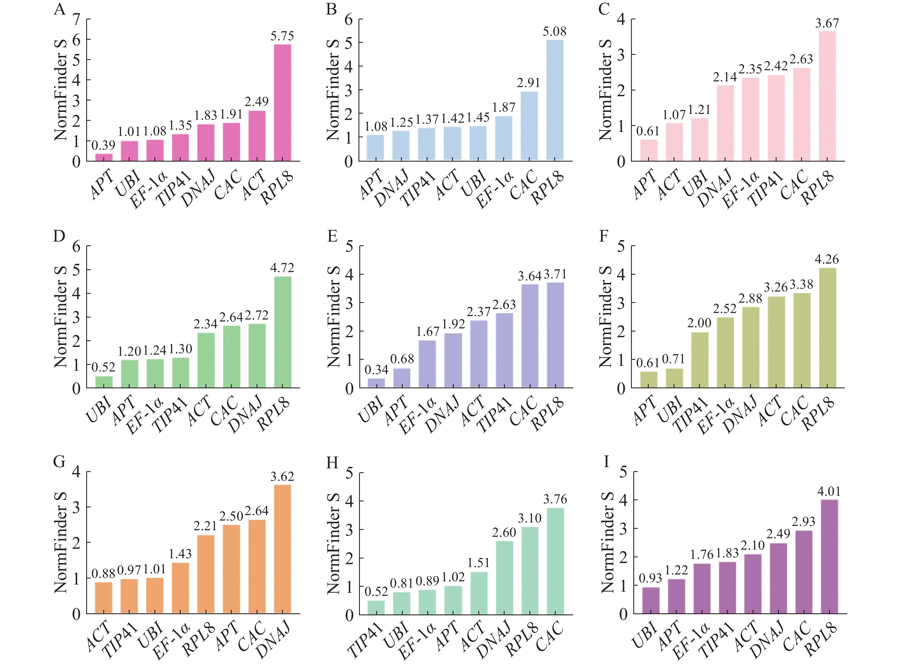 番茄(Solanum lycopersicum)是遗传学和分子生物学的研究模型。近年来,番茄内参基因的筛选已有较多的研究报道,但关于外源植物激素处理的种类较少,因此,本研究尝试筛选番茄在不同外源植物激素处理和不同组织部位中稳定表达的内参基因。为筛选番茄不同组织部位及植物激素处理下稳定表达的内参基因,以DANJ、EF-1α、ACT、UBI、APT、CAC、TIP41和 RPL8作为候选内参基因,在生长素、赤霉素、脱落酸、细胞分裂素、水杨酸、油菜素内酯、乙烯和不同组织部位8种试验条件下,利用geNorm、NormFinder、BestKeeper、Delta CT和RefFinder等算法对候选内参基因的稳定性进行综合评估,并通过生长素响应基因SlGH3.4对内参基因的稳定性进行验证。结果显示,APT是生长素、赤霉素、脱落酸、油菜素内酯处理和不同组织部位中表达最稳定的内参基因,UBI是全部样品中、细胞分裂素和水杨酸处理下最稳定的内参基因;TIP41是乙烯处理下表达最稳定的内参基因。最后,以综合排名较稳定的APT作为内参基因时发现,SlGH3.4基因的表达水平在生长素(IAA)处理条件下显示出相似的趋势,而稳定性较差的RPL8基因未能对目的基因的表达量进行准确校正。该研究结果可为后续番茄响应外源激素处理的基因表达网络分析和分子调控机制研究提供理论支撑。
