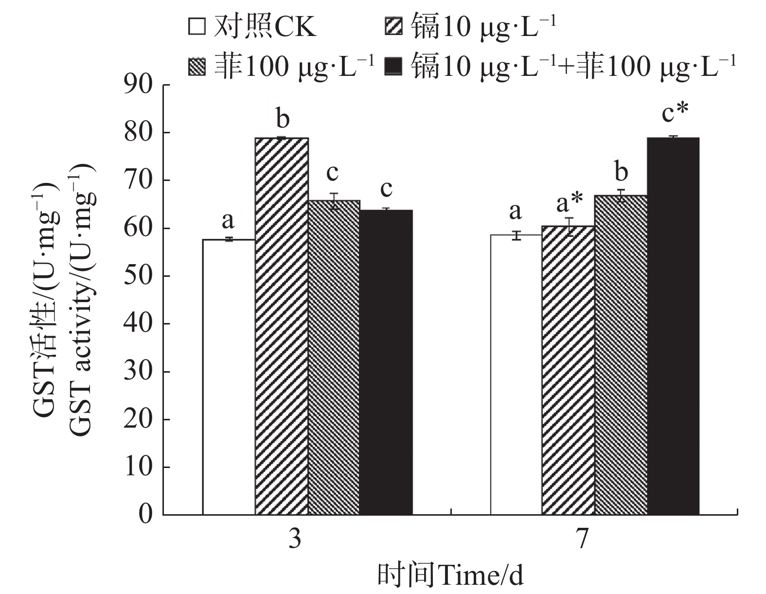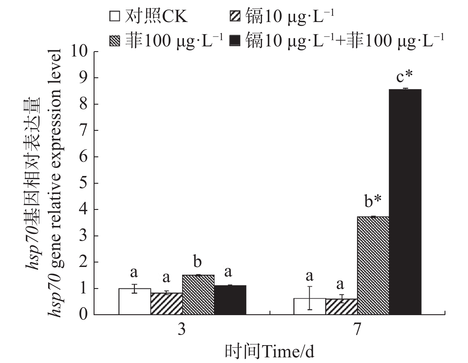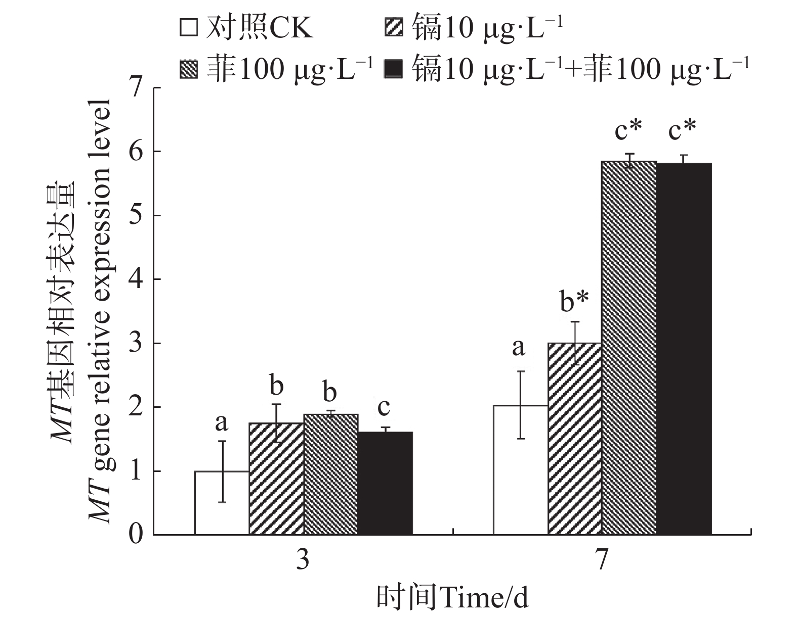 为了探讨镉和菲暴露对文蛤 (Meretrix meretrix)氧化应激反应及解毒代谢的影响,测定了镉单一暴露、菲单一暴露和镉-菲联合暴露下文蛤外套膜超氧化物歧化酶(SOD)、过氧化氢酶(CAT)、谷胱甘肽硫转移酶(GST)的活性变化和丙二醛(MDA)的含量变化,以及金属硫蛋白基因(metallothionein,MT)和热休克蛋白70 (heat shock protein70,hsp70)基因表达量的变化情况。研究结果表明,实验过程中各处理组SOD活性和GST活性大部分较对照组显著性升高(P<0.05),除了菲单一处理组,CAT活性和MDA含量大部分较对照组显著性升高(P<0.05)。各处理组MT基因均被显著诱导(P<0.05),除镉单一处理组,hsp70基因均较对照组被显著性诱导(P<0.05)。暴露3 d时,除hsp70基因的表达,镉和菲联合暴露对其他指标均存在显著交互作用(P<0.05);暴露7 d时,除CAT酶活性和MDA含量,镉和菲联合暴露对其他指标均存在显著交互作用(P<0.05)。结果表明,大部分处理组中镉和菲显著提高文蛤氧化应激相关酶活性,MT基因和hsp70基因被诱导对机体进行解毒和调节,提高机体抗刺激和生存能力。