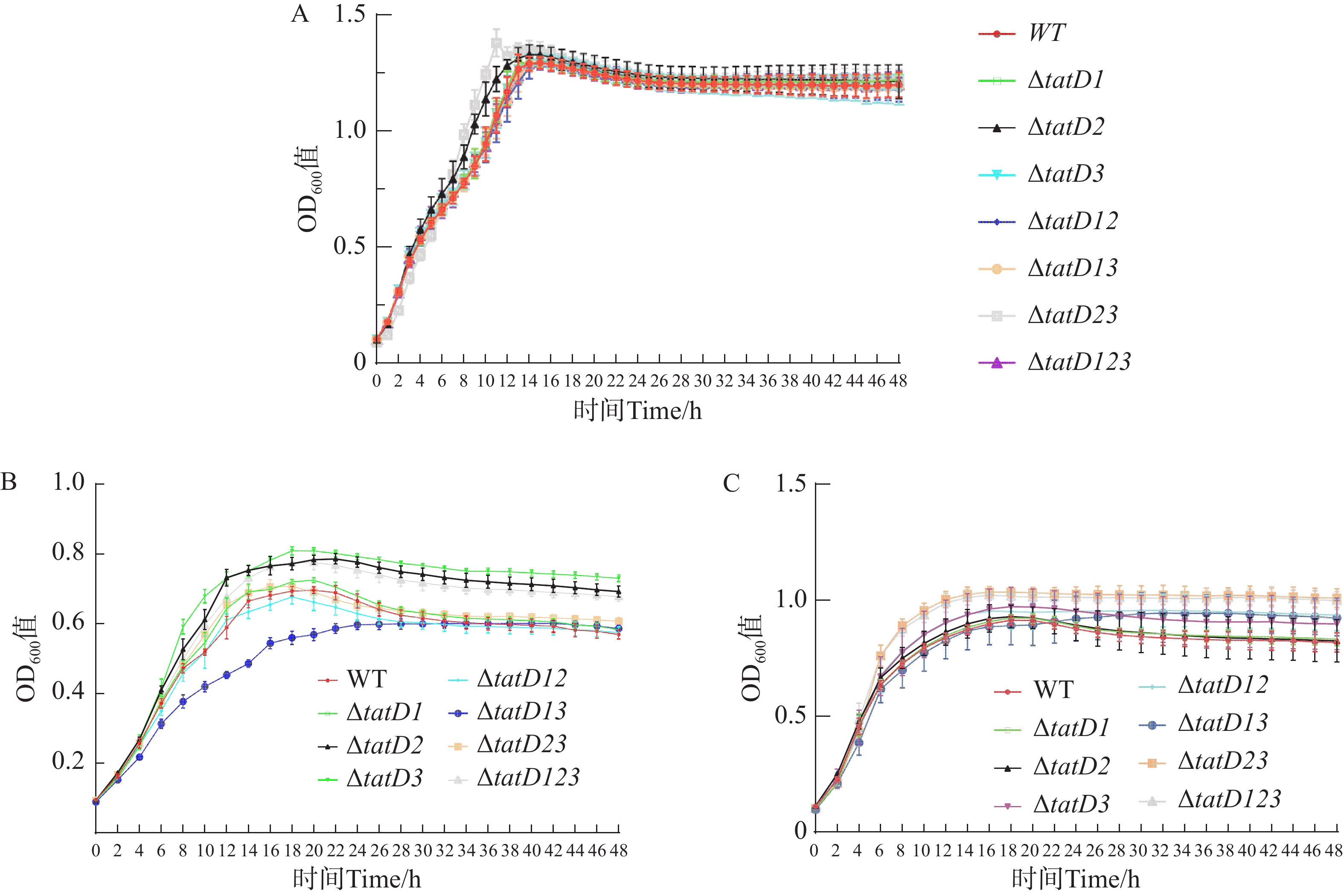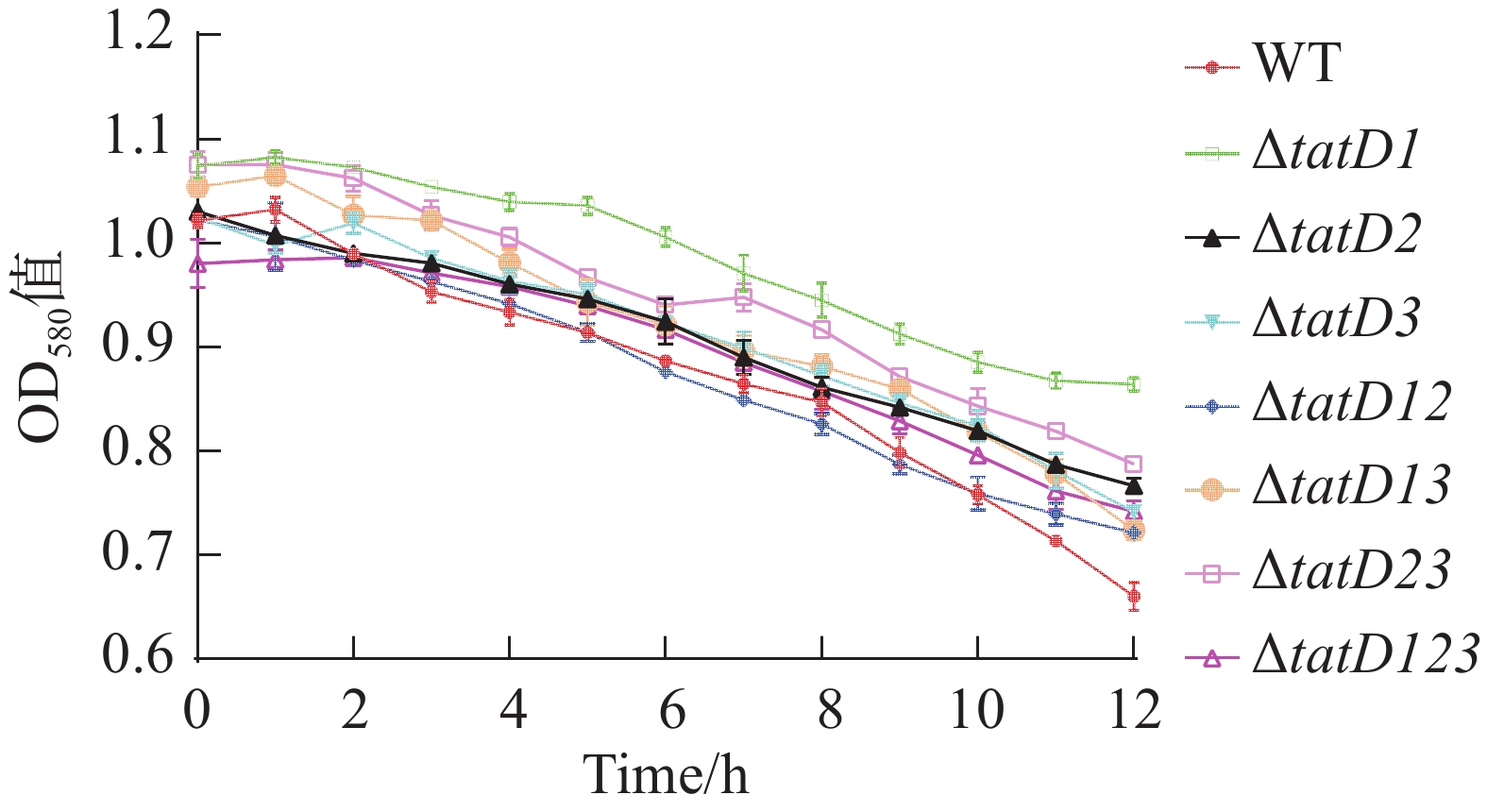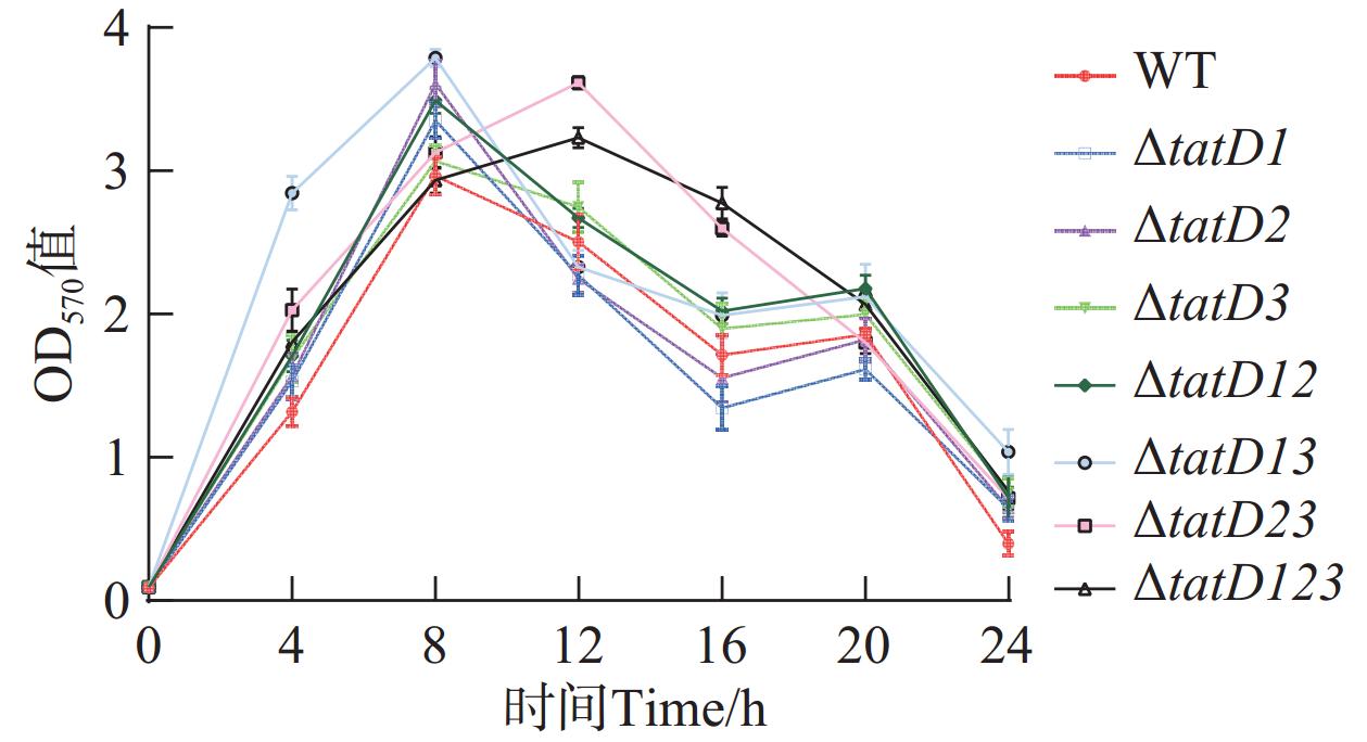 溶藻弧菌是一种海洋常见革兰氏阴性细菌,广泛存在于水产养殖环境中,它对养殖鱼类、贝类和对虾都具有极强的侵染性和致病性,其导致的弧菌病给养殖业造成了巨大的经济损失。tatD基因编码具有核酸酶活性的蛋白,其功能与细菌生物被膜形成及毒力调控相关。本研究利用基因敲除技术研究了溶藻弧菌HN08155菌株的tatD基因在菌体生长与生物被膜形成过程中的功能。研究结果表明,溶藻弧菌HN08155菌株含有3个tatD基因,在正常营养条件下tatD基因不影响细菌生长,在低营养条件下对细菌的生长具有调节作用;分泌到胞外的TatD蛋白具有核酸酶活性,野生株培养物上清液降解DNA的能力高于tatD基因缺失菌株;在0.1% Triton X-100 的诱导下,tatD基因缺失株自溶率显著高于野生株;tatD基因缺失后,溶藻弧菌生物被膜量与厚度显著增加。