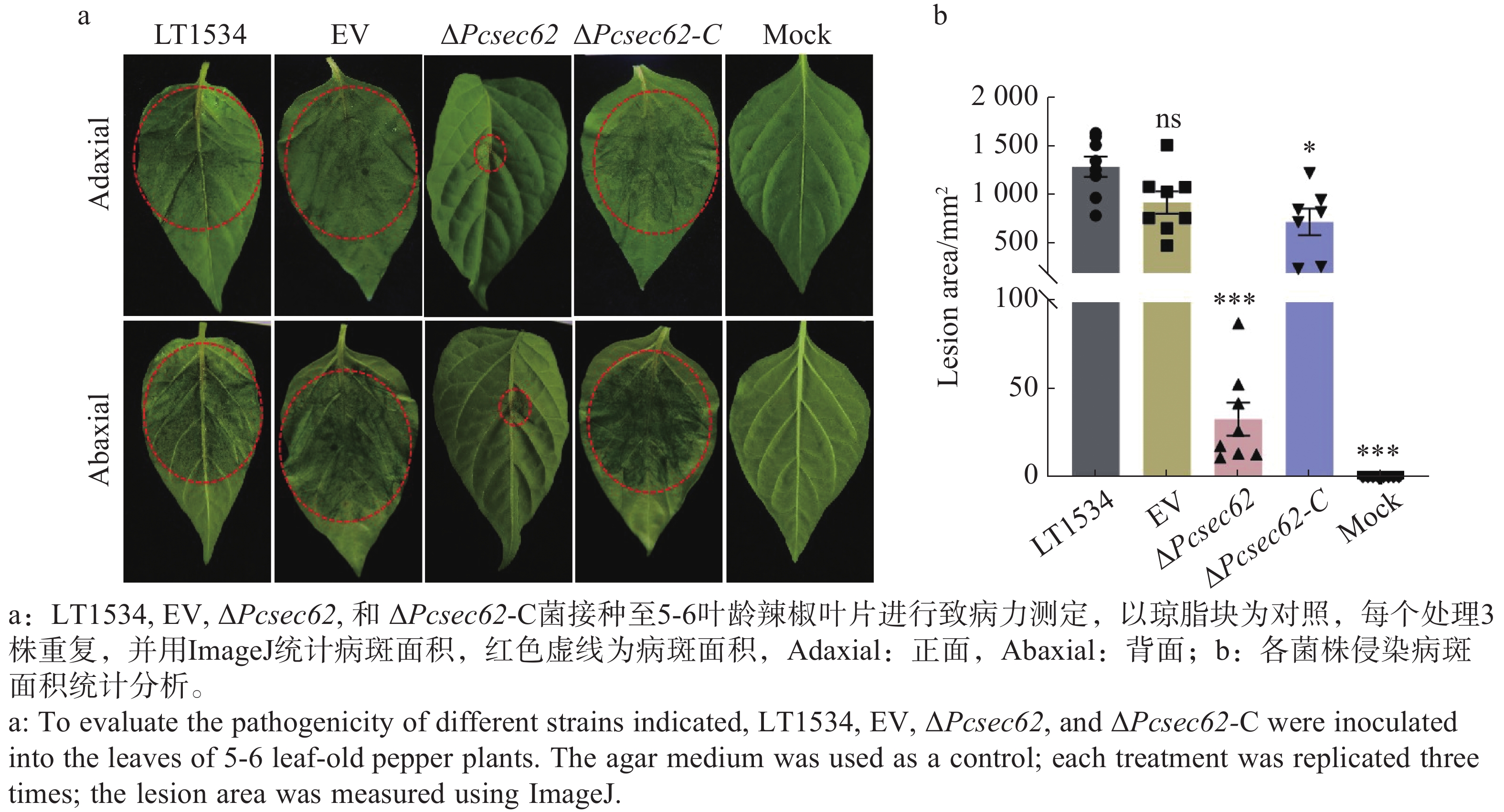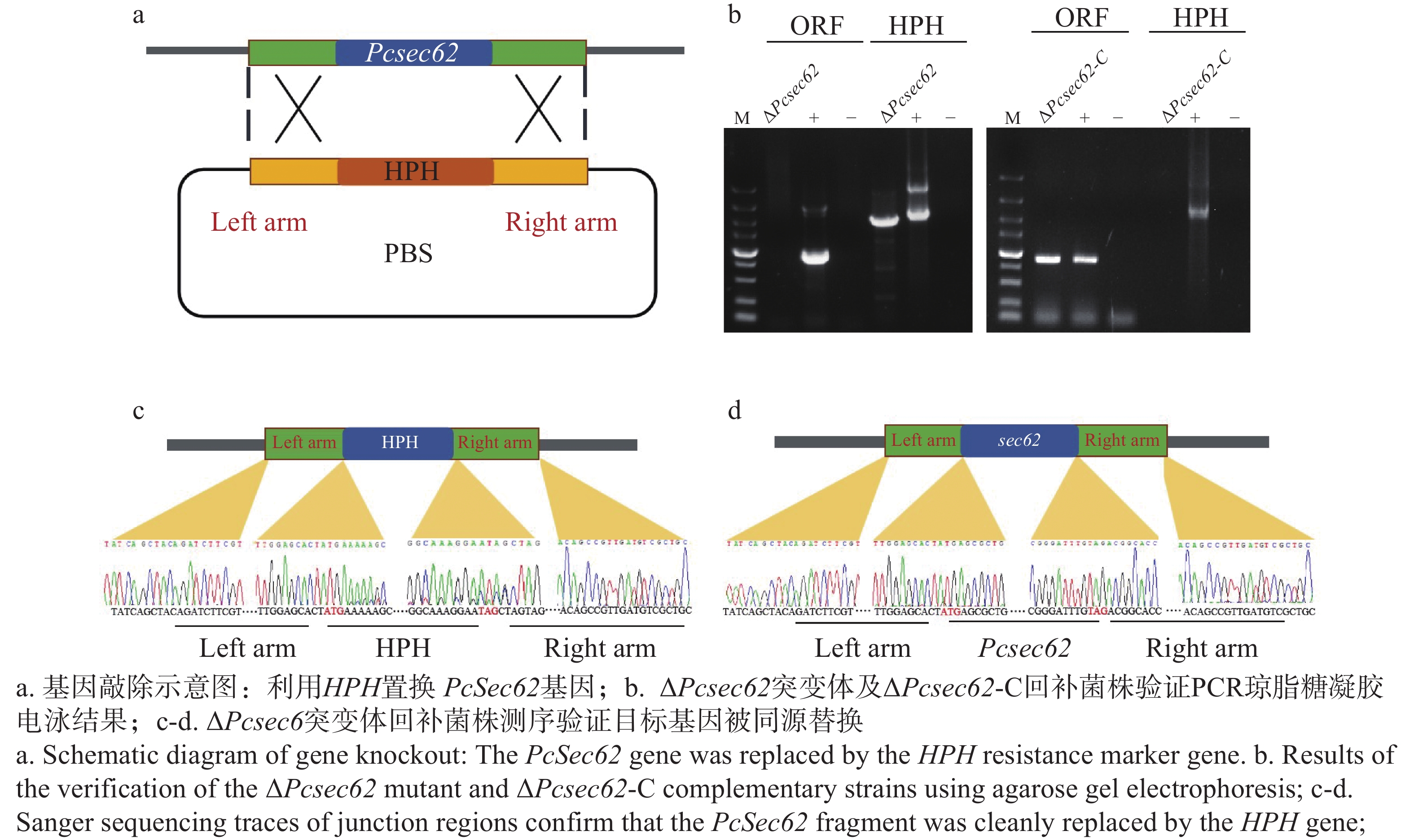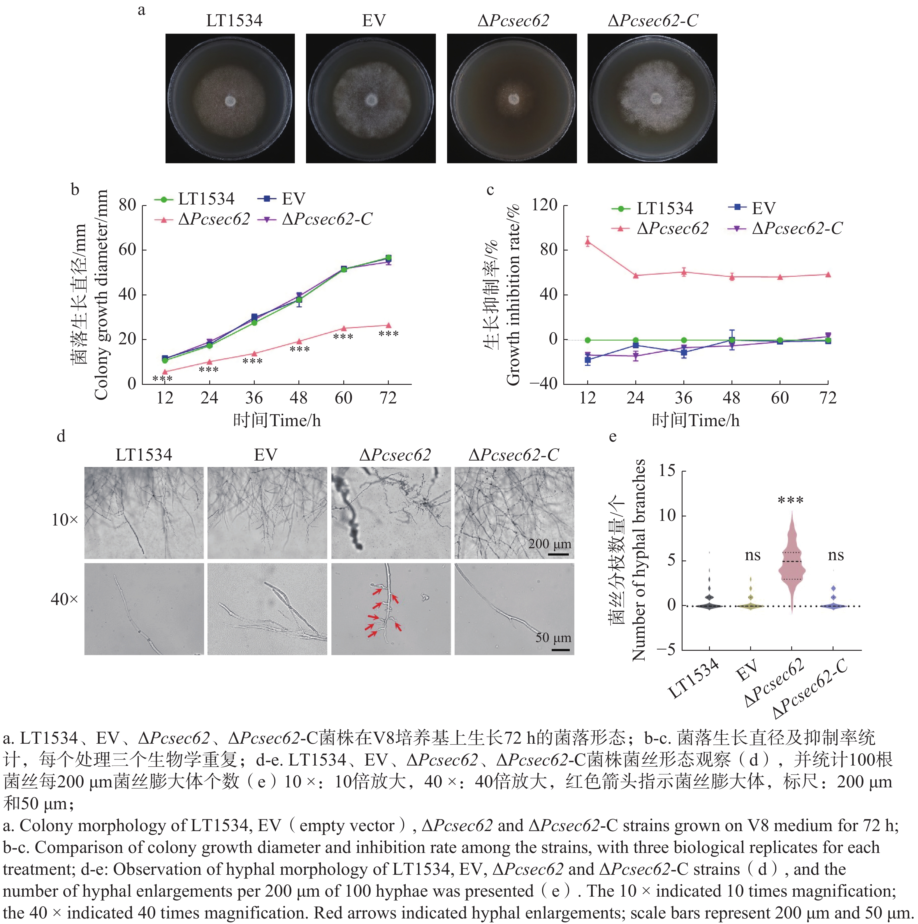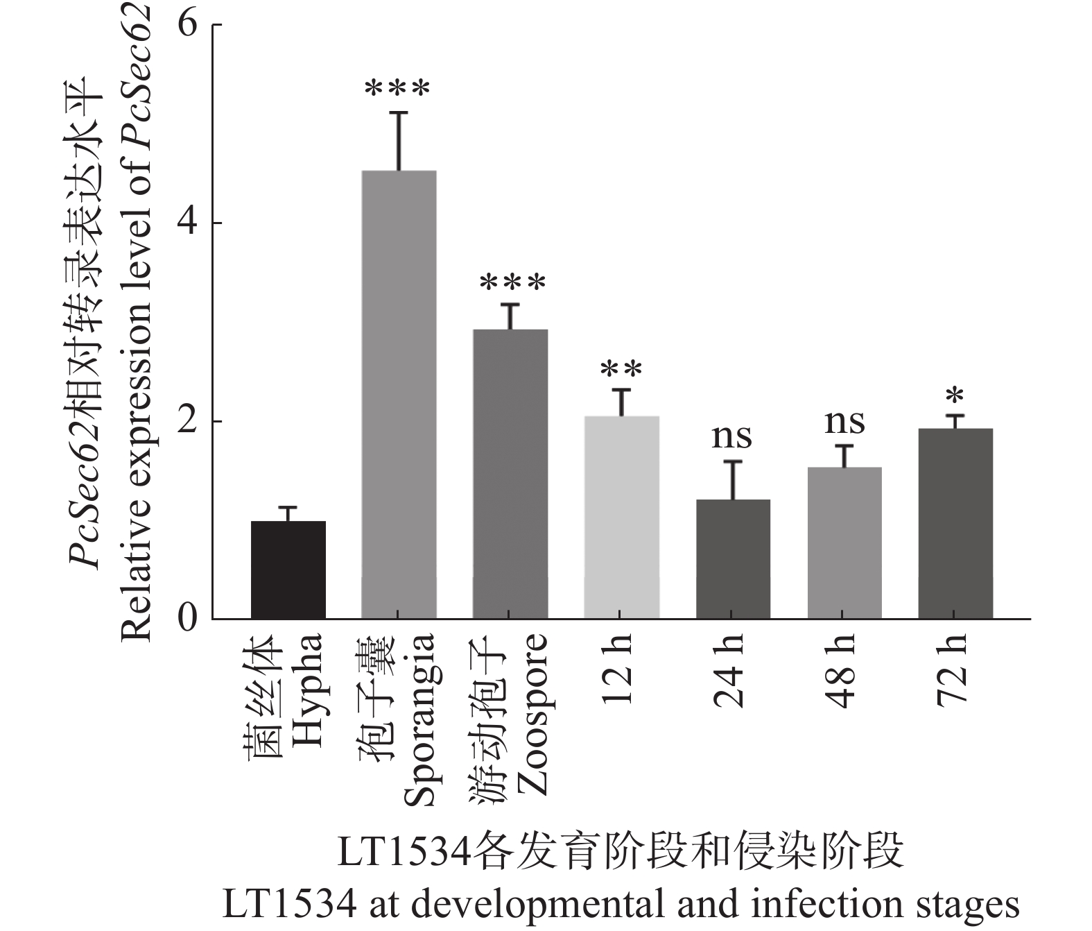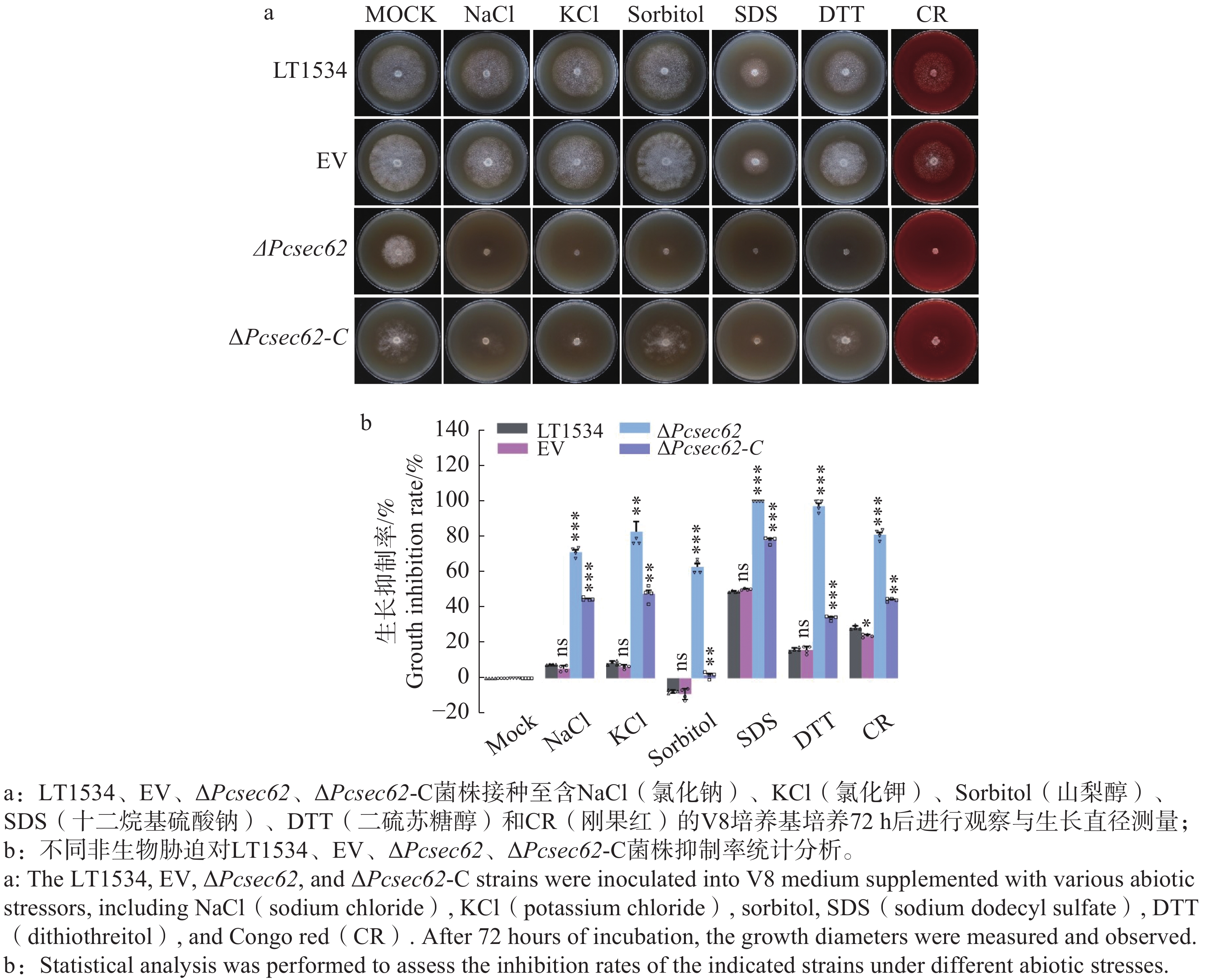 内质网是真核细胞蛋白加工的重要场所,Sec62作为内质网易位复合体的重要组成部分,在机体生长发育及应激调节过程中具有重要作用。本研究对不同生育阶段及致病过程PcSec62基因转录水平进行检测,通过CRISPR/Cas9基因编辑获得辣椒疫霉(Phytophthora capsici)PcSec62基因敲除突变体ΔPcsec62及回补菌株ΔPcsec62-C,以野生型及空载菌株为对照,对突变体进行生物表型分析。结果显示,孢子囊及侵染阶段PcSec62转录表达显著增高, ΔPcsec62突变体生长及产孢能力显著下降,且菌丝极性生长受阻膨大体显著增多;同时ΔPcsec62菌株对于非生物胁迫的耐受能力和致病能力显著下降。上述结果表明PcSec62参与调控辣椒疫霉生长、发育、非生物胁迫响应及致病性过程。