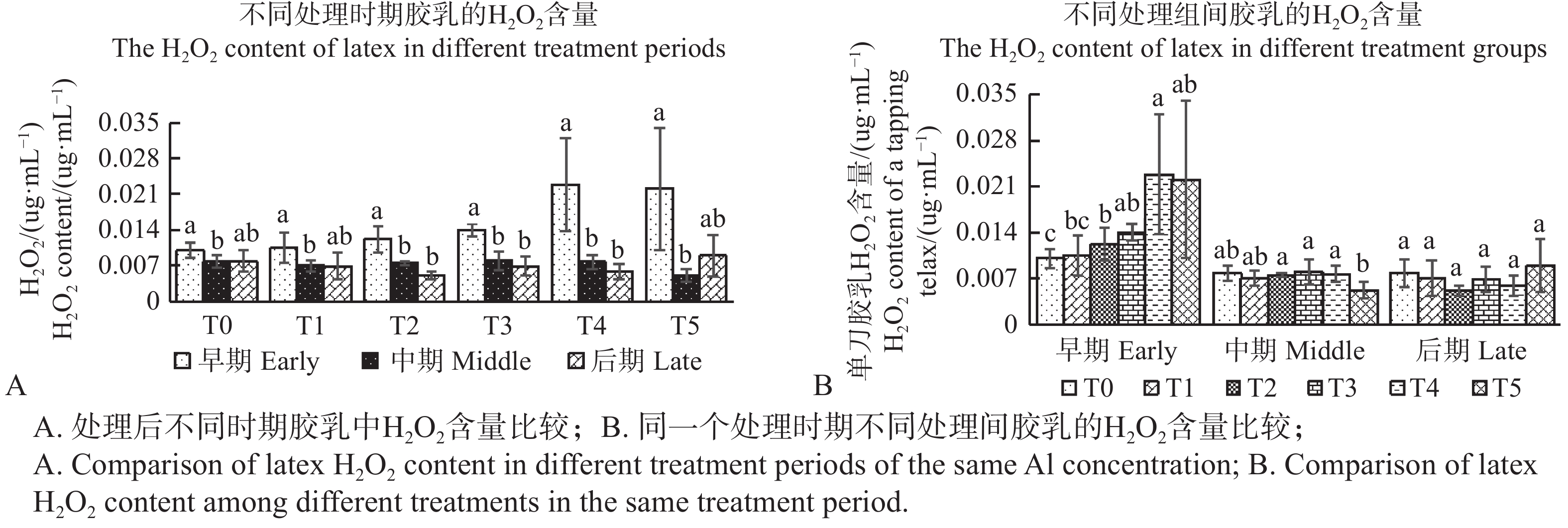 为明确铝胁迫对成龄橡胶树(Hevea brasiliensis)胶乳产量、生理参数和死皮病发生率的影响,以开割8年的‘热研7-33-97’橡胶树为材料,利用2个不同pH的对照溶液(T0为超纯水,pH7.0;T1为用盐酸调节pH4.2的超纯水溶液)和4个浓度的AlCl3溶液(T2~T5分别为50、100、200和400 mmol·L−1的铝溶液,pH均为4.2)对割面进行处理,观察不同铝溶液处理早期、中期和后期橡胶树排胶体积、干胶产量、胶乳生理参数、死皮发生率和等级的变化。结果表明,割面铝处理早期的排胶体积和干胶产量增加,中期下降到与对照持平水平,后期低于对照,但10刀的总排胶体积和干胶产量与对照无显著差异;铝处理提高早中后3个时期胶乳的干胶含量、早期胶乳黄色体破裂指数和后期胶乳的硫醇含量,说明铝处理导致排胶能力变差;铝处理也导致早中后期胶乳蔗糖含量降低、后期胶乳镁离子浓度下降和无机磷浓度上升,说明铝处理也导致了产胶性能变差;另外,高浓度铝处理也会导致死皮发生率和死皮等级的增加。试验结果显示,高于50 mmol·L−1的铝溶液处理割面短期可以增加排胶体积,维持一定时期内干胶产量的稳定,但会导致排胶和产胶能力的下降,诱导死皮病发生,不利于维持长期胶乳产量的稳定。