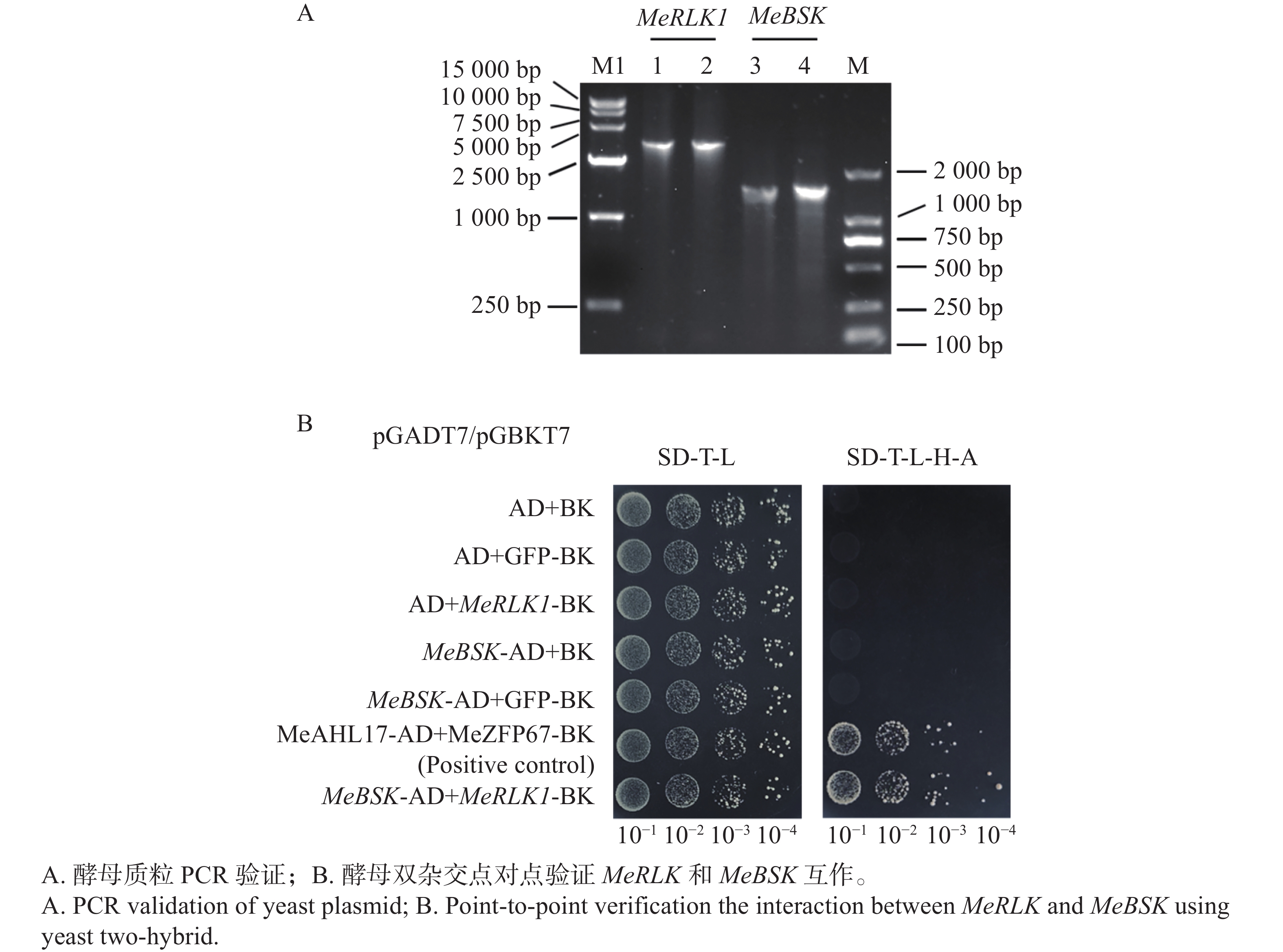 为了筛选出木薯(Manihot esculenta)中与MeRLK1 (receptor-like kinase 1)共同调控木薯抗病的相关蛋白,本研究通过酵母双杂交文库筛选,获得MeRLK1蛋白的24个候选互作蛋白,包括Heat shock protein (Hsp)、ADP-ribosylation factor 1 (ARF1)和Aquaporin transported protein (AQP)等。进一步分析MeRLK1与24个候选互作基因的时空表达相关性,结果发现,在不同组织部位和在胁迫条件下Pentatricopeptide repeat 2(PPR2)、BR-signaling kinase (BSK)等基因表达与MeRLK1存在较高的相关性(R>0.7)。在筛选的基础上,构建油菜素内酯(Brassinosteroid,BR)信号通路相关蛋白MeBSK全长序列载体,通过酵母双杂交实验发现,MeRLK1与MeBSK可能存在互作关系,后续需要进一步通过BiFC验证体内互作。