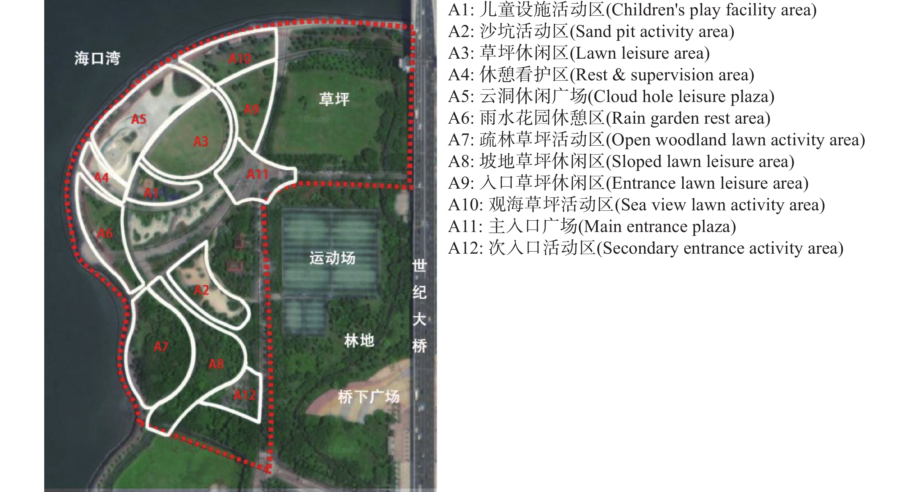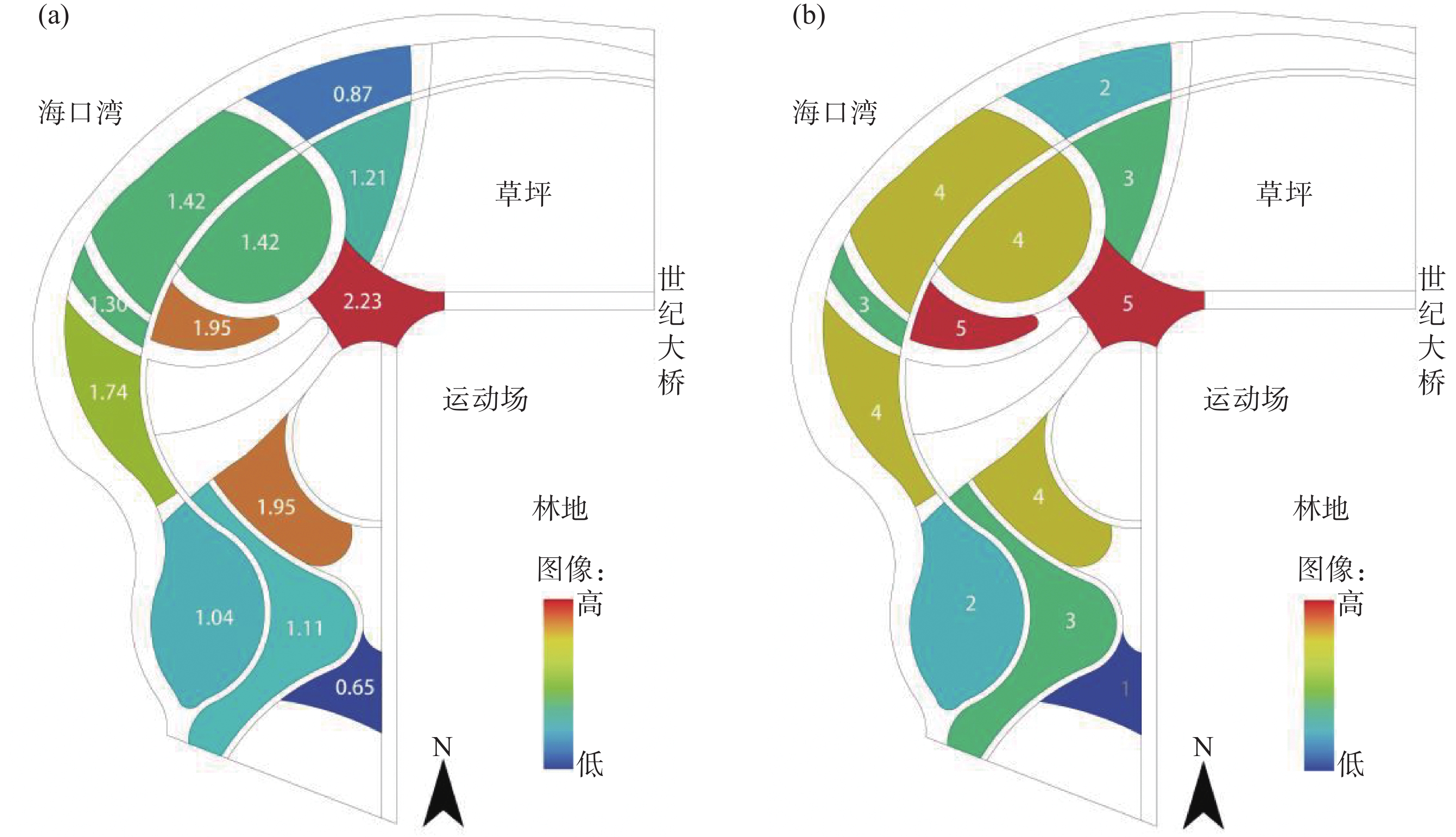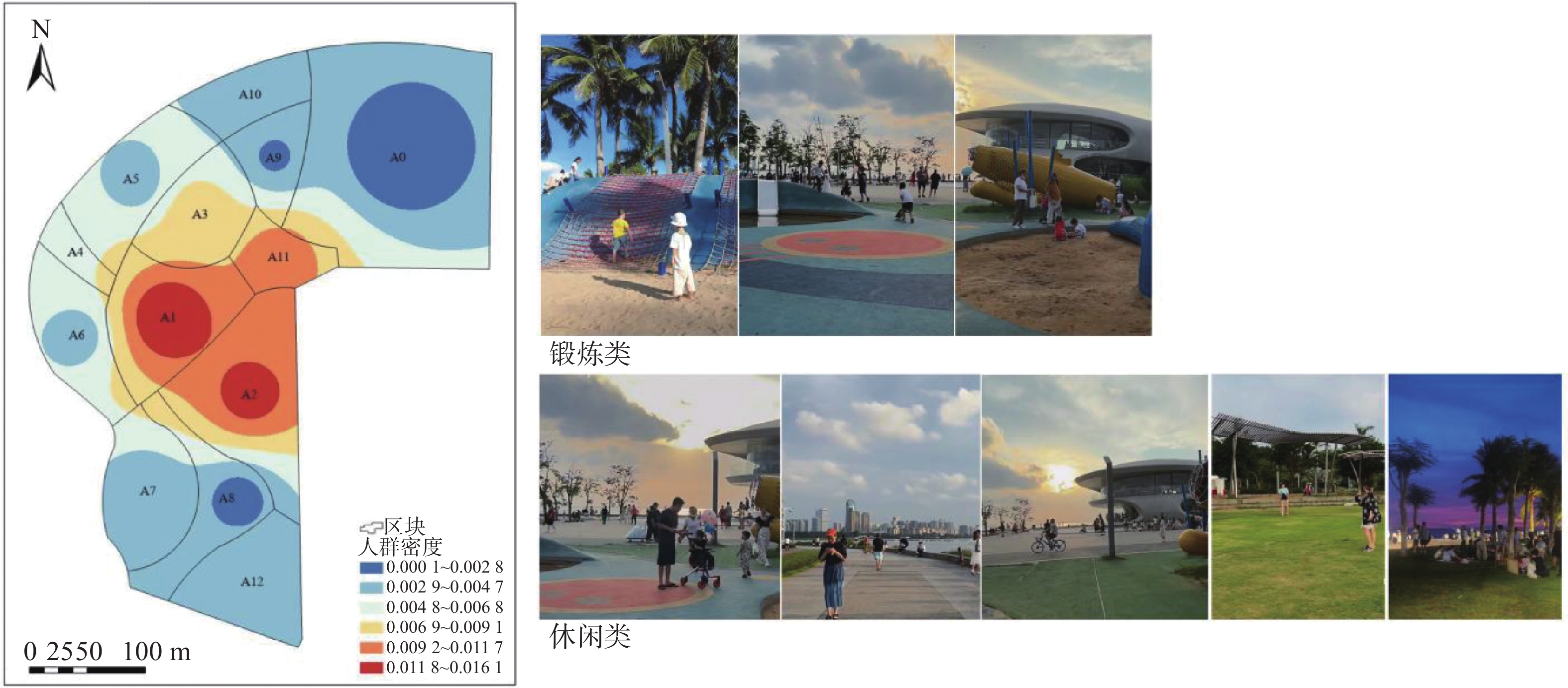 滨水公园作为激发居民体力活动的关键载体,其空间特征的健康效应在热带滨海地区亟待深化研究。本研究以海口市典型滨海公园世纪公园为研究对象,综合运用空间句法分析与行为观测法,从空间组织特征(整合度、连接度)和形态特征(可进入面积、形状指数)两个维度,分析其与体力活动(包括锻炼类和休闲类)密度的相关性。结果表明:1)傍晚时段,体力活动在各空间表现出较为明显的分异特征;2)空间组织特征显著促进活动密度(整合度相关系数为 0.76,连接度相关系数为 0.68),其中整合度贡献率占比达63.2%;3)空间形态特征(面积、形状指数)与活动密度无显著相关性(P>0.05),证实人群聚集更受拓扑关系而非几何属性支配。建议通过重点提升关键节点与路径的空间可达性(连接度与整合度)、优化核心空间功能复合性与舒适性、改善边缘空间连接性,植入差异化场景分流压力,构建支持体力活动的热带气候适应性城市滨海公园环境。