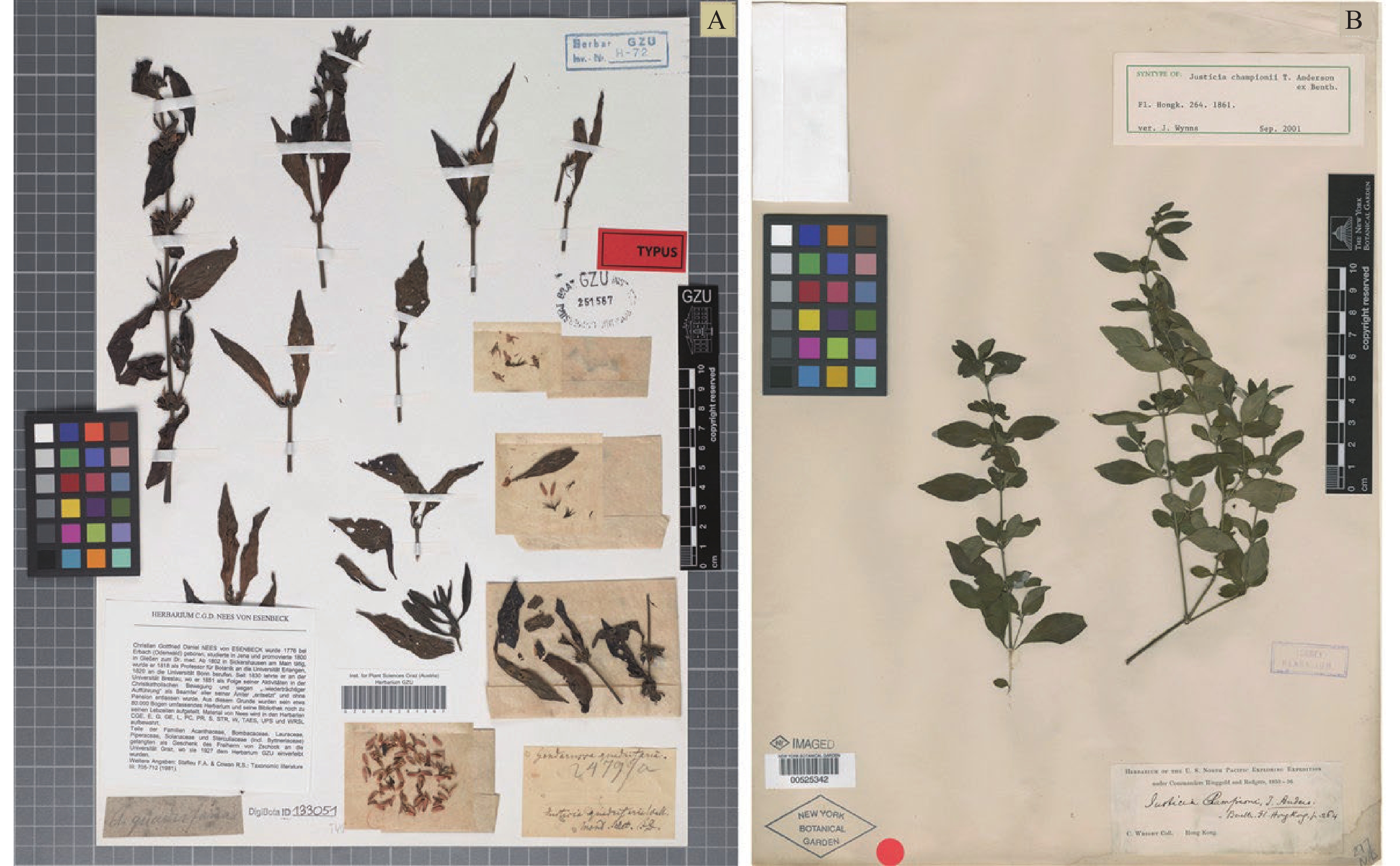 为了进一步调查清楚江西赣南九连山地区的丹霞地貌的植物资源,采用样线调查法对丹霞景区的植物进行了调查,结果在龙南市小武当山景区发现一爵床属植物新变种——长毛杜根藤(Justicia quadrifaria var. hirsuta Xu),该变种和模式变种杜根藤(Justicia quadrifaria (Nees) Anderson)的区别在于茎﹑叶柄﹑叶片两面﹑苞片﹑萼片和花冠筒外面均被1~3 mm的白色开展长硬毛;而杜根藤的茎被倒向易脱落的短柔毛,叶片两面被易脱落的短柔毛,叶柄﹑苞片﹑萼片和花冠筒外面均被短柔毛。系统发育学分析也支持该变种的划分。该变种的发现进一步丰富了该属植物的物种多样性,也可为该类植物的开发利用提供新的参考。