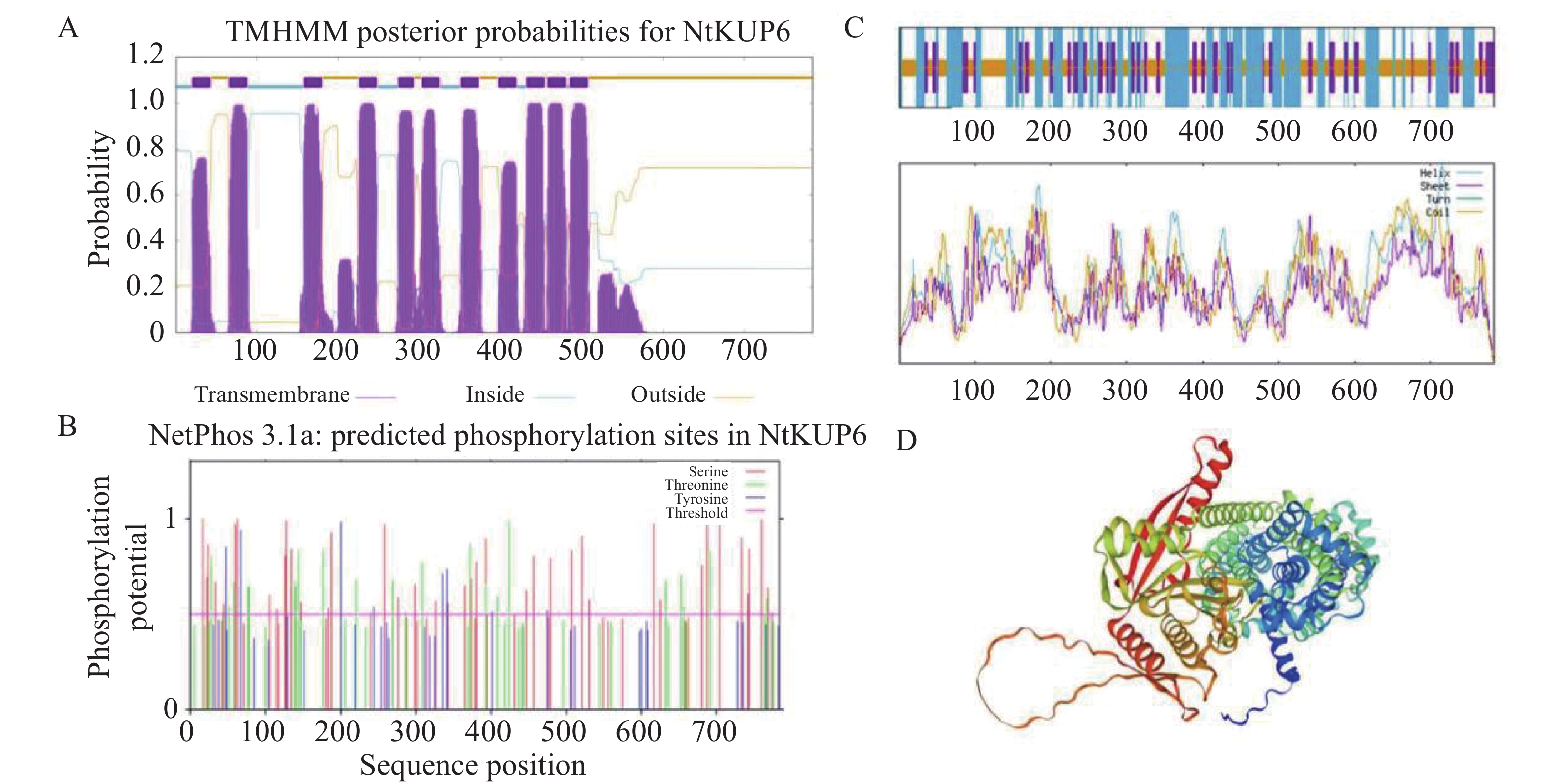 钾是影响烟草产量与品质的关键元素。为探究烟草钾转运蛋白基因NtKUP6的功能,本研究以烟草(中烟100)为材料,克隆获得编码区全长为2355 bp的NtKUP6基因。生物信息学分析结果表明,NtKUP6基因编码的蛋白具有11个跨膜结构域,且启动子区含有MBS、ABRE等与非生物胁迫及激素响应相关的顺式作用元件。亚细胞定位表明NtKUP6蛋白定位在细胞膜上。表达模式分析结果显示,NtKUP6基因在根中表达量最高,并能被干旱、高盐、低温和ABA处理显著诱导。功能验证方面,通过病毒诱导的基因沉默技术(VIGS)沉默NtKUP6基因表达后,烟草叶片中的钾离子含量显著降低(约39.3%);在本氏烟中过表达NtKUP6基因,烟草叶片中的钾离子含量显著升高(53%)。综上,NtKUP6是一个在烟草钾积累及非生物胁迫响应中发挥重要功能的钾转运蛋白基因,为解析烟草钾营养分子机制提供了理论依据。