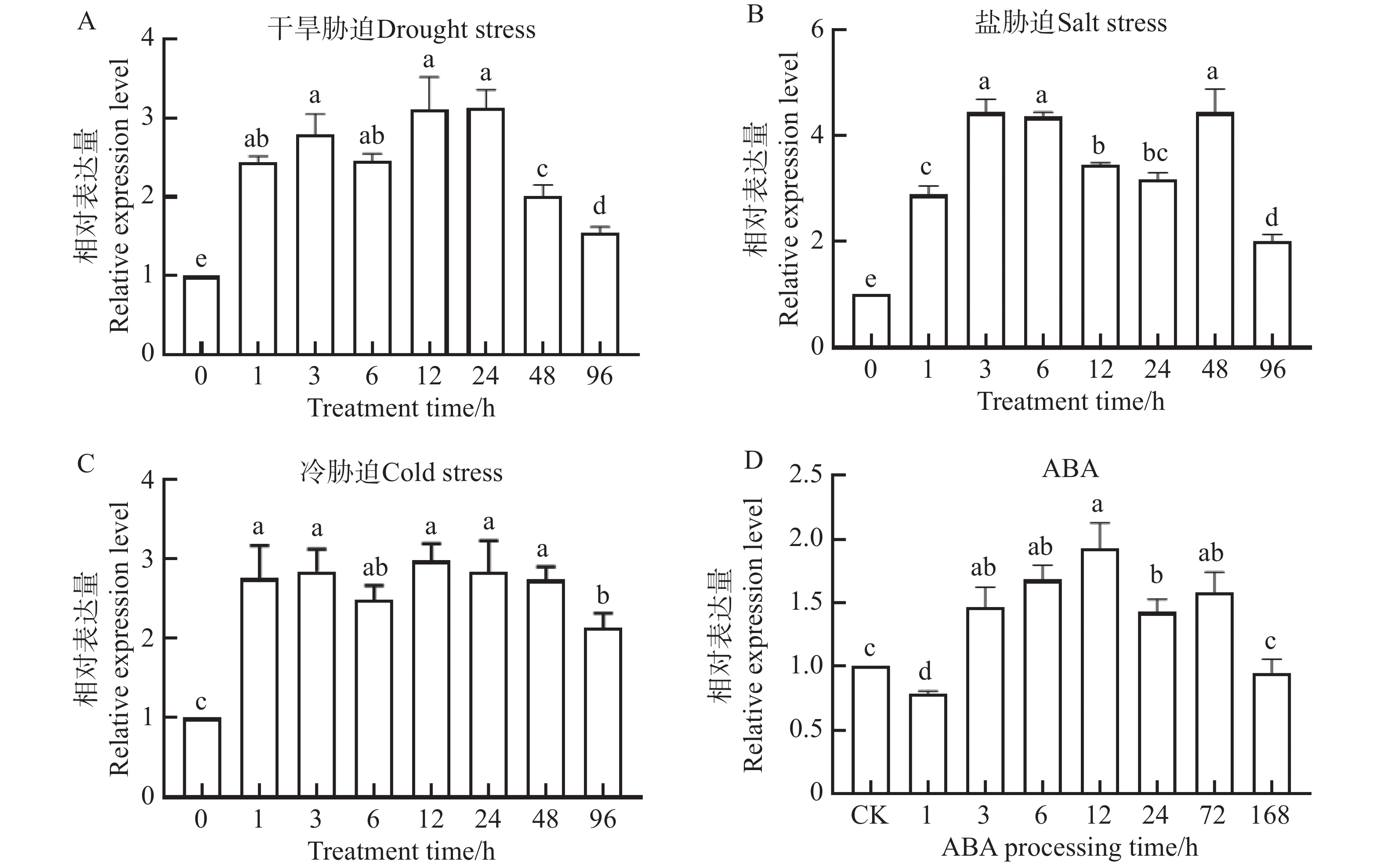 为探究MYB转录因子基因是否参与了盐胁迫下对海雀稗(Paspalum vaginatum Sw.)生长发育的调控,本研究分析了盐胁迫对海雀稗生长的影响,克隆了PvMYB1基因,通过生物信息学及基因表达两种分析方法展开研究。结果表明:盐胁迫抑制了海雀稗地上部和根系生长,具体表现为总根长、根表面积及根体积的降低。海雀稗PvMYB1基因全长为1 098 bp,编码365个氨基酸残基,蛋白分子量为 39.26 kDa,属于R2R3-MYB家族,亚细胞定位预测 PvMYB1蛋白定位于细胞核中。实时荧光定量PCR结果显示,PvMYB1基因在叶中的表达量高于在根中的表达量;不同时段NaCl处理结果显示,30 g·L−1 NaCl处理显著提升了PvMYB1基因的转录水平。此外,在不同NaCl浓度处理的条件下,在NaCl浓度升至15 g·L−1时,根和叶中的PvMYB1基因的表达量显著上调。本研究结果揭示了PvMYB1可能参与了海雀稗对NaCl胁迫的应答。