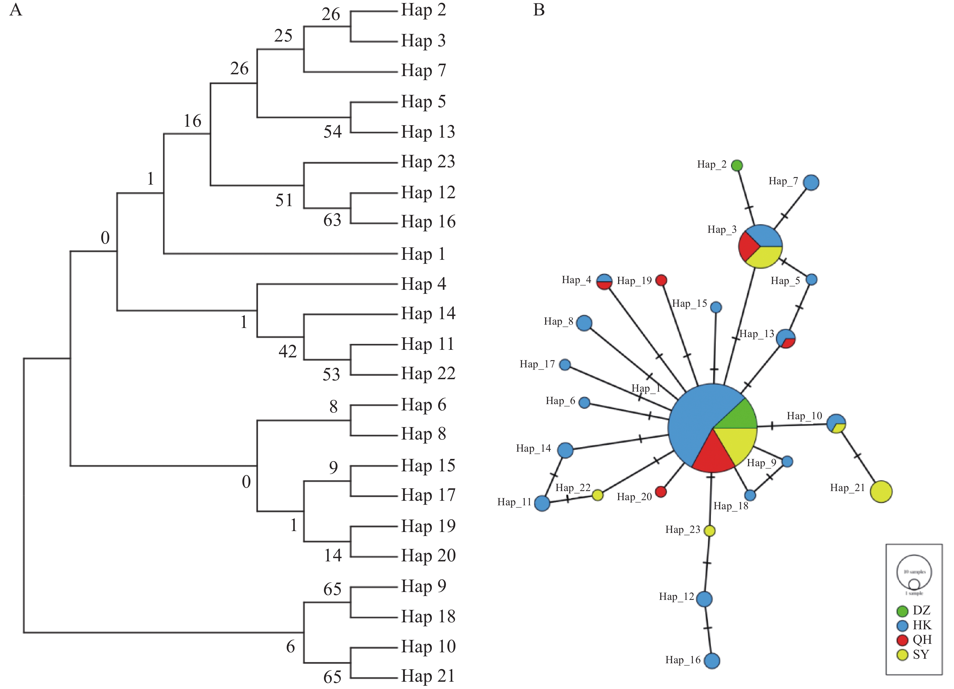 为获得海南最新蚊子种类信息,分析登革热传播媒介白纹伊蚊的种群遗传多样性及地理种群间分化和基因流状况,本研究从海南省4个地理区域收集蚊虫,PCR扩增COⅠ基因并测序,通过Blast比较鉴定蚊种。使用MEGA11对不同来源白纹伊蚊COⅠ基因序列进行比对,计算碱基的相对含量,计算碱基和密码子的使用频率。应用邻接算法来构建单倍型系统发育树。使用Dnasp6.0分析位点多态性、种群遗传距离、单倍型和多样性分析,以及错配分布分析。使用PopART 1.7 软件构建单倍型网络图。使用Arlequin 3.1软件分析计算群体间遗传分化系数(Fst值)、基因流(Nm值)。使用分子变异分析(Analysis of molecular variance, AMOVA)法分析种群内和种群间的遗传变异。研究结果表明, 共捕获8属43种吸血蚊种,它们分别属于按蚊属(Anopheles)、库蚊属(Culex)、伊蚊属(Aedes)、阿蚊属(Armigeres)、巨蚊属(Toxorhynchites)、曼蚊属(Mansonia)、小蚊属(Mimomyia)和煞蚊属(Sabethes)。共鉴定了19种按蚊、13种库蚊、6种伊蚊,以及少量的骚扰阿蚊(Armigeres subalbatus)、吕宋小蚊(Mimomyia luzonensis)、巨蚊(Toxorhynchites ambionensis)、常型曼蚊(Mansonia uniformis)和煞蚊(Sabethes glaucodaemo)。研究发现白纹伊蚊三亚种群和儋州种群之间为中度分化,其他种群两两之间处于轻度分化,基因交流频繁。白纹伊蚊种群中的中国海南种群与中国云南种群和老挝种群、越南种群、马来西亚种群之间遗传分化较低,存在明显的基因交流。这揭示海南岛外的病毒有传进岛内的安全隐患,本研究结果对海南岛公共卫生具有重要的意义。