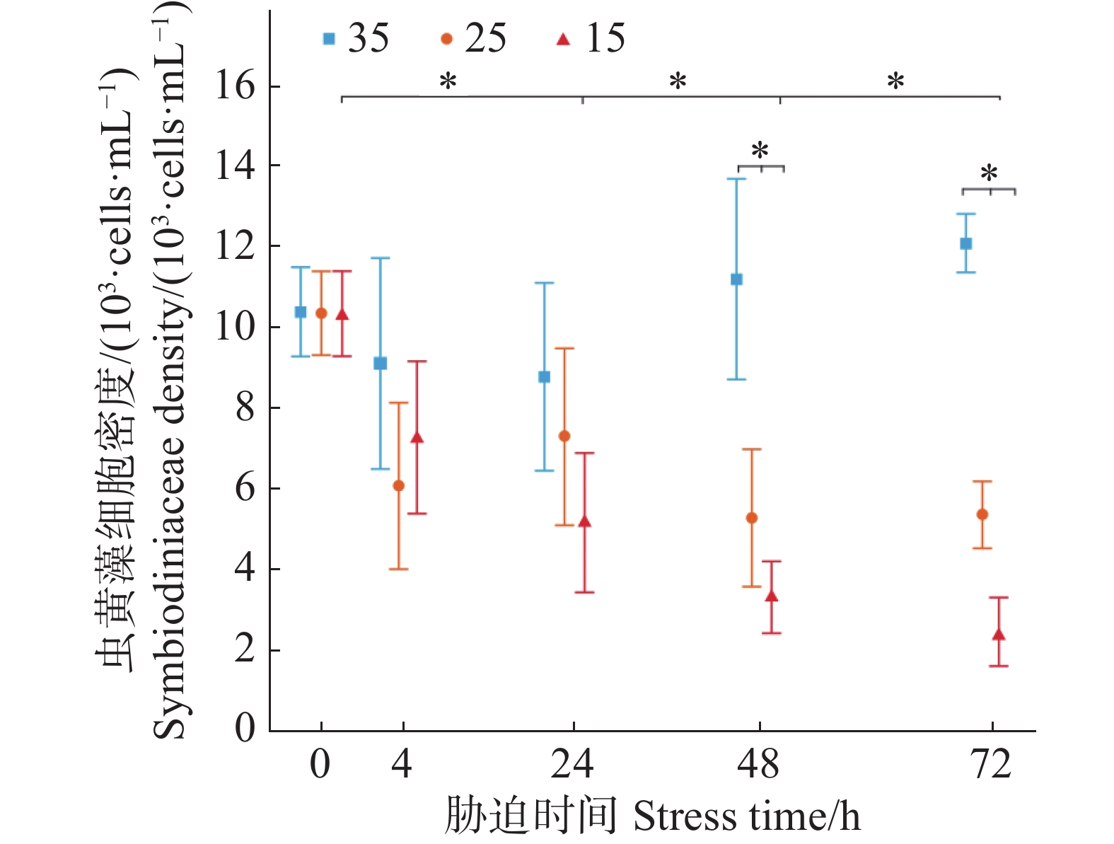 为了探究虫黄藻(Effrenium voratum)在低盐胁迫条件下的生理变化,以离体培养的虫黄藻为对象,对虫黄藻进行高通量测序获得其相对丰度,开展低盐胁迫实验,研究低盐环境对E. voratum的生长状况、单个虫黄藻Chl a浓度、超氧化物歧化酶(SOD)和过氧化氢酶(CAT)活力的生理影响。结果显示:1)35盐度下,E. voratum的细胞密度稳定增长,表明其生长状态良好;25的低盐胁迫下,其生长受抑制但仍能维持生存。15的低盐胁迫下,其细胞密度在48 h后显著下降,呈负增长趋势,表明其生长受到严重抑制。2)15的低盐胁迫下,E. voratum的单个虫黄藻叶绿素a浓度在4 h后持续下降,表明其光合作用能力受到显著抑制,趋势明显。3)25和15的低盐胁迫下,E. voratum的SOD活性和CAT活性在4 h内有所上升,但在24 h后持续下降,表明其抗氧化能力初期有所增强,但随胁迫时间的延长,抗氧化能力逐渐减弱。