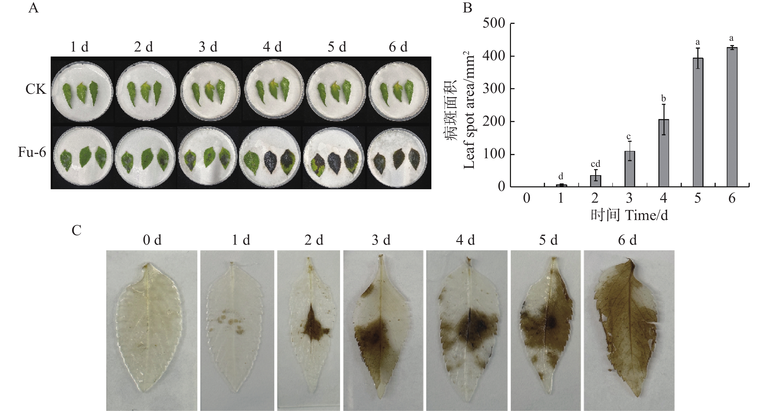 白花鬼针草(Bidens pilosa )是华南地区广泛分布的入侵性杂草,也是多种旱地作物的伴生植物之一,同时也是一些广谱性病原菌的中间携带者。本研究发现一种叶斑病在白花鬼针草种群中发生,为进一步了解其致病原因,采用组织分离法对病叶进行病原菌分离,离体叶片接种法对病菌进行致病性测定,并通过形态学观察,结合rDNA-ITS和tef1序列联合构建系统发育树明确病原种类,初步探究不同温度、光照、培养基、pH、碳源、氮源等对病原菌菌落生长的影响。结果表明,该病原菌为可可毛色二孢(Lasiodiplodia theobromae),可致白花鬼针草叶片枯萎和腐烂,适宜该菌株菌落生长的温度为28 ℃、pH6,马铃薯葡萄糖琼脂培养基(PDA)、蔗糖、硝酸钠分别是其菌落生长的最适培养基、碳源和氮源。