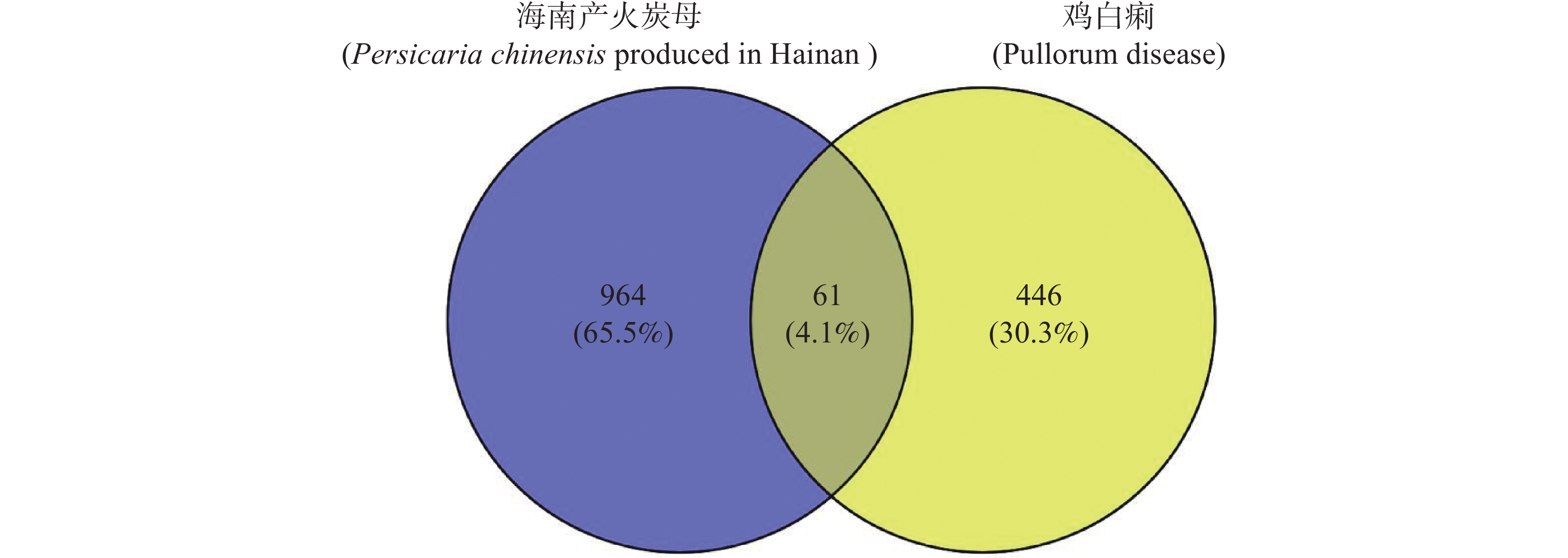 为了探究海南产火炭母(Polygonum chinense)抗鸡白痢的可能性和潜在分子机制,通过网络药理学筛选海南产火炭母核心活性成分和核心靶点并进行分子对接验证,同时利用四因素三水平L9(34)正交试验和牛津杯抑菌试验确定海南产火炭母最佳提取条件,并检测其最小抑菌浓度(MIC)和最小杀菌浓度(MBC)。结果表明,海南产火炭母活性成分与鸡白痢有61个交集靶点。从GO功能分析中获得45个生物过程、15个细胞组分和12个分子功能,KEGG通路富集到18条信号通路。分子对接结果显示,5种核心活性成分和5个核心靶点的结合自由能均小于−5.0 kcal·mol−1。正交试验结果表明,海南产火炭母最佳提取条件为料液比1∶60,70 ℃提取45 min,提取2次,其MIC和MBC相同,均为128 g·L−1。综上所述,海南产火炭母可能通过槲皮素、山柰酚等多种活性成分调控MMP9、PPARG等多个靶点,从而影响MAPK、Toll样受体信号通路等多条途径发挥抗鸡白痢作用。现已证明,海南产火炭母以黄酮类成分为主,多成分协同效应为辅起抗鸡白痢作用。