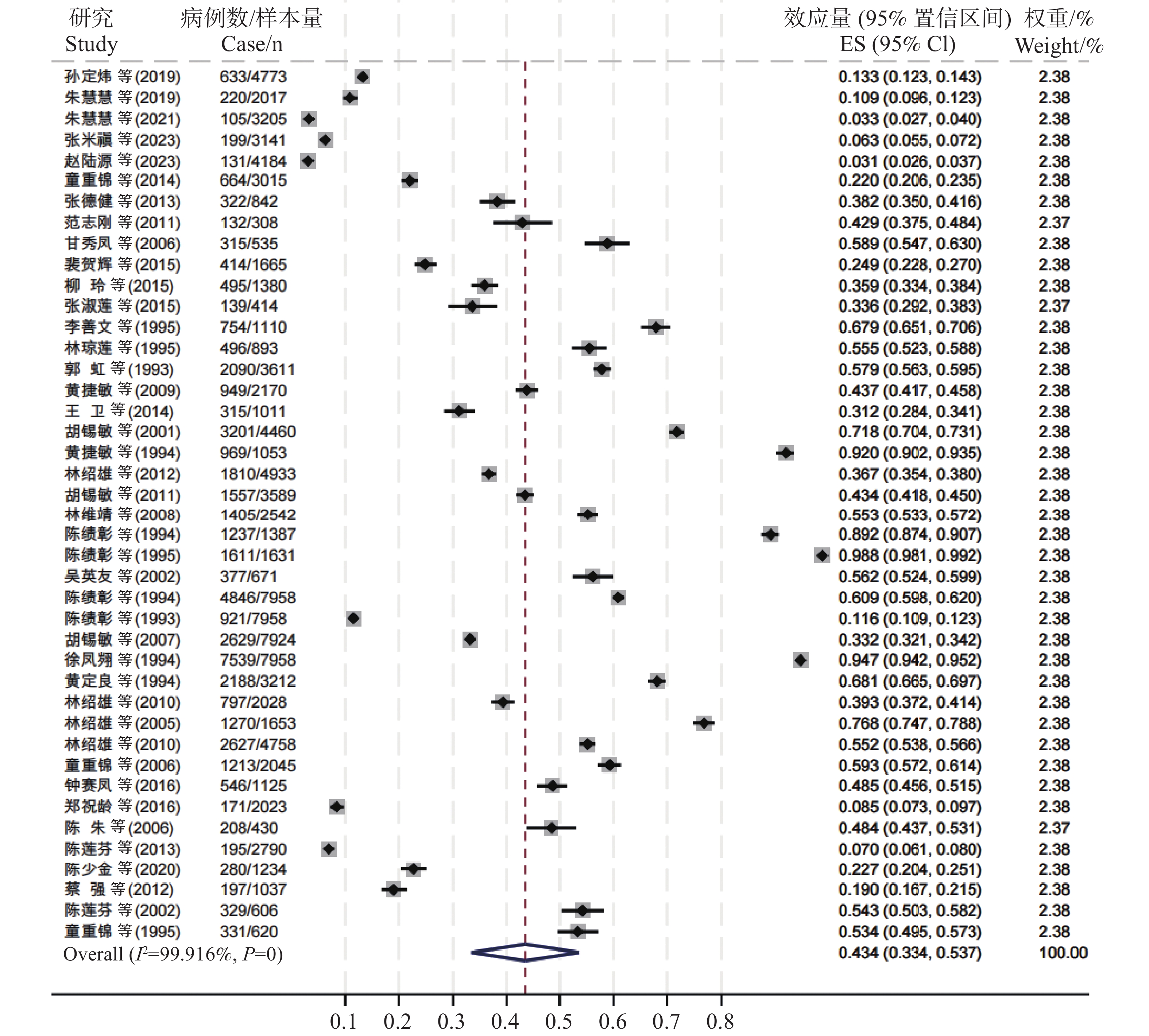 为了给海南省人群寄生虫病的防控提供理论依据,本研究系统评估并分析了海南省人群主要肠道寄生虫的感染情况。通过检索中国知网、万方数据知识服务平台、维普中文科技期刊数据库及 Web of Science、PubMed 等数据库,收集关于海南省人群肠道寄生虫感染情况的研究。经筛选、数据提取和质量评价后,运用 RevMan 5.3 软件进行 Meta 分析。纳入符合标准的研究 42 项,涉及总人数 109 899 人,肠道寄生虫总感染率为 43.4%(95% CI:33.4~53.7)。亚组分析发现,不同地区感染率存在显著差异,其中,昌江县感染率最高(70.4%,95% CI:68.8~72.0),白沙县最低(22.0%,95% CI:20.6~23.5)。不同虫种感染率也有所不同,原虫感染率最低,仅为 8.6%(95% CI:8.1~9.1),蛲虫感染率最高,高达 41.3%(95% CI:40.7~41.9)。此外,县域地区人群的感染率(53.5%,95% CI:41.7~65.1)显著高于城市地区(39.5%,95% CI:30.4~49.0)。时间趋势分析显示,2000 年前人群感染率最高(71.0%),2011 年后降至 21.7%。年龄分析表明,儿童组(0~14 岁)蛲虫感染率最高(37.3%),而钩虫感染率随人群年龄增长逐渐上升,老年组钩虫感染率达 41.5%。评估结果显示,海南省人群主要肠道寄生虫感染率处于较高水平,且存在明显的地区、虫种和时间差异,需针对高发地区和重点人群实施差异化防控策略,加强卫生基础设施建设和健康宣教,以降低感染风险,保障公众健康。