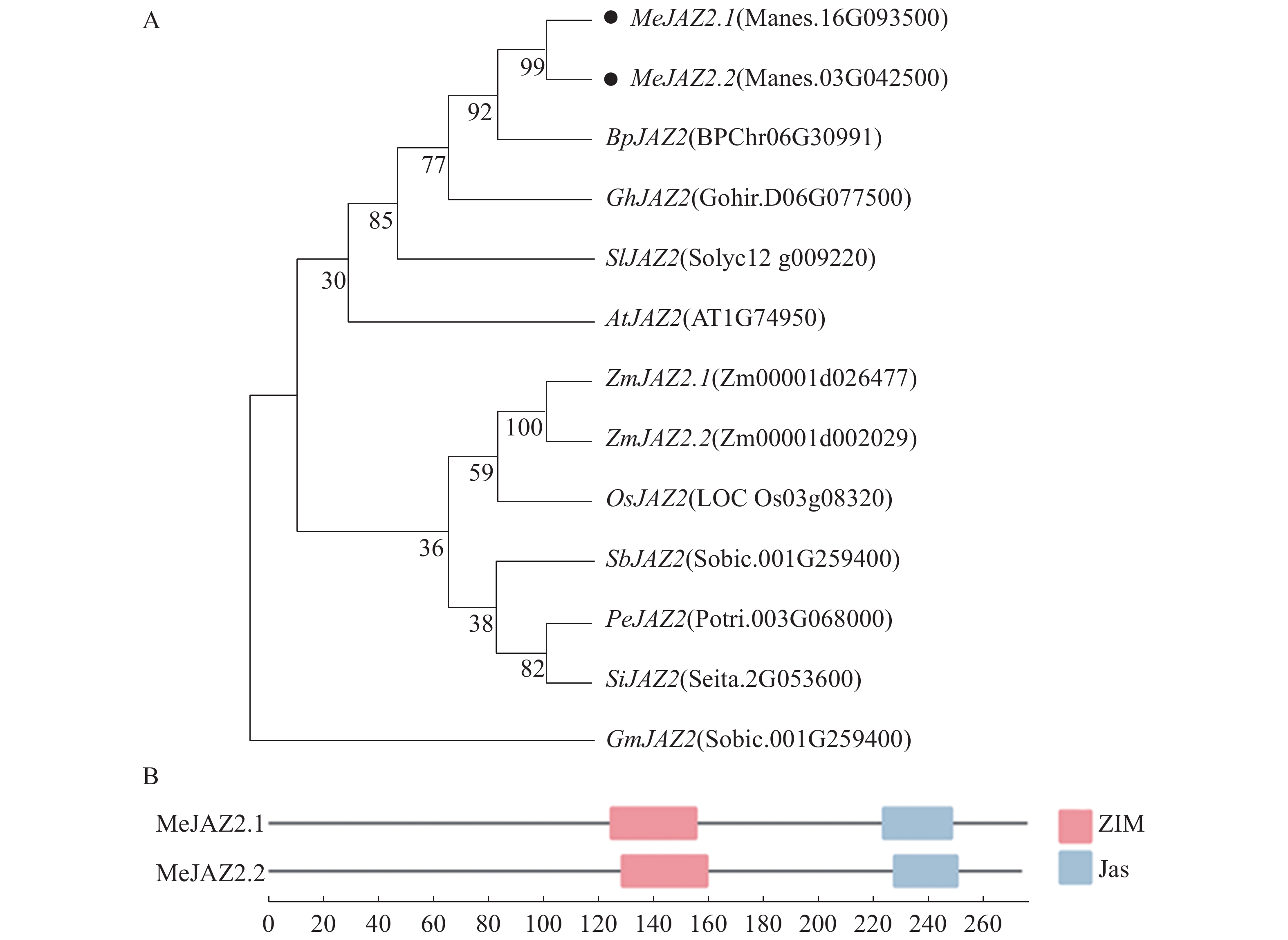 木薯(Manihot esculenta)作为热区重要的粮食作物,其产量受盐胁迫影响,粮食安全无法得到保障。JAZ(jasmonate ZIM-domain, JAZ)蛋白作为茉莉酸信号通路中的重要组成部分,参与调控多种作物对盐胁迫的抗性。为探究JAZ蛋白是否调控木薯抗盐胁迫及其中的调控机制。本研究通过生物信息学筛选到2个同源基因MeJAZ2.1和MeJAZ2.2,进化树和保守结构域分析发现均含有ZIM和Jas两个保守结构域,都属于JAZ基因家族。进一步研究发现,MeJAZ2.2在响应木薯盐胁迫中表达量变化更为明显。与野生型相比,MeJAZ2.2抑制木薯植株对盐胁迫的敏感性升高,这表明MeJAZ2.2可能正调控木薯对盐胁迫的抗性。本研究还构建了pGADT7-MeJAZ2.2诱饵载体并通过酵母双杂交实验发现其不存在自激活活性,并进一步筛选到3个MeJAZ2.2的候选互作蛋白,包括谷氨酰胺合成酶(GLUTAMINE SYNTHETASE)、泛素 3(UBIQUITIN 3)和FRIGIDA-LIKE蛋白(FRIGIDA-LIKE PROTEIN)。为进一步解析JAZ蛋白在木薯抗盐胁迫中的功能及其分子机制提供前期基础。
