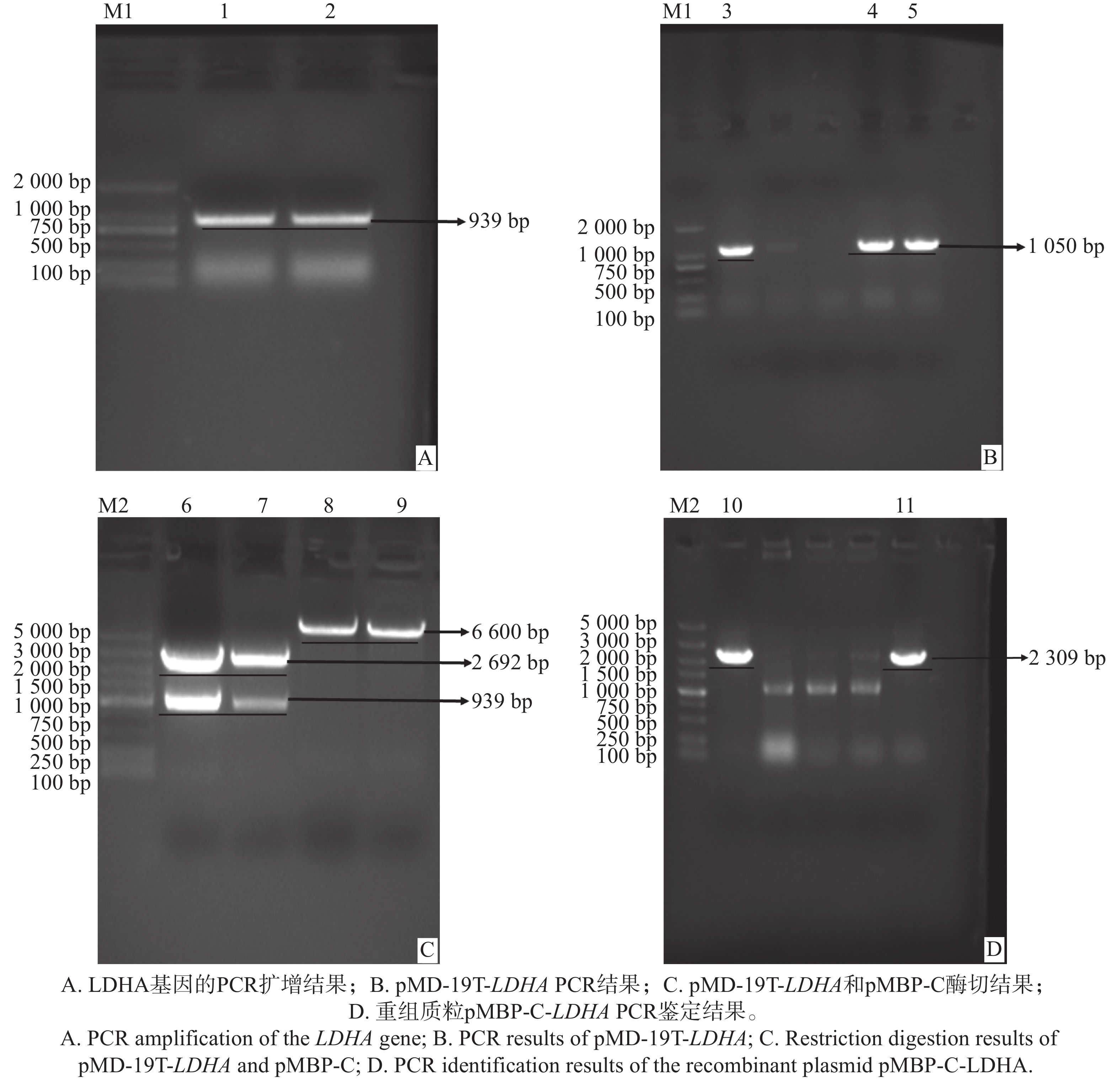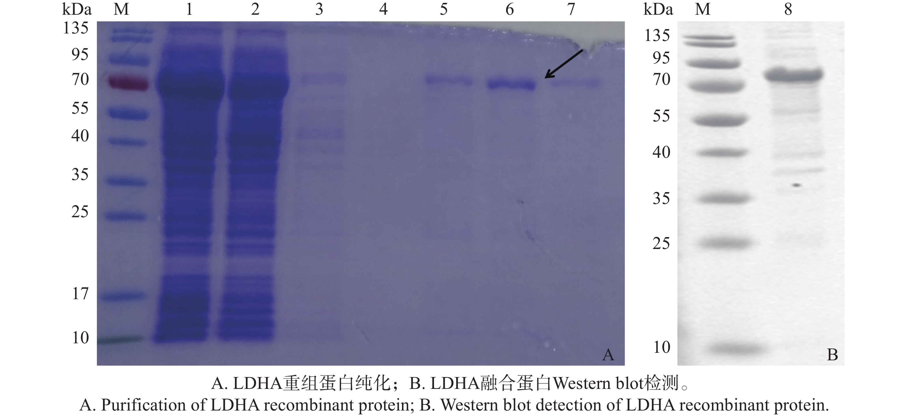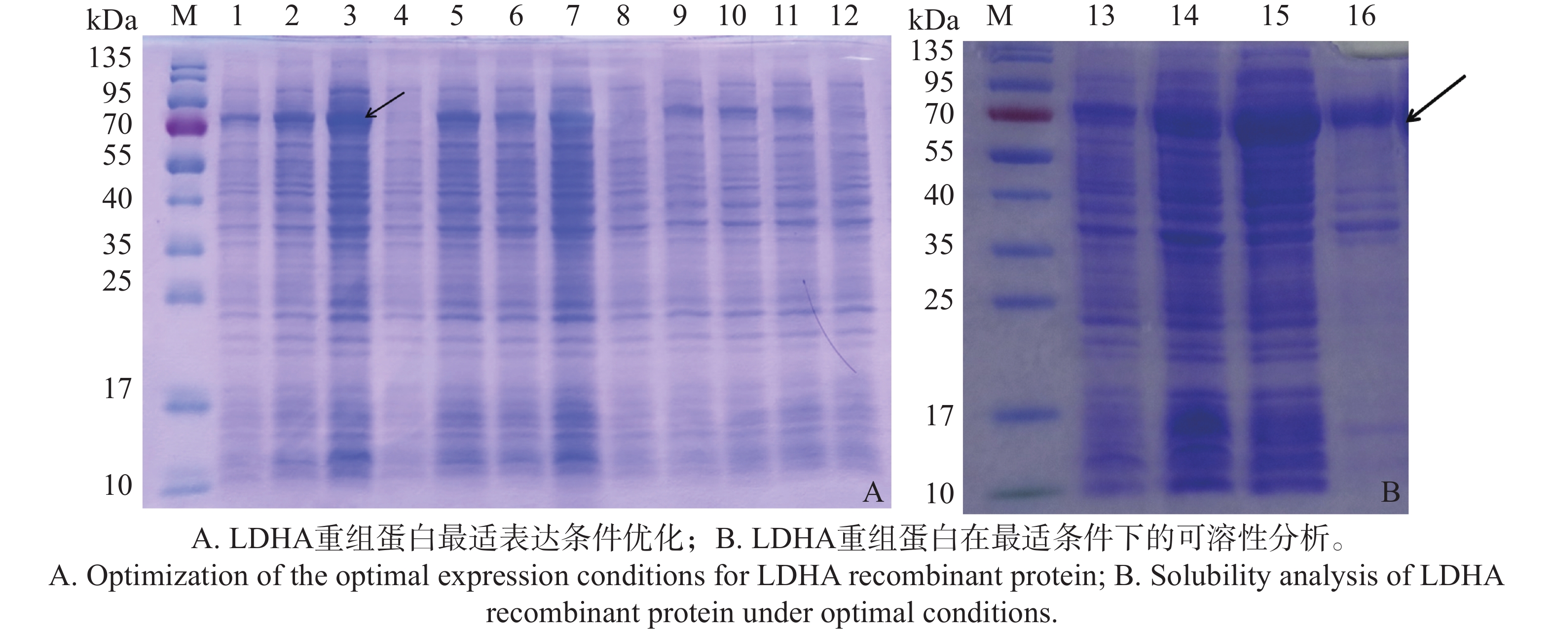 为了探讨三角褐指藻(Phaeodactylum tricornutum Bohlin)中乳酸代谢的关键酶——乳酸脱氢酶(ptLDHA)上的乙酰化修饰位点及其在乳酰化和乙酰化交互作用中的潜在作用,以三角褐指藻cDNA为模板克隆了ptLDHA基因序列,并构建了原核表达载体pMBP-C-LDHA,随后将其转入大肠杆菌BL21(DE3)中进行诱导表达。经优化,在 16 ℃、0.2 mmol·L−1 IPTG 诱导 24 h 条件下,ptLDHA蛋白成功表达且主要为可溶性蛋白。利用His标签进行融合蛋白的纯化,并用ptLDHA多克隆抗体进行 Western blot 鉴定,在约 78 kDa处获得单一蛋白条带,证实纯化蛋白为ptLDHA。本研究成功实现了ptLDHA在原核细胞中的表达与纯化,为后续构建乙酰化修饰位点的定点突变并探究修饰与去修饰状态对酶活性的影响奠定了基础。