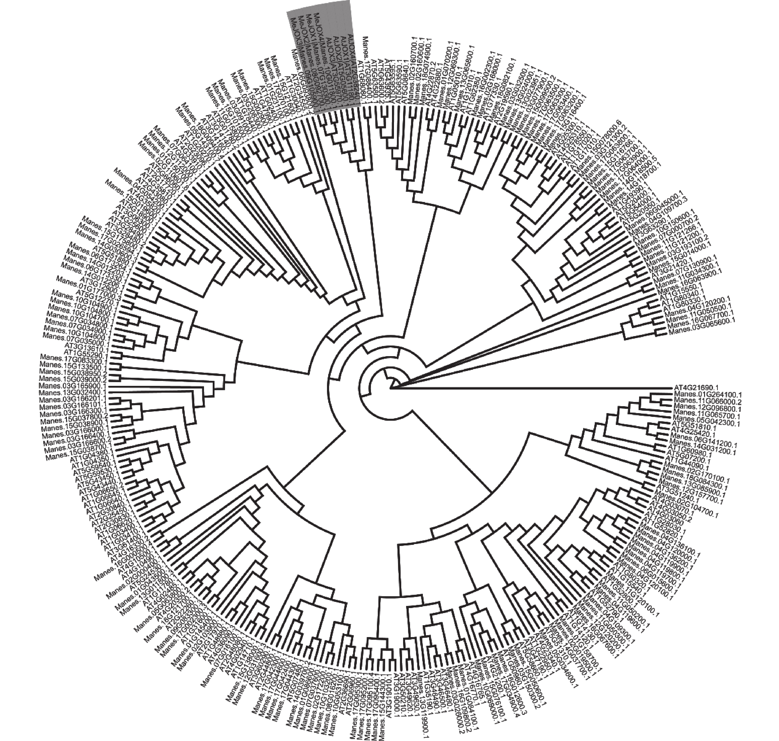 为了探究茉莉酸氧化酶JOX家族基因在木薯(Manihot esculenta)生长发育及抵抗逆境胁迫中的作用,本研究通过生物信息学手段在木薯全基因组中对MeJOXs家族成员进行鉴定,并对其基因结构、启动子顺式作用元件、进化关系、蛋白理化性质及相关表达模式等进行了分析。结果表明,木薯基因组中共有4个MeJOXs家族基因,每个成员间具有相似的基因结构、保守基序及蛋白结构域,成员间至少具有68%的蛋白同源性,MeJOX1与MeJOX4、MeJOX2与MeJOX3两两成员间最为相似。启动子顺式作用元件分析表明,MeJOXs基因启动子区含有大量光照响应元件,此外每个成员还含有数量不等的激素响应等元件;系统进化分析表明,MeJOXs基因与双子叶植物的JOXs基因亲缘关系更近;转录组分析结果表明,除MeJOX2基因在不同木薯组织中几乎不表达外,其余基因在茎、叶、叶中脉、须根等组织中均有不同程度的表达;MeJOXs在不同木薯种质中均受MeJA诱导表达,不同种质中诱导表达程度不同,MeJOX3受诱导表达最明显;Xpm病原菌侵染下MeJOX1/3/4均能及时响应,但响应模式存在明显不同,MeJOX1/3表达上调,而MeJOX4呈下调表达趋势,MeJOX2几乎不响应。