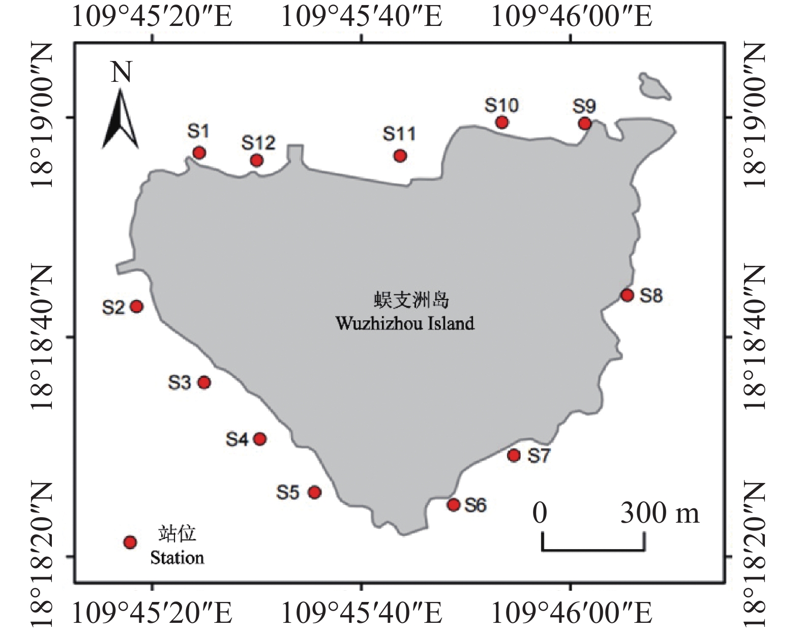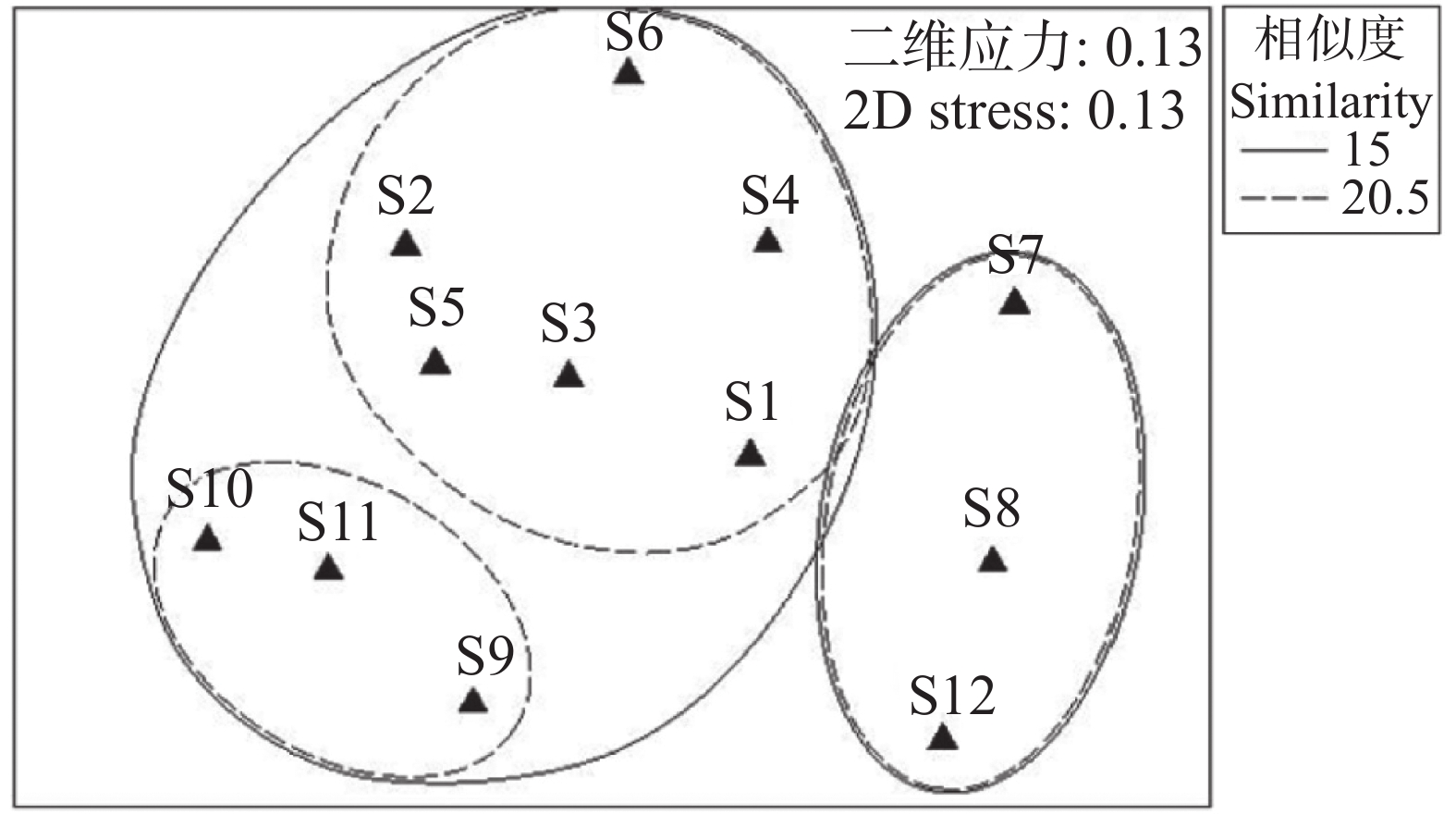 为探究三亚蜈支洲岛海洋牧场大型海藻种类和群落结构特征,于2023年4月至2023年6月对三亚蜈支洲岛海洋牧场区12个不同站位进行采样调查。结果表明,在三亚蜈支洲岛海洋牧场的生物调查中,采集到29种大型海藻,其中红藻门17种,绿藻门9种,褐藻门3种,优势种为脆叉节藻(Amphiroa fragilissima)和喇叭藻(Turbinaria ornata)。大型海藻的平均生物量为(2.40±1.89) g·m−2。不同种类海藻的平均碳(C)、氮(N)含量分别为18.80%、0.98%,不同种类海藻的平均C/N比值为24.04±13.61。大型海藻群落的物种多样性指数(H′)、物种丰富度指数(D)、物种均匀度指数(J)平均值分别为1.28±0.59、5.60±4.61、0.87±0.70。聚类与排序结果表明,12个站位被分为3个聚类组,组间SIMPER与ANOSIM分析结果表明3个聚类组之间的大型海藻群落结构有显著差异,群落结构基本分离。上述研究结果表明,三亚蜈支洲岛海洋牧场大型海藻种类丰富,但部分特定的优势种藻类和生境之间的差异导致不同聚类组间的群落结构有显著差异。