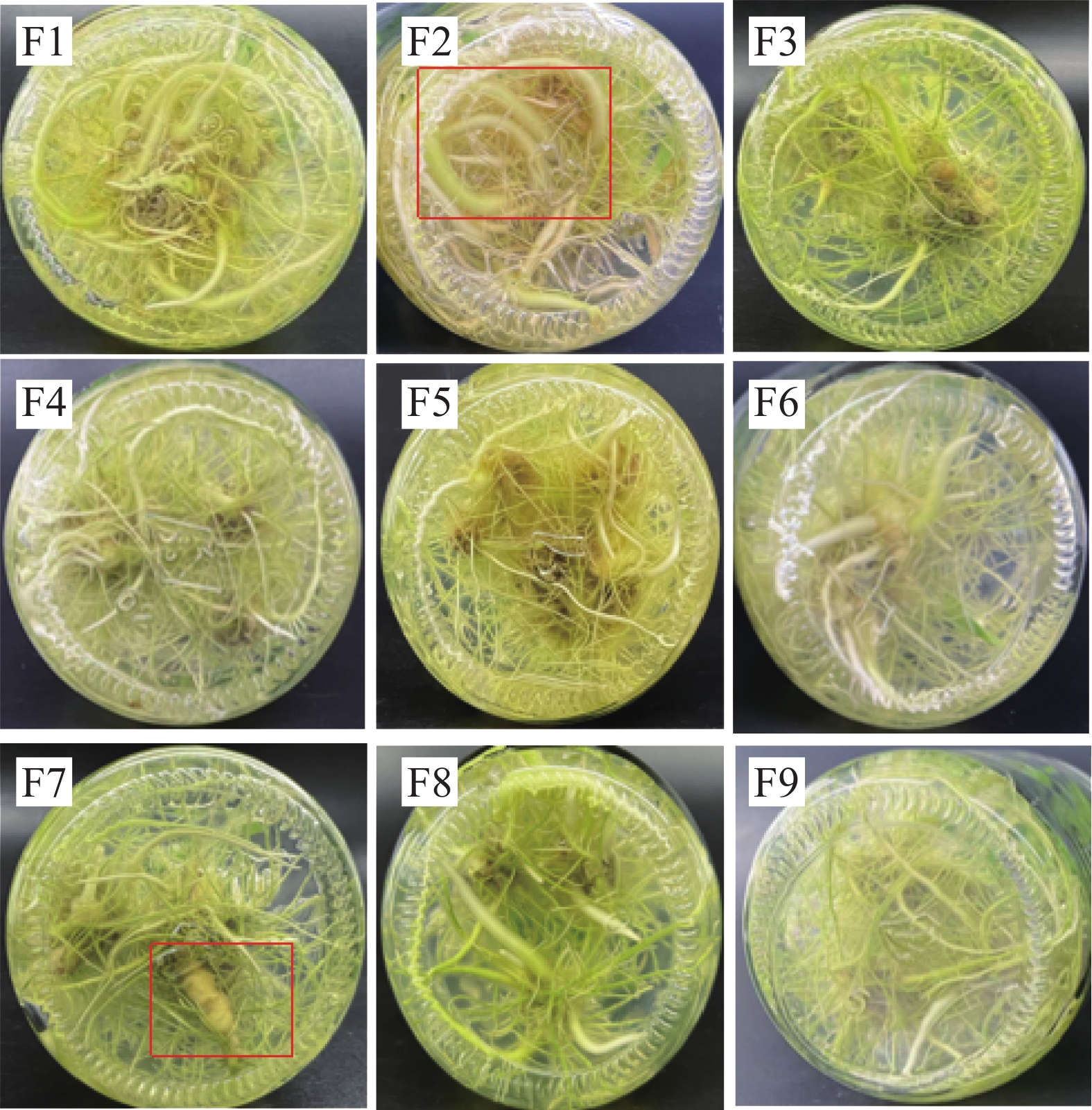 为了提高温郁金(Curcuma wenyujin)种苗繁育效率,本试验以温郁金离体生根培养基1/2MS + NAA 0.5 mg·L−1为对照,通过添加不同质量浓度和配比的广谱型植物生长调节剂氯化胆碱(choline chloride,CC)和复硝酚钠(compound sodium nitrophenolate,CSN),诱导温郁金组培苗的微根茎分化,并观测组培苗移栽后的生长情况。结果表明,复合添加CC 1.0 mg·L−1和CSN 2.0 mg·L−1时,微根茎诱导形成明显,诱导率达62%,而复合添加CC 3.0 mg·L−1和CSN 1.0 mg·L−1时,诱导率为46%,但微根茎膨大增粗最明显,横切直径约6.8 mm,两者间微根茎长无显著差异。具微根茎的组培生根苗移栽全部成活,与对照组培生根苗相比,其存活率、生长速率、分蘖数、新增叶片数及块根和根茎的质量分别增加了36.4%、112.5%、83.0%、103.9%和83.2%。
