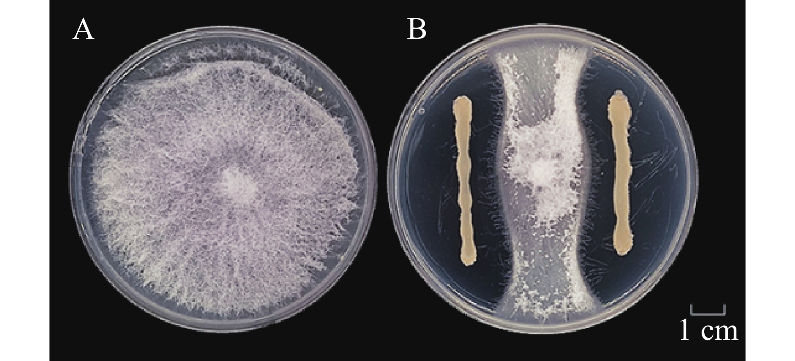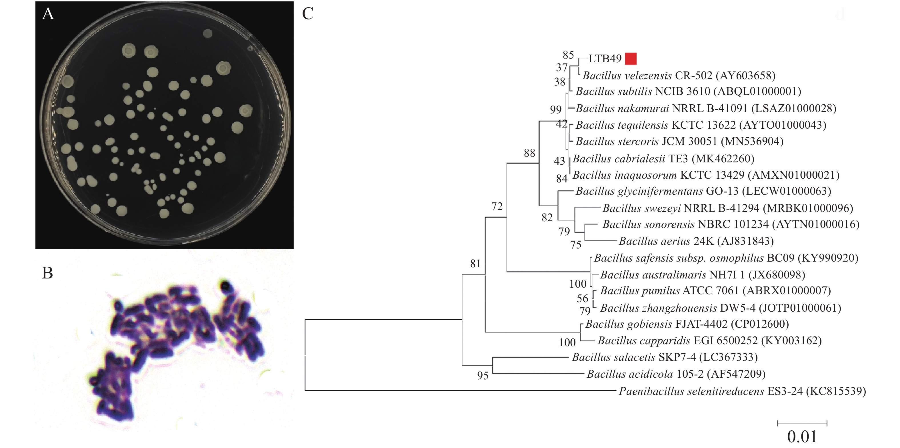 为筛选高效防治黄瓜枯萎病的生防细菌菌株,本研究利用梯度稀释和平板对峙法从黄瓜枯萎病发病根际土壤中分离筛选出一株具有较强拮抗活性的芽孢杆菌LTB49(拮抗率55.26%)。通过形态学、生理生化反应及分子生物学将该菌株鉴定为贝莱斯芽孢杆菌Bacillus velezensis。LTB49发酵滤液10倍稀释液对黄瓜枯萎病病菌菌丝生长具有较强的抑制作用,抑制率达42.16%,对病菌孢子萌发的抑制率高达90.82%。盆栽结果显示,LTB49对黄瓜枯萎病具有良好的防效(43.37%),与商品菌剂解淀粉芽孢杆菌QST713防效(50.60%)相比没有显著性差异。进一步研究表明,该菌株通过诱导超氧化物歧化酶和过氧化物酶活性上升抵御枯萎病,并能抑制镰刀菌对黄瓜植株生长的矮化影响。上述结果显示,贝莱斯芽孢杆菌Bacillus velezensis LTB49在防治黄瓜枯萎病方面具有较高的应用潜力。