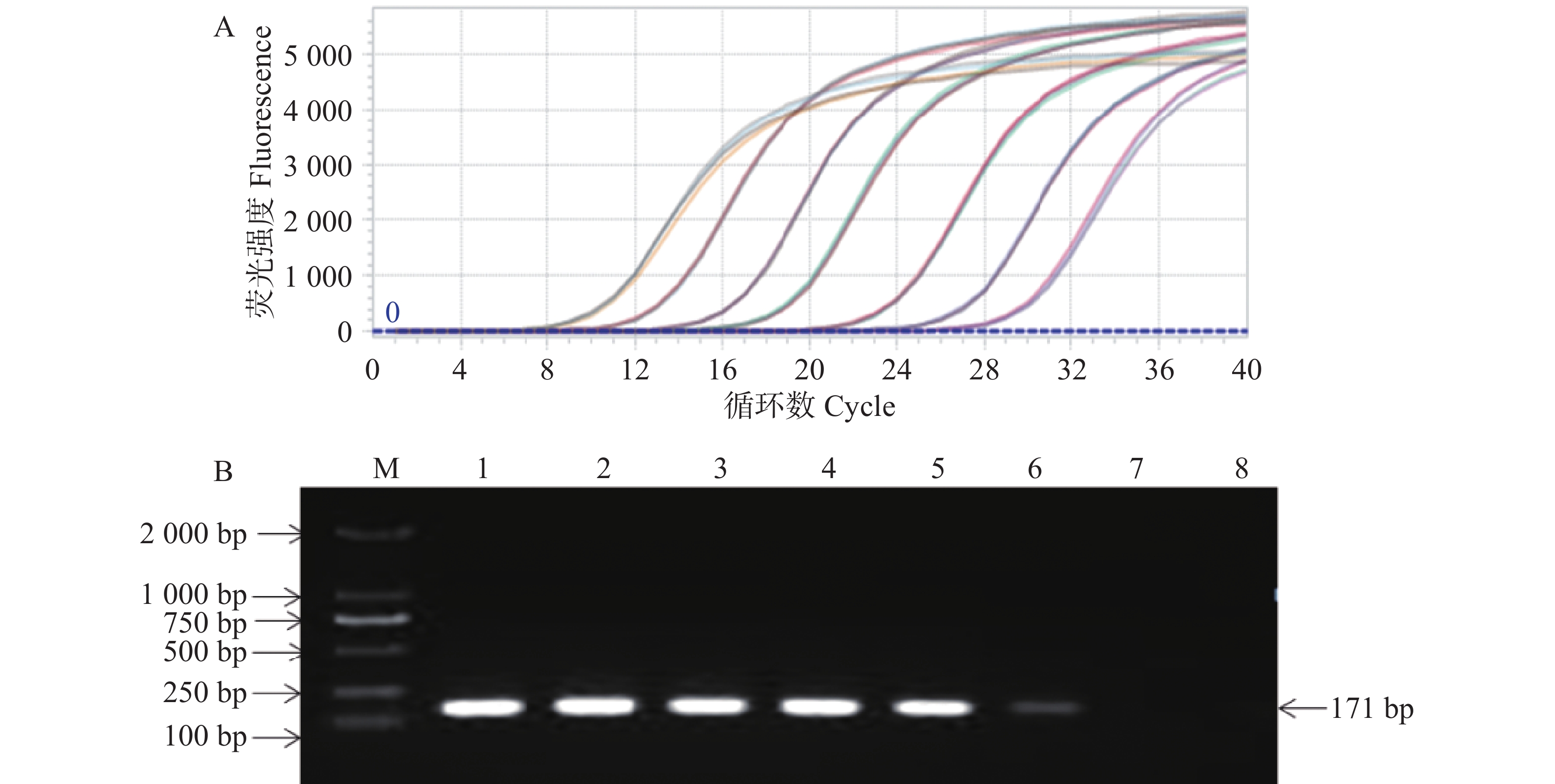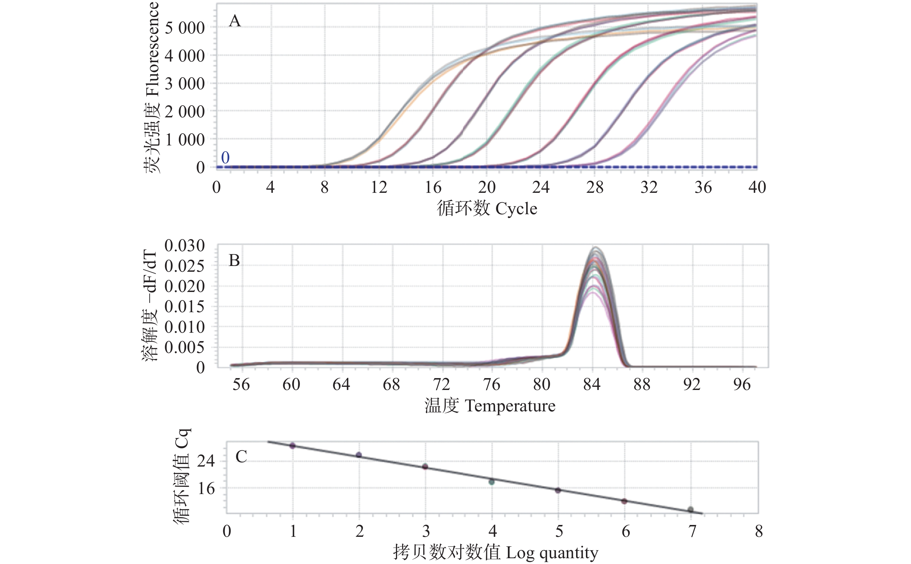 为建立甘蔗杆状病毒(sugarcane bacilliform virus,SCBV)的绝对荧光定量PCR检测方法,并测定甘蔗不同组织部位中SCBV载量,本研究从SCBV基因组保守区(SCBV-ORF1)设计特异性扩增引物,构建重组质粒pMD19T-SCBV-P1作为阳性质粒标准品,以其为模板建立SCBV 绝对荧光定量 PCR 检测方法。测试该方法的灵敏性、特异性和稳定性,并用该方法测定甘蔗种质不同组织中SCBV载量。结果表明,将含有SCBV基因组序列的重组质粒10倍比稀释成标准品,以其为模板进行荧光定量PCR,获得标准曲线y = −3.339 7 × log(x) + 32.05,相关系数 r2=0.999;表明Cq值与标准品浓度拷贝数的对数呈线性关系。研究建立的绝对荧光定量PCR方法展现出高灵敏度特征,其检测下限可达到7 copies·μL−1,相较于常规 PCR检测法,该方法的灵敏度提高了近100倍。该方法特异性高,可特异检测SCBV;重复性良好,批内和批间的变异系数均在0.11% ~ 0.90%。甘蔗不同组织部位SCBV累积水平存在显著差异,其中正4叶SCBV载量显著高于其他组织部位(P<0.05)。本研究建立了能灵敏特异检测SCBV的绝对荧光定量PCR方法,为SCBV的诊断提供一种高效的定量检测方法,明确了甘蔗中SCBV检测的最佳采样部位是正4叶。