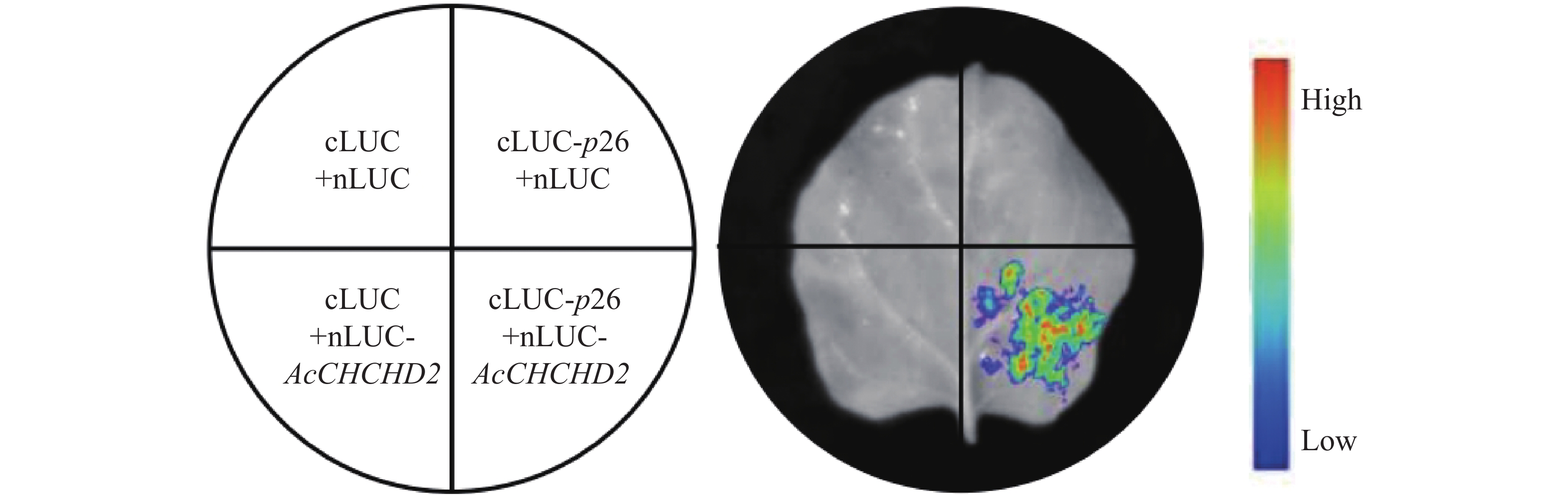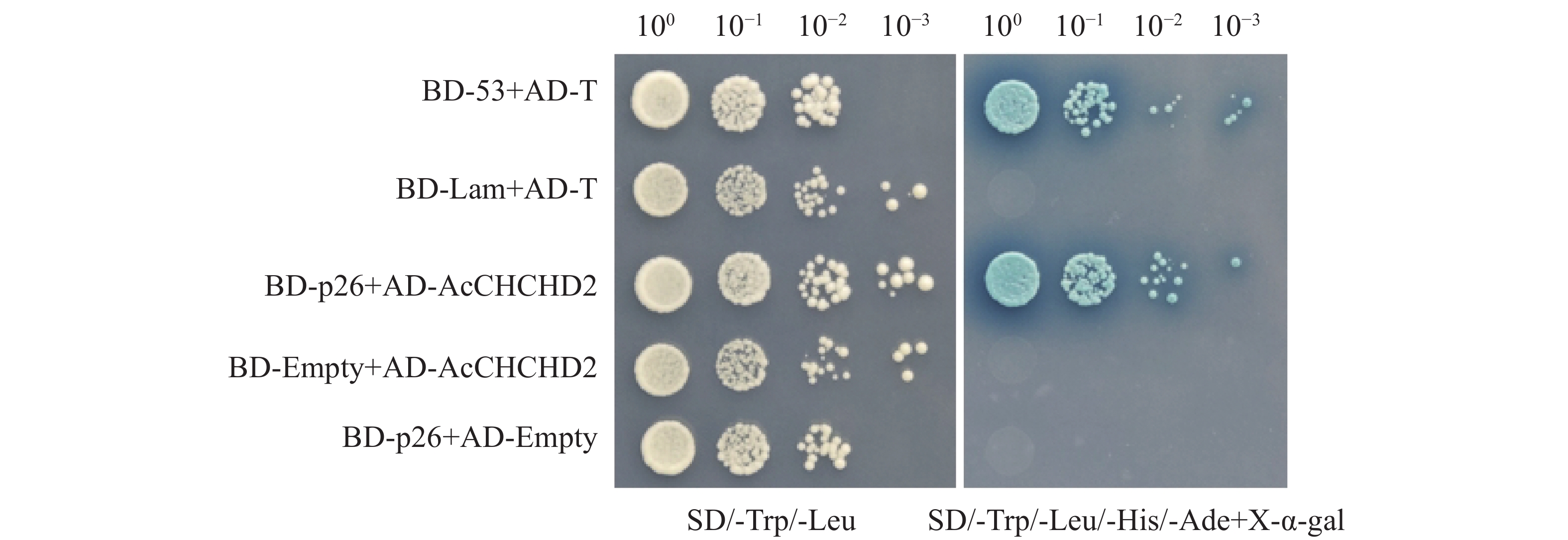 槟榔黄化病(yellow leaf disease,YLD)是严重威胁海南槟榔(Areca catechu L.)产业的病害,其致病因子槟榔黄化相关病毒(areca palm velarivirus 1,APV1)编码的p26蛋白在病毒侵染中发挥关键作用,但是与其宿主相互作用的蛋白还未明确。本研究采用酵母双杂交技术筛选槟榔cDNA文库,以p26为靶标筛选互作因子。成功构建pGBKT7-p26诱饵载体并通过毒性及自激活检测,确认其适用于互作筛选体系。之后通过筛库获得6个候选互作蛋白,包括Ras相关蛋白RABE1c、叶绿体铁蛋白(ferritin-4)、油棕应激蛋白PHOS34和三个未知功能蛋白。经复筛和测序比对,聚焦于含卷曲螺旋结构域的未知功能蛋白——卷曲螺旋结构域蛋白2(CHCHD2)。回转验证表明,p26与CHCHD2在酵母中存在特异性互作。生物信息学分析显示,CHCHD2分子式为C628H1 007N201O198S8,分子质量14.8 kDa,属亲水性不稳定蛋白,二级结构以无规则卷曲为主,亚细胞定位预测定位于叶绿体,无信号肽及跨膜结构域。本研究揭示APV1的p26与宿主CHCHD2的互作关系,为解析p26在病毒侵染中的功能及CHCHD2介导的宿主防御机制提供了理论基础。