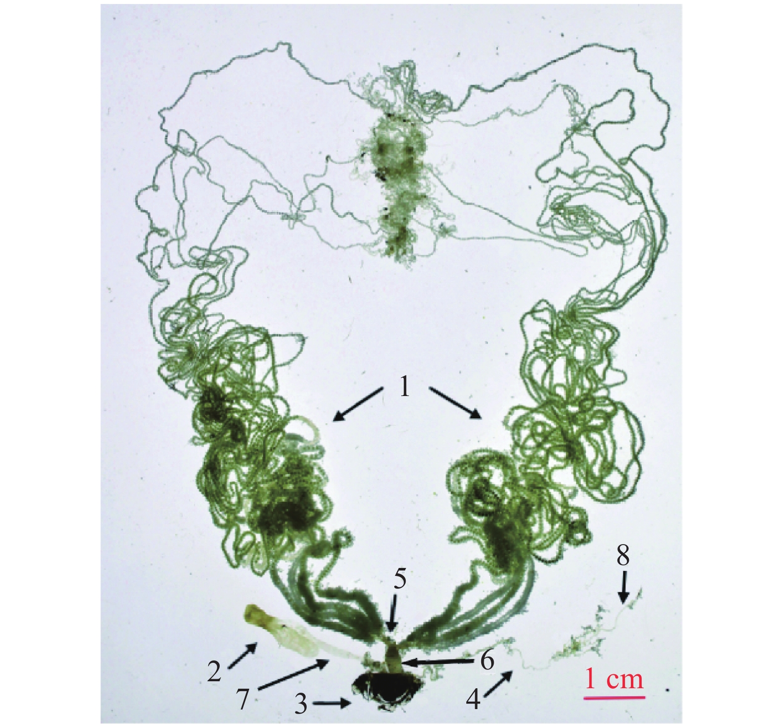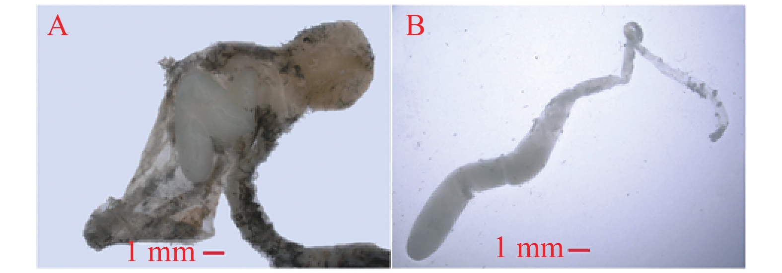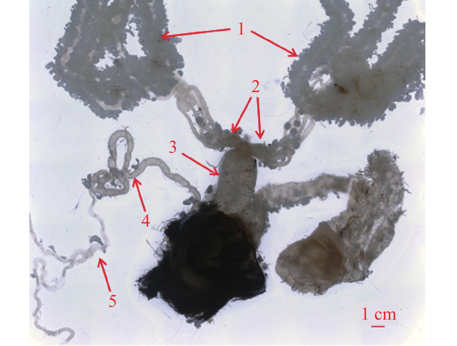 为明确桉蝙蛾雌蛾生殖系统的结构特点及其发育规律,本研究通过对桉蝙蛾雌性成虫生殖系统的解剖、图像采集和结构观察,分析其生殖系统的主要器官及其发育过程。结果显示,桉蝙蛾雌性生殖系统由内生殖器和外生殖器组成,其中外生殖器包括产卵器、交配囊等,内生殖器包括卵巢、输卵管等。随着日龄增长,未交配雌性桉蝙蛾的交配囊、卵巢管、输卵管和受精囊呈现出显著的形态变化;交配后3日龄雌性桉蝙蛾的生殖系统也表现出明显变化,如卵巢管变细、输卵管萎缩、脂肪体减少等。本研究为掌握桉蝙蛾繁殖特性、生物学及发生规律提供了科学依据,有助于进一步研究其生活习性和交配行为。