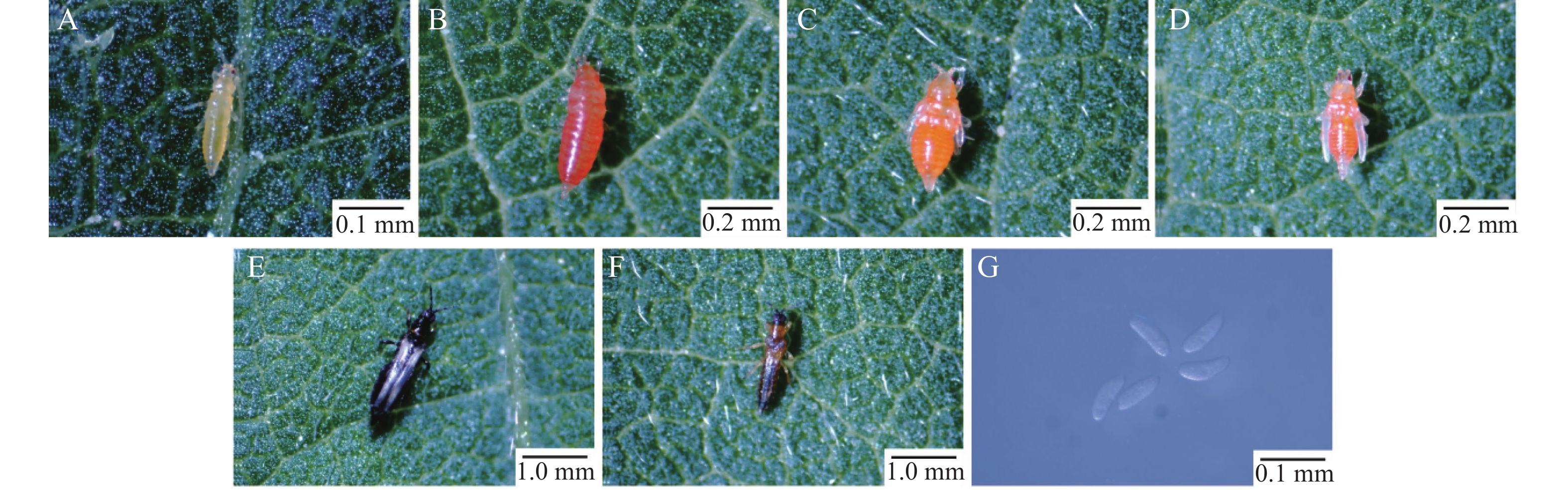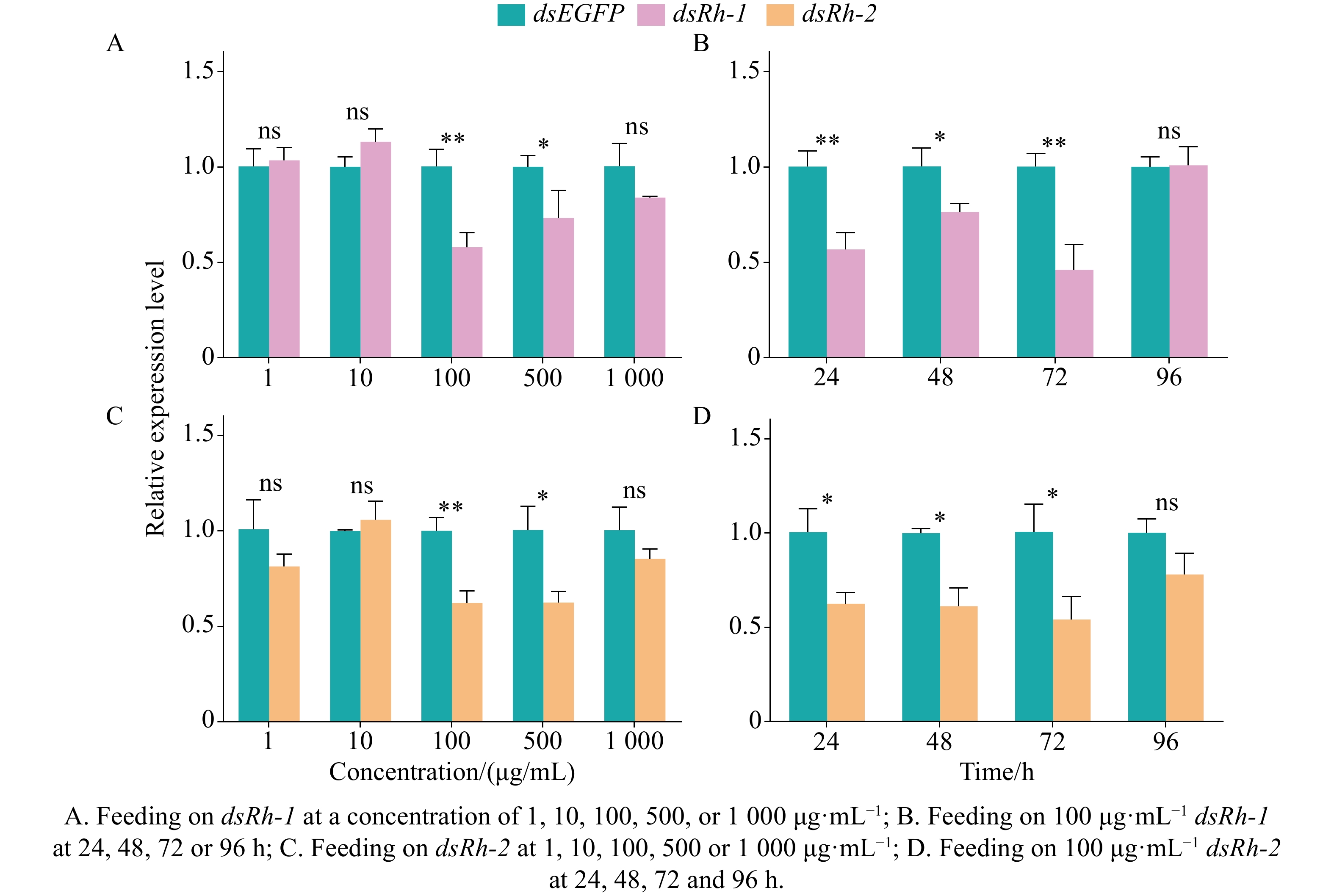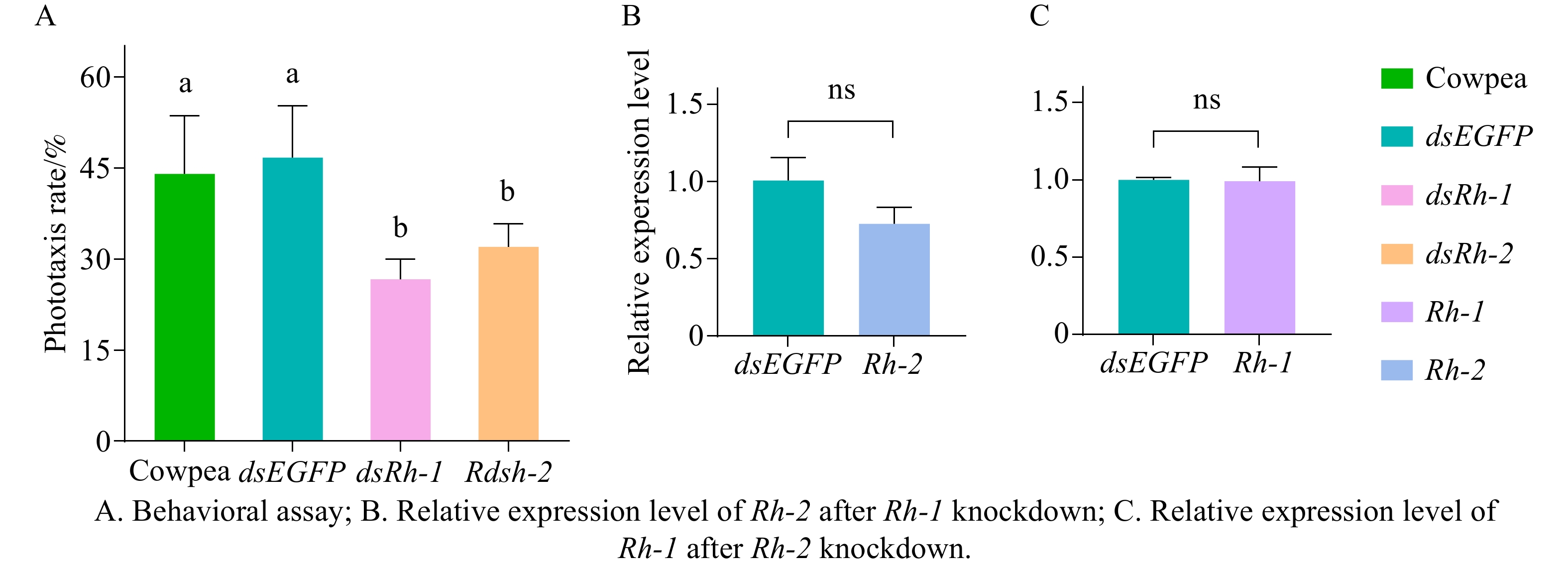 The developmental duration and compound eye characteristics of Megalurothrips usitatus across its life stages were systematically investigated to elucidate the functional roles of opsin genes in M. usitatus. RNA interference (RNAi) was employed to suppress the expression of adult opsin genes Rhodopsin-1 (Rh-1) and Rhodopsin-2 (Rh-2), and the phototactic behavioral responses to 520 nm green light following gene knockdown were quantitatively assessed, along with potential mutual regulatory interactions between Rh-1 and Rh-2. Key findings revealed that compound eyes attained full development exclusively during the adult stage. No significant differences in survival curves (P > 0.05) were observed among adults fed on dsEGFP, dsRh-1, or dsRh-2 at a mass concentration of 100 μg·mL−1 over 24–96 hours. Notably, phototactic choice rates toward green light decreased to 26.67% and 32.00%, respectively at 72 hours after treatment with dsRh-1 and dsRh-2. Gene expression analyses demonstrated no compensatory regulation between Rh-1 and Rh-2, as evidenced by unaltered relative expression levels of Rh-2 following Rh-1 knockdown (P > 0.05), and vice versa. This investigation provides critical empirical data for advancing visual system-based pest management strategies.