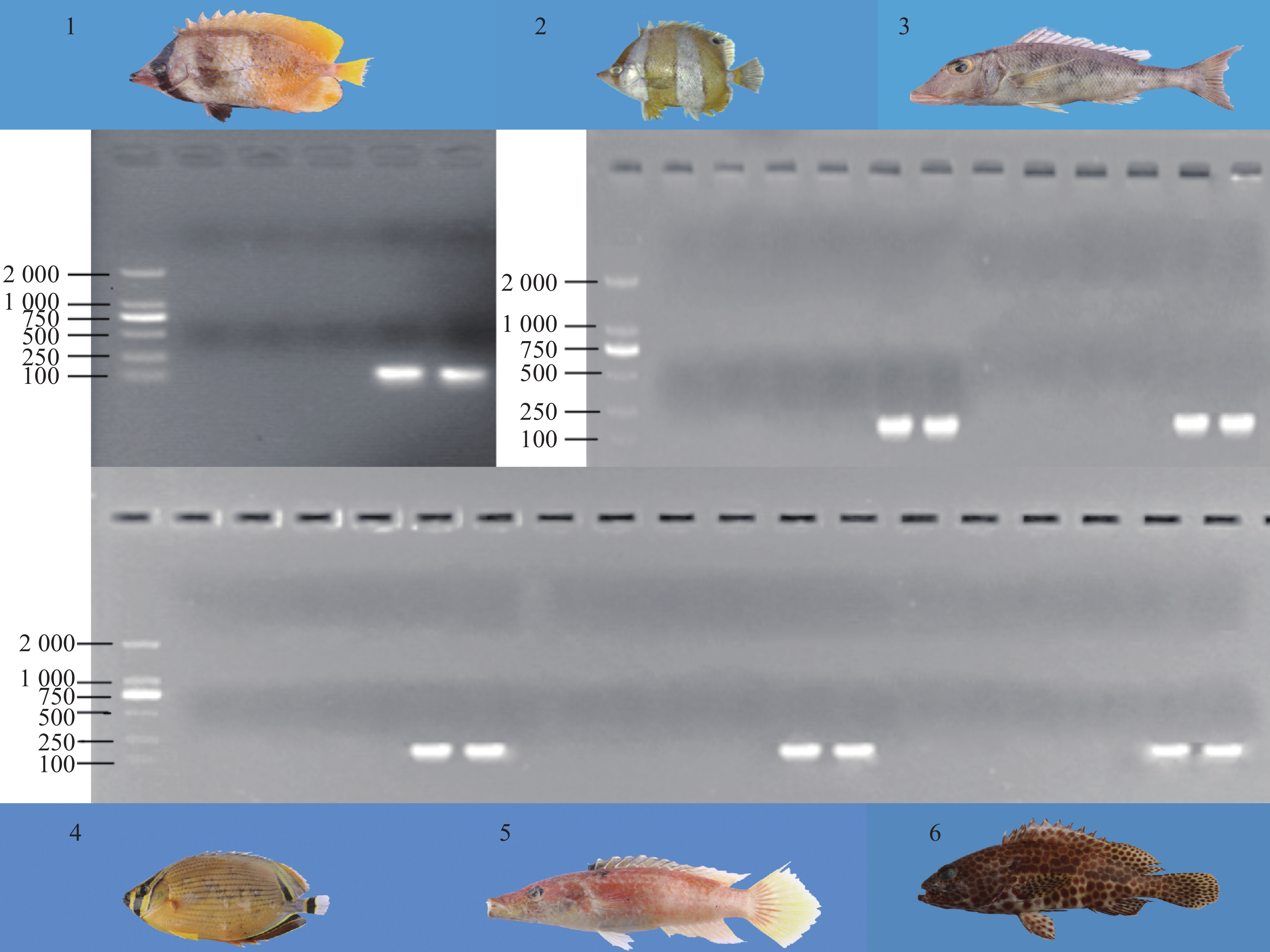 为了解西沙礁区长棘海星(Acanthaster cf. solaris)的潜在鱼类捕食者种类,本研究根据形态学特征与 18S 分子标签鉴定了在西沙礁区 23 个站点采捕(2023 年 4 月)的鱼类样品,并采用PCR 技术检测了鱼类肠道内容物 DNA 中长棘海星线粒体细胞色素 C 氧化酶亚基Ⅰ(mitochondrial cytochrome oxidase subunit Ⅰ , CoTS-mtCOⅠ)的基因片段 。研究结果为1) 330 尾鱼样经鉴定隶属于9 目 24 科 37 属 42 种。2) 在6种鱼类(珠蝴蝶鱼Chaetodon kleinii、三间火箭Chelmon rostratus、弓月蝴蝶鱼Chaetodon lunulatus、红裸颊鲷Lethrinus haematopterus、东方尖唇鱼Oxycheilinus orientalis和蜂巢石斑鱼Epinephelus merra)的肠道内容物 DNA 中扩增到 CoTS-mtCOⅠ 片段。其中,在珠蝴蝶鱼的肠道内容物 DNA 中均检测出 CoTS-mtCOⅠ 基因片段,而其他 5 种鱼类仅部分样品检出。3) 6 种鱼类均为首次报道的长棘海星潜在鱼类捕食者。4) 基于 18S 序列的系统进化树中,珠蝴蝶鱼、三间火箭与弓月蝴蝶鱼先聚到蝴蝶鱼科亚支,再归到刺尾鱼目分支,而红裸颊鲷、东方尖唇鱼与蜂巢石斑鱼均聚到鲈形目分支。本研究结果有助于了解中国西沙珊瑚礁生态系统中长棘海星的潜在鱼类捕食者,以期为防控南海长棘海星暴发提供理论依据与科学指导。
