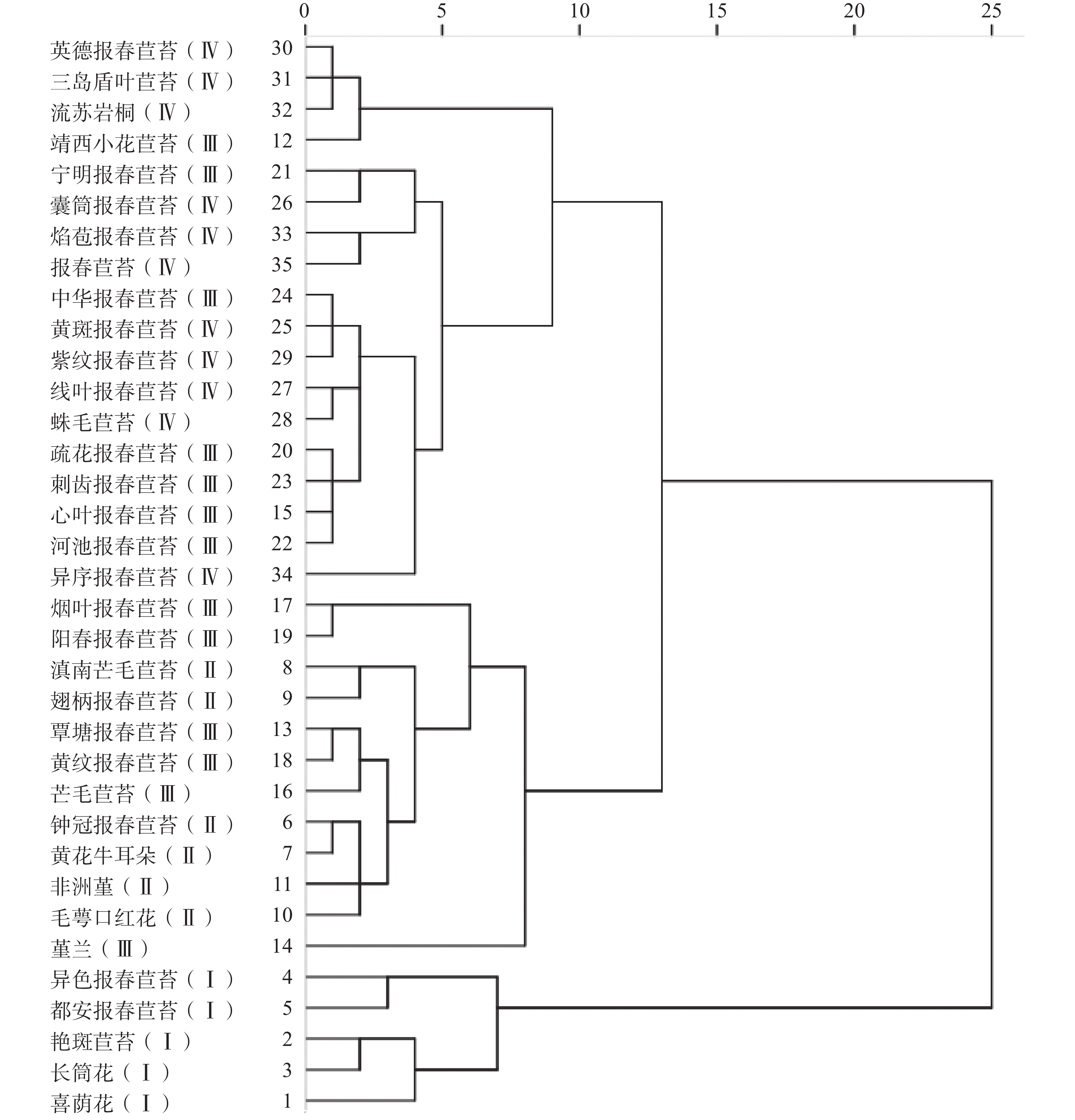 为了科学评价苦苣苔科(Gesneriaceae)植物的观赏性状,以苦苣苔科的35种植物为材料,运用层次分析法构建苦苣苔科植物的综合评价体系,对花、叶、株型特征、栽培表现等4 个方面的15 项具体评价指标进行打分。结果表明,35 种苦苣苔科植物可划分为4 个等级,划分为Ⅰ级的苦苣苔科植物综合得分最高,观赏价值亦最高, 此类植物有5个种归为4个属,分别是喜荫花属喜荫花、花脸苣苔属艳斑苣苔、长筒花属长筒花、报春苣苔属的异色报春苣苔和都安报春苣苔。通过聚类分析可将35种苦苣苔科植物按观赏性状分为5 类,其中划分为第1类的有5种,这与层次分析法评价出的Ⅰ级种类完全一致。该5种在育种和生产上应具有良好的前景,可为中国培育具有自主知识产权的高观赏价值品种奠定基础,促进中国苦苣苔园艺产业的发展壮大。