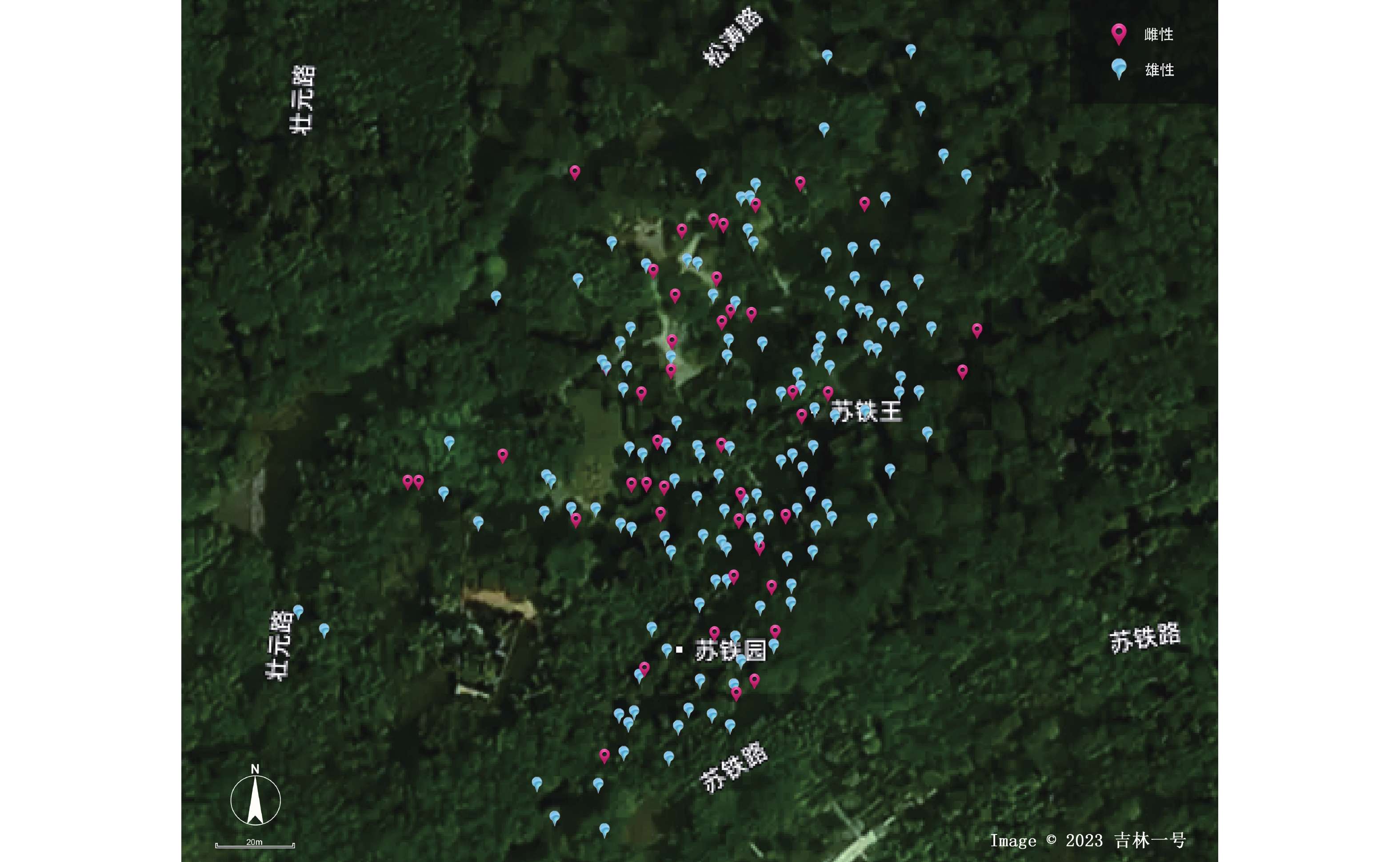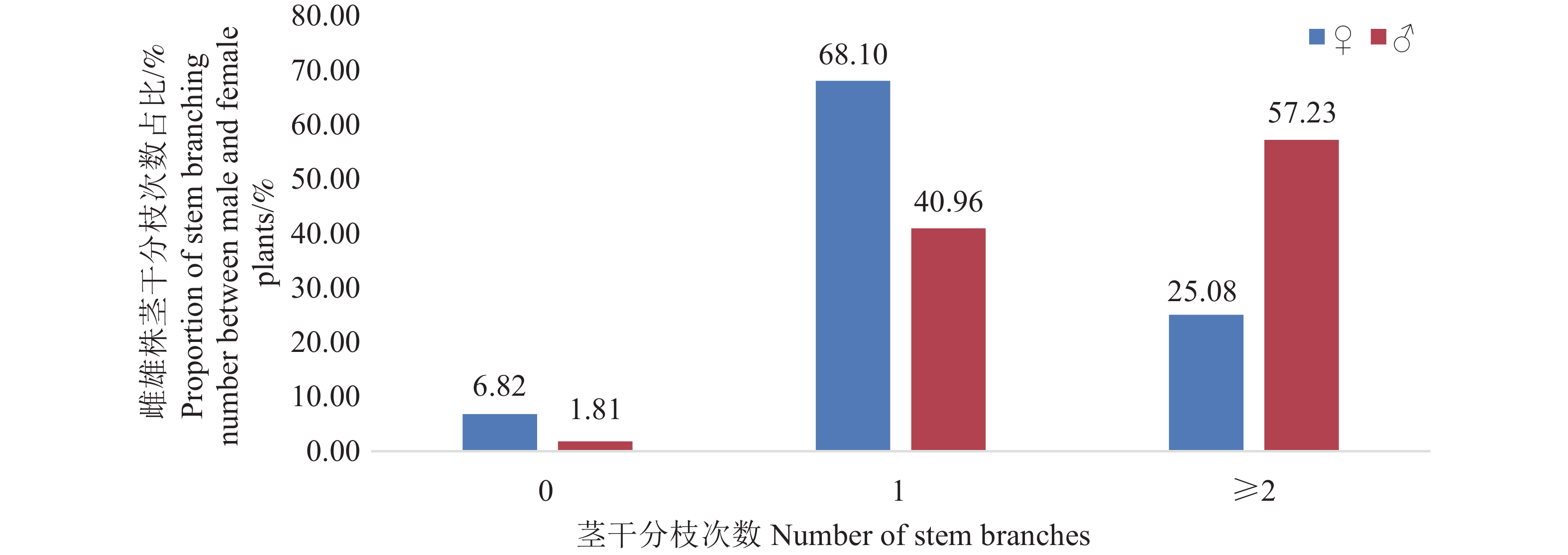 以南宁植物园篦齿苏铁(Cycas pectinata)迁地古树群为研究对象,统计雌雄株比例,分析茎高、胸径、冠幅、分枝及生长点等形态特征,通过探究篦齿苏铁古树群雌雄株茎干表型差异,为迁地保护与科学养护提供理论依据。统计发现,该古树群雌雄比为1:3.77,种群极显著偏雄;雄株平均茎高(452.92 cm)显著高于雌株(371.36 cm);雌株胸径、冠幅略大于雄株,但差异不显著;93.18%雌株与98.19%雄株发生分枝,其中,57.23%雄株分枝超2次;雄株平均单株生长点(3.69个)显著多于雌株(2.03个)。结果表明,篦齿苏铁古树雄株茎高、生长点数量及分枝能力均优于雌株,迁地栽培中可通过茎干性状初步判定性别,养护时应重点关注雌株生长,强化雌株保护措施。