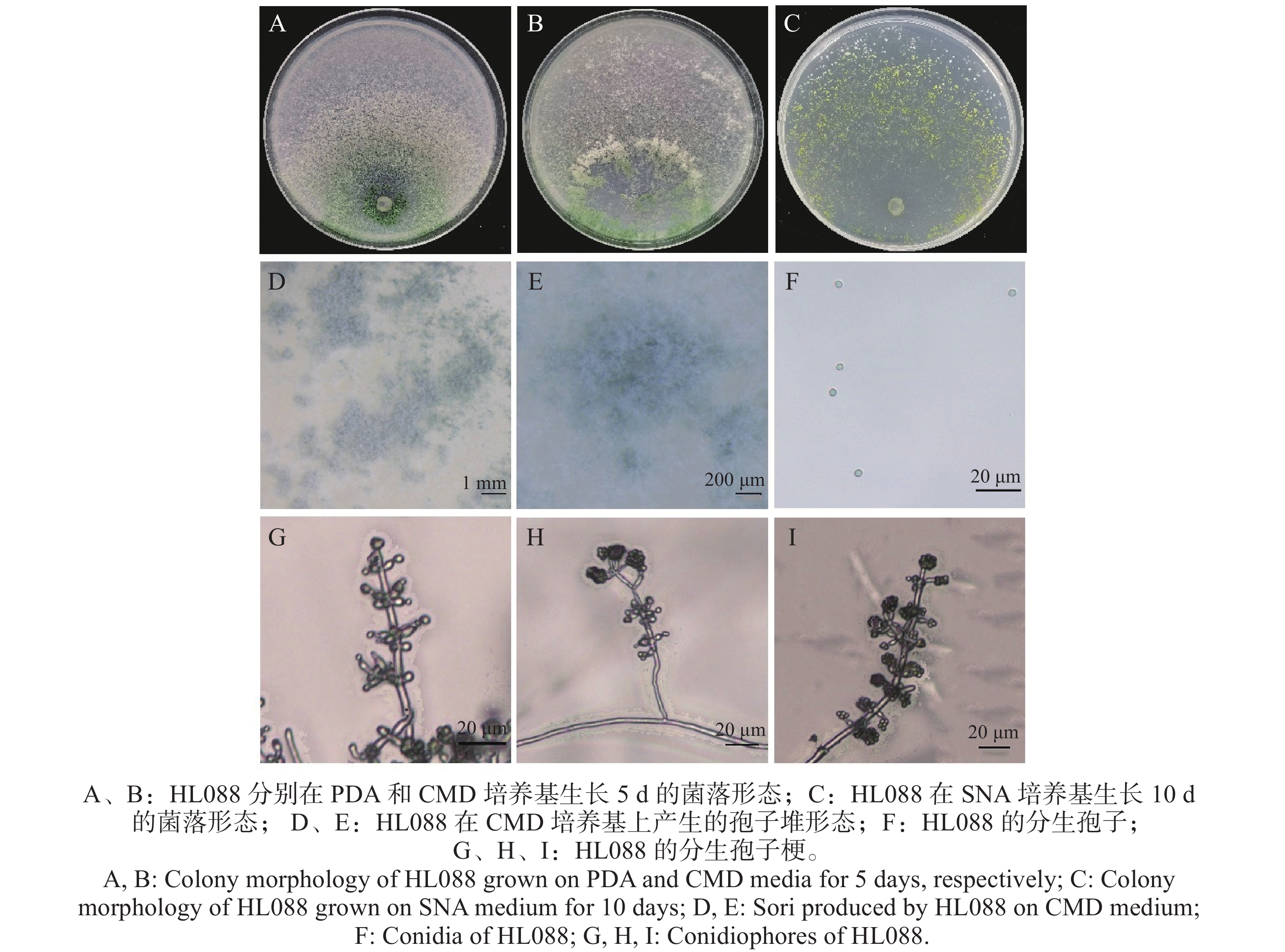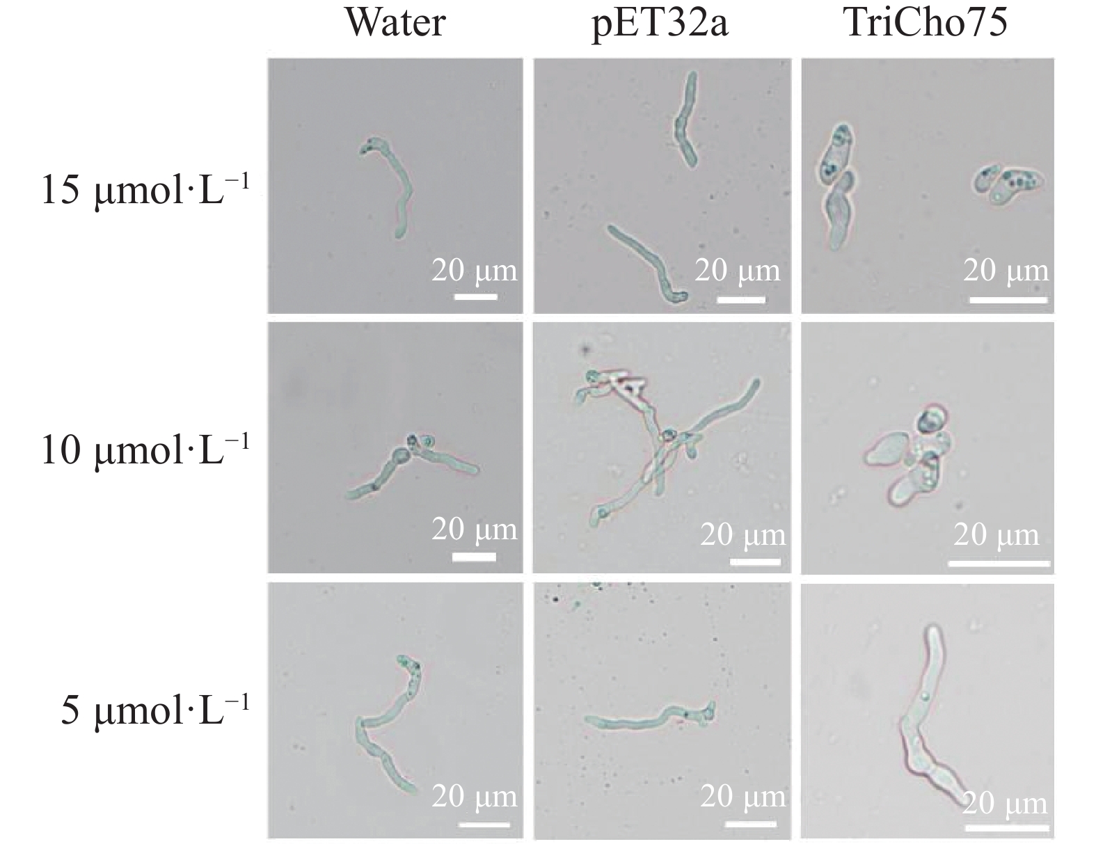 由尖孢镰刀菌黄瓜专化型(Fusarium oxysporum f.sp. cucumerinum)引起的黄瓜枯萎病是危害较严重的土传真菌病害之一,至今黄瓜枯萎病的有效防控仍是生产上的难点。本研究通过平板对峙法获得1株对黄瓜枯萎病菌具有显著拮抗作用的木霉菌株HL088,经形态学和分子生物学联合分析,被鉴定为近深绿木霉(Trichoderma paratroviride)。进一步通过硫酸铵分级沉淀与质谱分析,从该菌株固体发酵提取物中获得一种潜在的抑菌蛋白,壳聚糖酶TriCho75。原核表达与功能验证表明,重组蛋白TriCho75(15 μmol·L−1)能有效抑制黄瓜枯萎病菌的孢子萌发(抑制率96.44%)与菌丝生长(抑制率60.59%)。显微形态观察表明,重组蛋白TriCho75能造成黄瓜枯萎病菌孢子发生皱缩与畸形,并导致菌丝扭曲及粗细不均。以上结果表明,近深绿木霉HL088有成为黄瓜枯萎病生物防治剂的开发潜能。