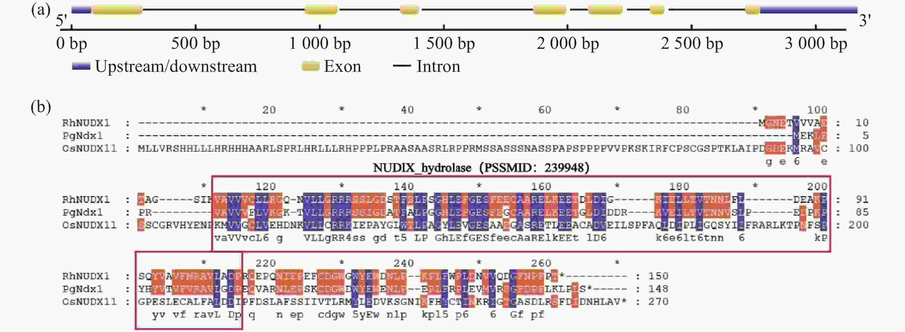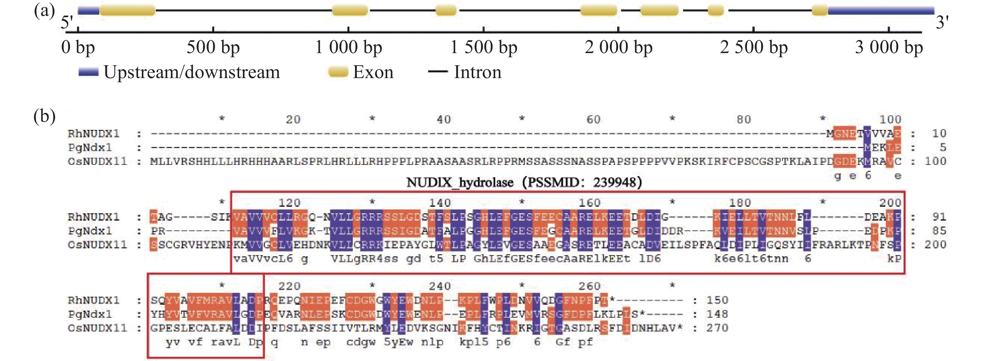 (a).OsNUDX11的基因结构图;(b).OsNUDX11、RhNUDX1和PgNdx1蛋白质序列比对结果。红框部分为其三者共有的NUDIX水解酶保守结构域,PSSMID号为239948。