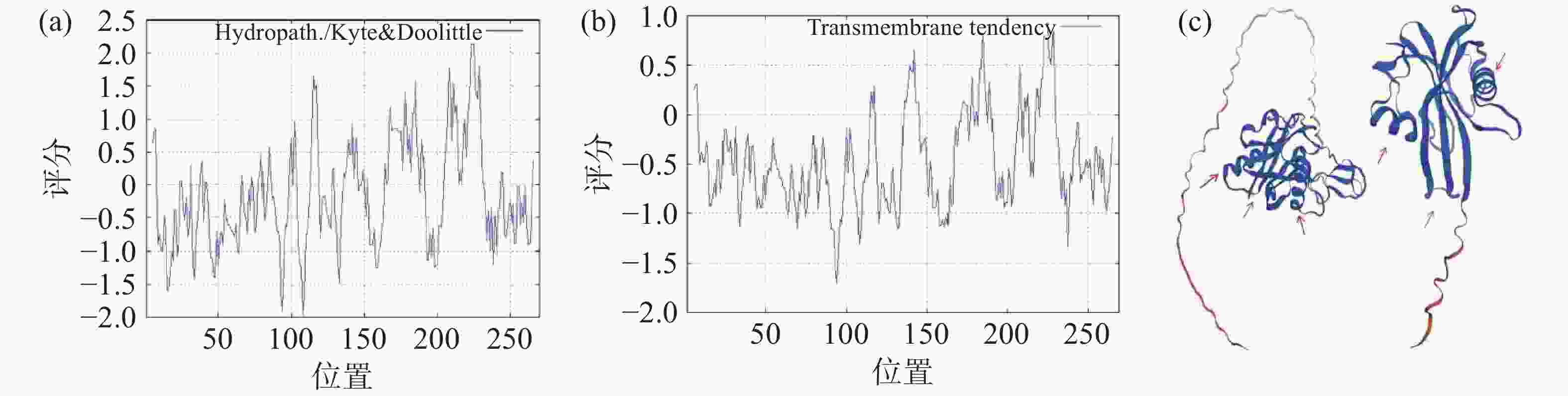 • 采用Espasy在线网站对OsNUDX11蛋白序列进行理化性质预测,结果表明,OsNUDX11蛋白质相对分子量为29.66 kDa,理论等电点为8.87,总平均亲水性GRAVY为-0.118,疏水性曲线与跨膜趋势分析中氨基酸序列密集均分布在负值以下(图3-a,图3-b),表明该蛋白为亲水性蛋白且不易发生跨膜;不稳定系数为71.95,表明该蛋白在体外环境中易失活;脂肪系数为92.19,表明其热稳定性较好,在温度波动范围内不易因热胁迫失活。,但在酶的参与下容易失活。使用SWISS-MODEL在线网站预测OsNUDX11蛋白质的三维结构,结果表明,OsNUDX11与RhNUDX1蛋白的三维结构相似,均具有两个螺旋结构以及排列整齐的网状结构(图3-c)。