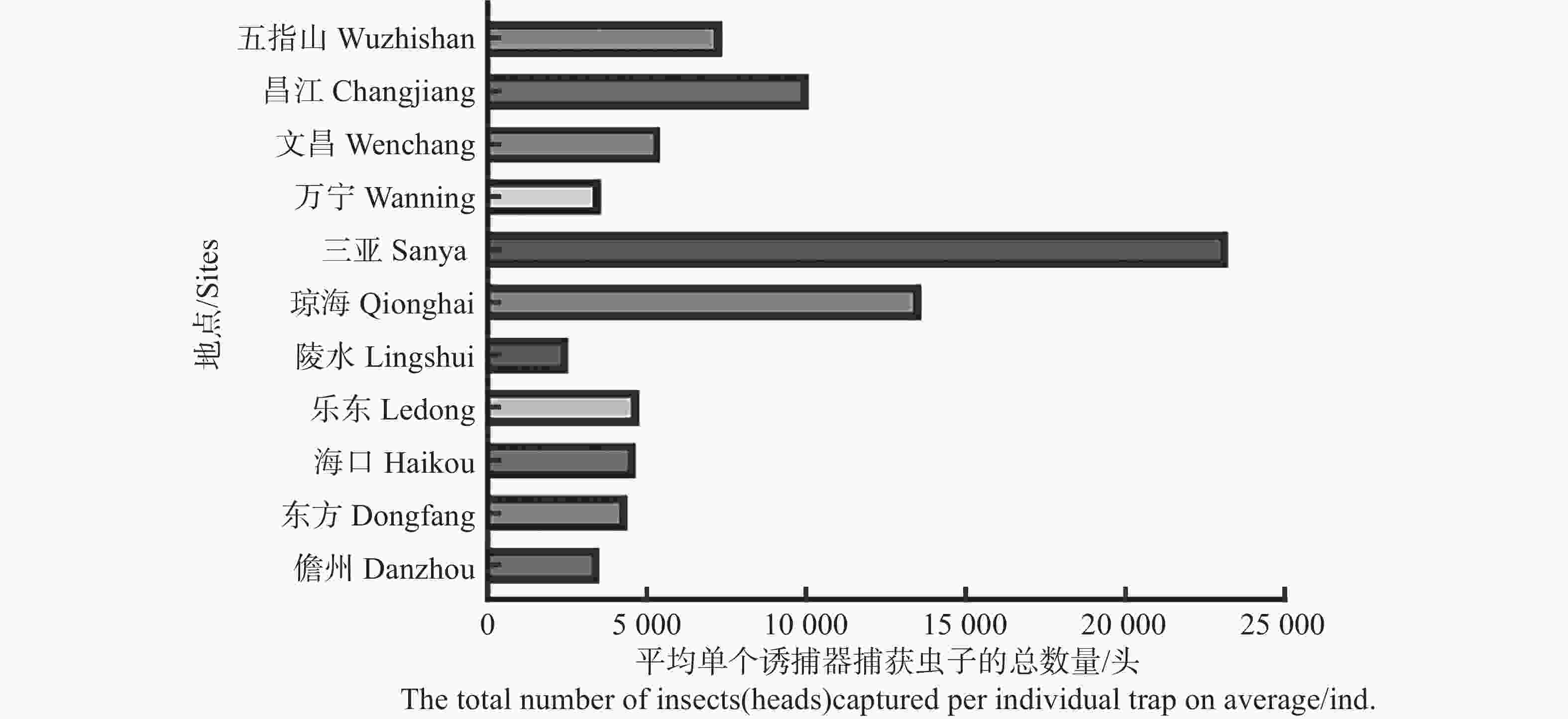 • 根据2020年5月至2021年12月间的桔小实蝇种群监测结果(图1),由图1可知,海南11个监测地点均可诱捕到桔小实蝇。其中,三亚监测点平均单个诱捕器诱捕到的桔小实蝇总头数为23 194.50头,是所有监测点中最高的,其他监测点平均单个诱捕器诱捕到的桔小实蝇总头数为琼海(13 600.75头)、昌江(10 069.67头)、五指山(7 347.71头)、文昌(5 420.75头)、乐东(4 755.25头)、海口(4 648.00头)、东方(4 384.50头)、万宁(3 557.00头)、儋州(3 506.75头)、陵水(2 540.50头),陵水监测点是所有监测点中最低的。监测结果表明海南不同区域的桔小实蝇种群数量是不相同的。