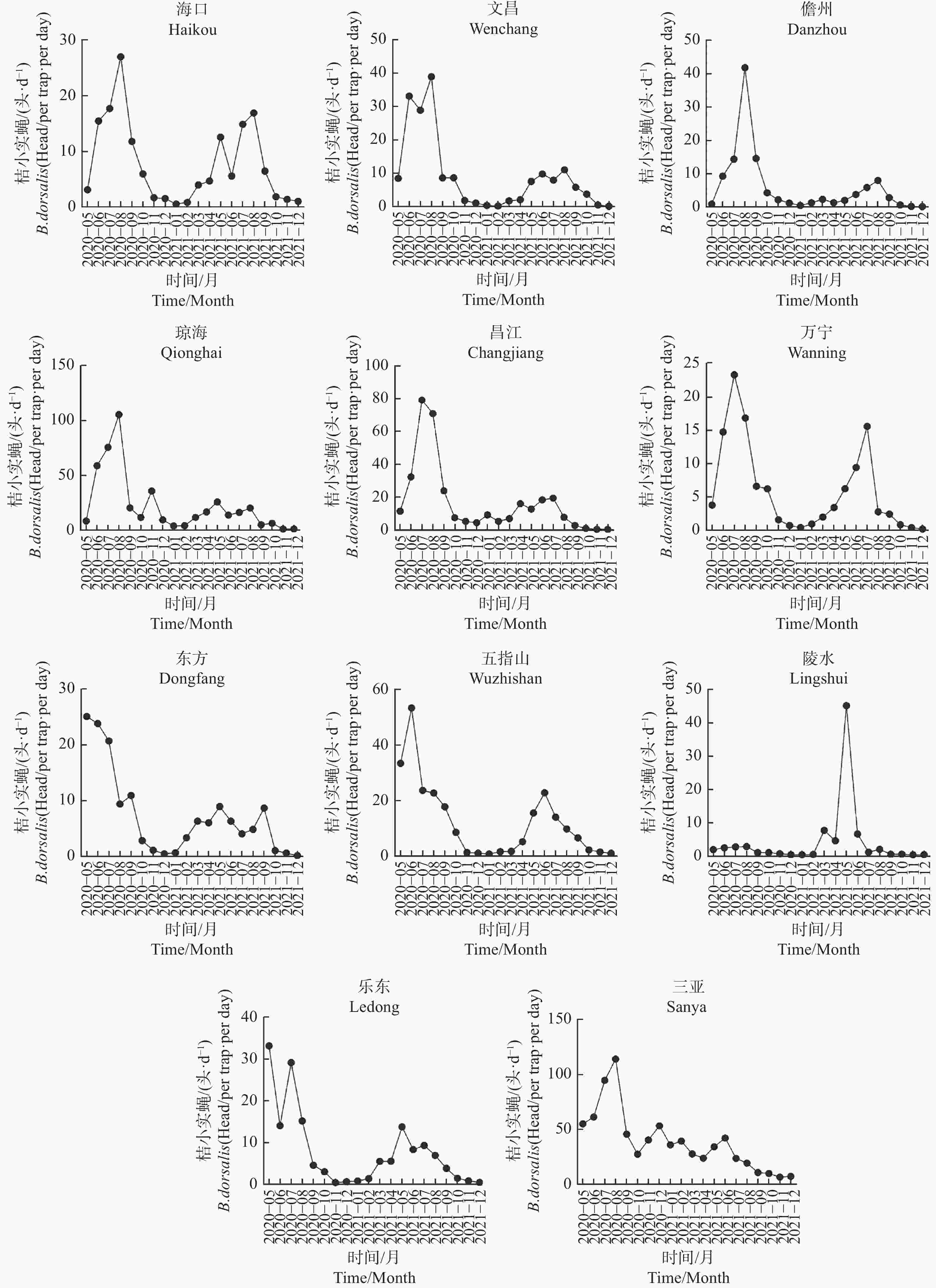 Fig.  2  Population dynamics of Bactrocera dorsalis at 11 monitoring sites in Hainan