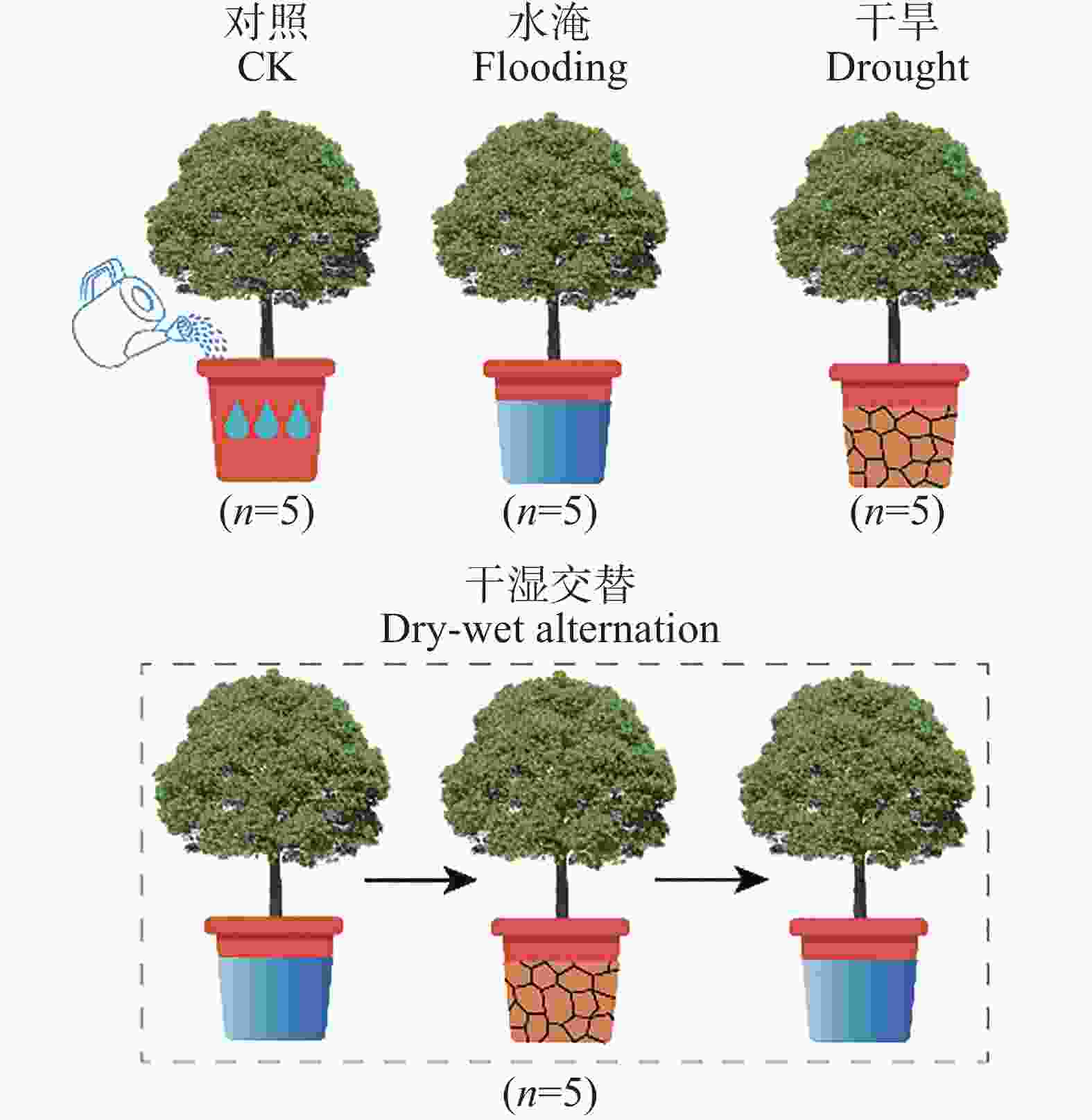 • 联合国政府间气候变化专门委员会(Intergovernmental Panel on Climate Change,IPCC)第6次报告指出,人类活动对大气环流的影响导致干旱、暴雨和旱涝交替等极端气候事件的发生频率增加,对自然生态系统产生了严重影响[1]。例如,在全球气候变暖背景下,频繁发生的高强度降水和洪涝灾害成为制约植物正常生长发育的主要水分胁迫因子[2]。同时,极端高温干旱致使全球多地湖泊和河流水位持续下降[3],进而威胁植物生长。此外,高强度降水和极端干旱的频发容易导致干湿交替现象出现,这些降水格局的变化将会影响土壤理化性质和微生物活性等,从而影响土壤有机碳的固存和植物生长[4]。鉴于植物在维持生态系统平衡和保障人类健康中的重要作用,探究极端气候胁迫对植物生长及土壤环境的影响十分必要。樟树(Cinnamomum camphora)因其生长速率快且病虫害少等特点,是热带和亚热带地区的一种重要绿化造林树种[5]。在生态功能上,樟树可以抑制粉尘、稳固土壤、防止风蚀及美化环境,具有较高的生态经济价值[6]。但樟树对环境的变化较为敏感,例如,在干旱胁迫下,香樟幼苗的水分生理机能衰退,光合能力以及对二氧化碳(CO2)的利用能力明显下降,从而抑制了体内有机物质的积累,进而影响樟树的生长[7]。然而,樟树对不同类型的胁迫表现出不同的响应策略,并与胁迫条件下的土壤养分含量密切相关。干旱通常促进根系在土壤中延伸,因为干旱胁迫会降低土壤碳含量、碳氮比和微生物生物量碳等土壤养分含量[8],使植物需要更长的根系来获取养分,而过湿的环境则可能有利于叶片生长[9]。此外,干湿交替条件下,土壤氮素矿化可能增加、减少或无显著变化[10],土壤有机质分解也可能增加或无显著变化[11]。面对不同的水分胁迫时,樟树展示出不同的生长反应。例如,干湿交替下樟树叶片营养物质也可能没有显著变化[9]。因此,以樟树为研究对象,探究极端水分胁迫对其生长和生长环境的影响具有重要的科学意义[12]