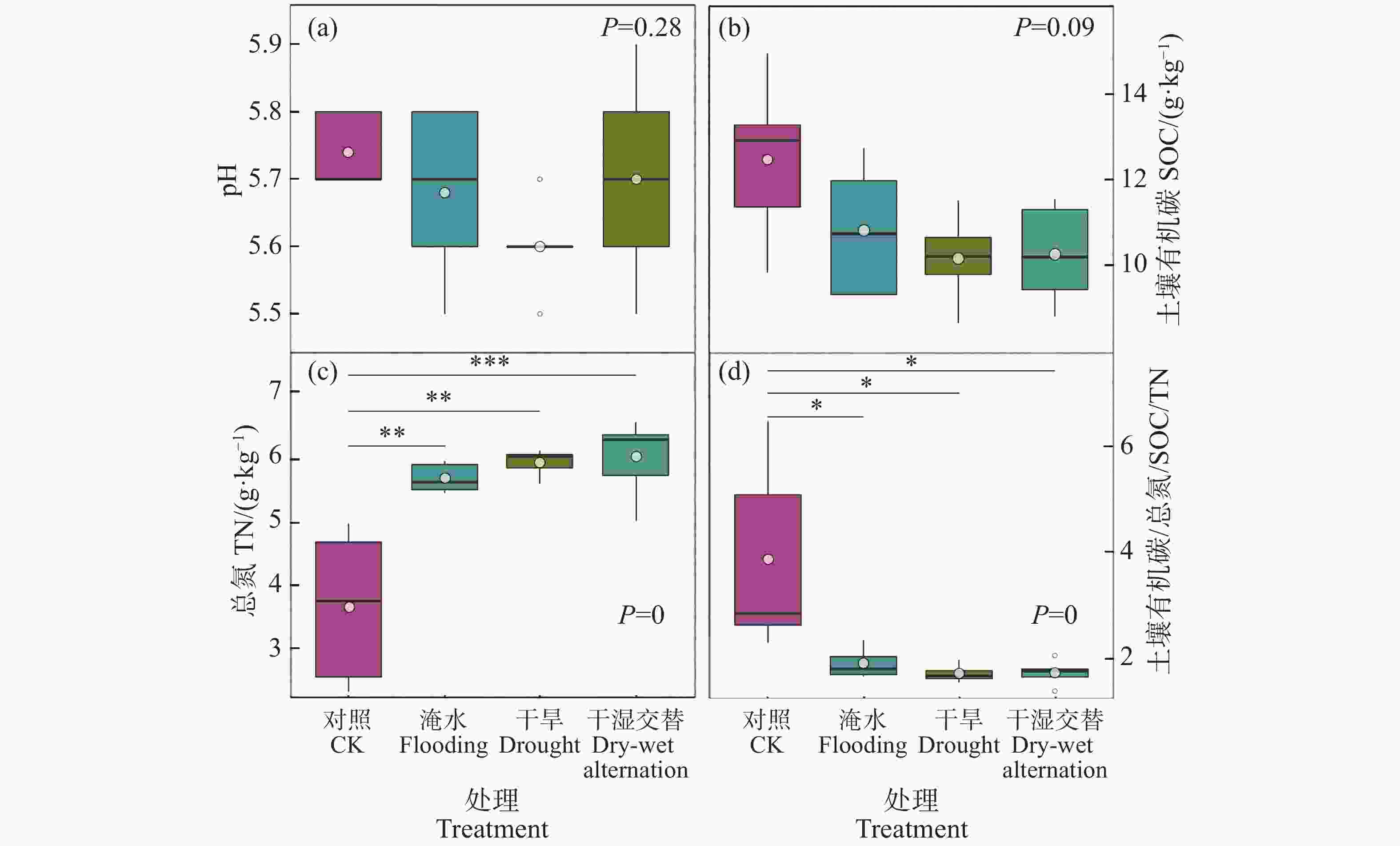 • 图  2  各处理下土壤pH(a)、有机碳(b)、总氮(c)和碳氮比(C/N)(d)