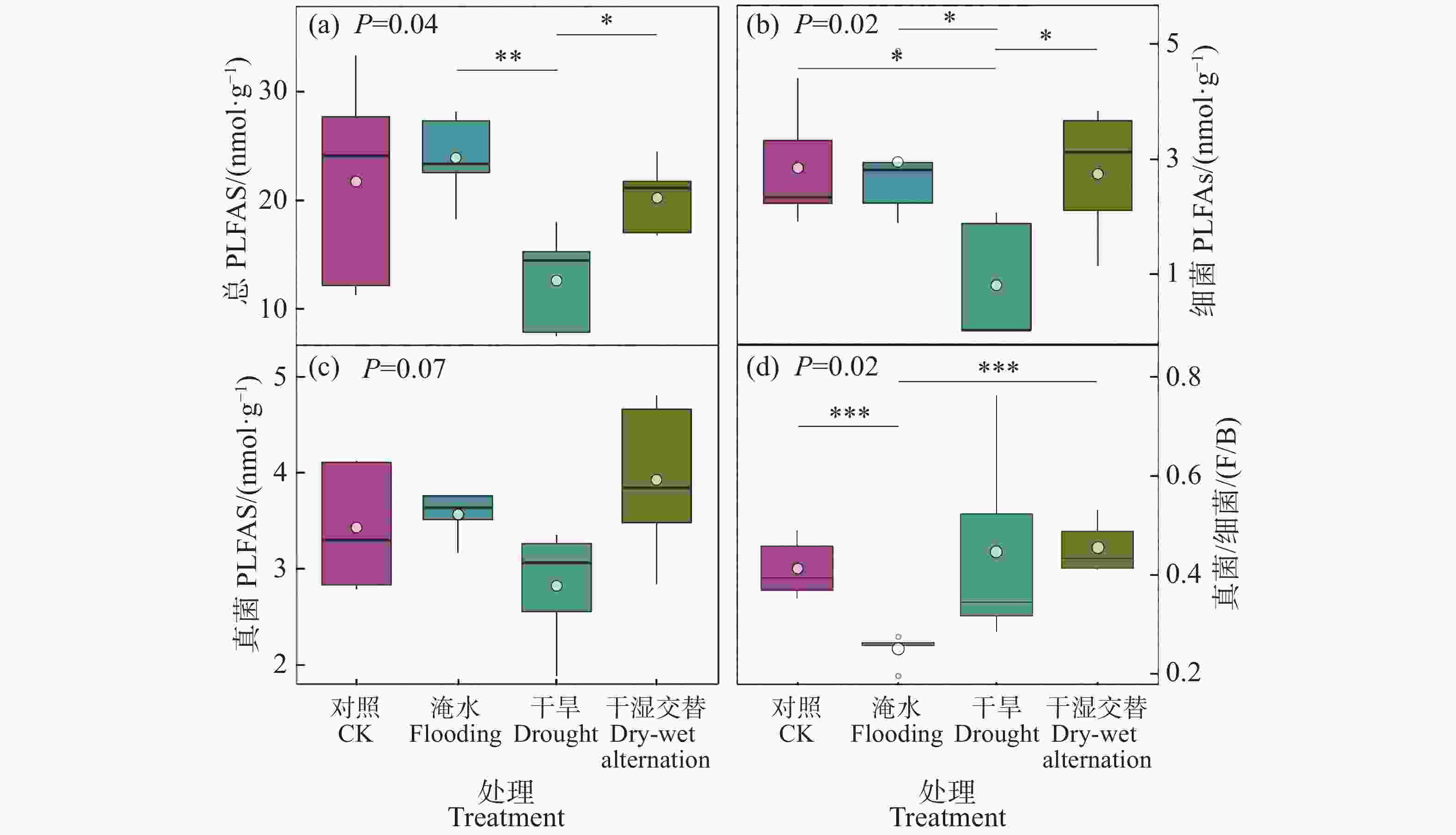 • 总微生物生物量在干旱胁迫下显著低于水淹胁迫和干湿交替胁迫(图3−a)。进一步分析细菌生物量和真菌生物量发现,干旱胁迫下细菌生物量显著低于其他处理(图3−b);真菌生物量在各处理之间无显著差异(图3−c);水淹胁迫下真菌/细菌(F/B)显著低于对照组和干湿交替处理组(图3−d)。