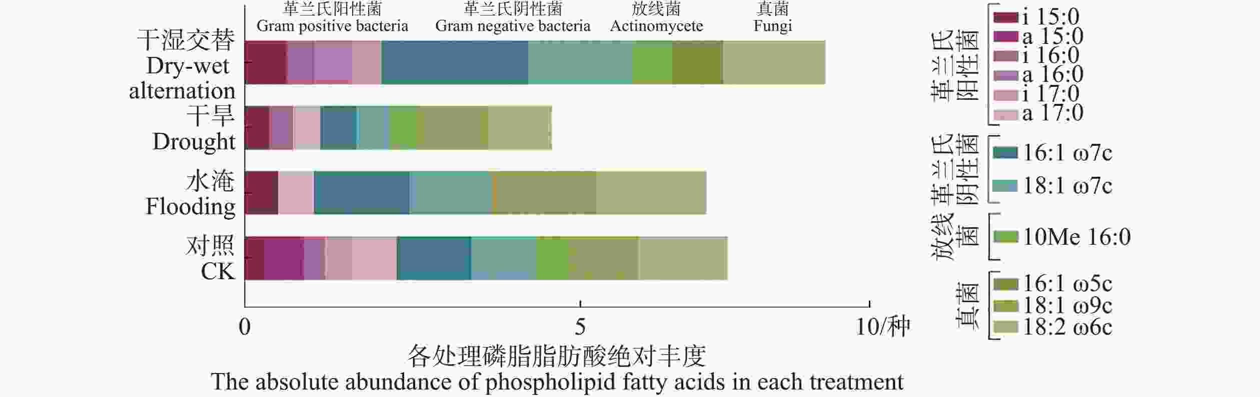 • 图4可看出,干湿交替胁迫下微生物生物量丰度的增加主要是由于革兰氏阴性细菌含量的增加。水淹胁迫下,革兰氏阳性菌丰度减少,而革兰氏阴性细菌和真菌丰度增加。干旱胁迫下微生物生物量丰度减少。