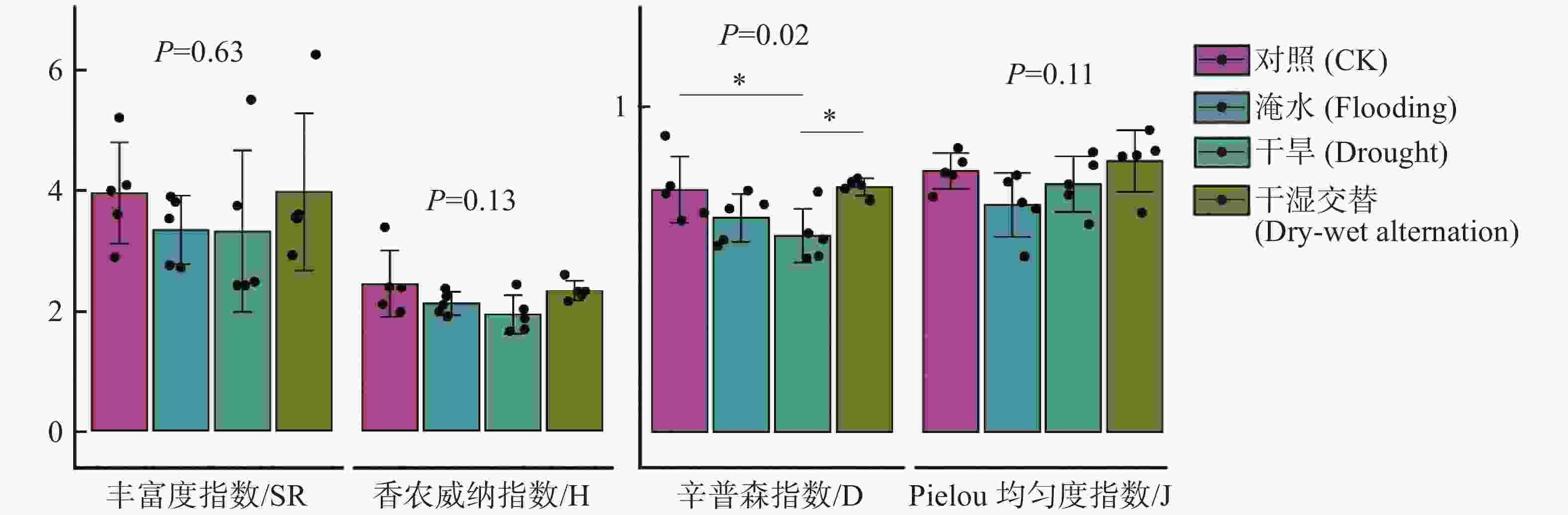 各微生物多样性参数中,Simpson指数在干旱胁迫下显著低于对照和干湿交替处理;各处理在丰富度指数、香农–威纳指数和Pielou均匀度指数上,均无显著性差异(图5)。