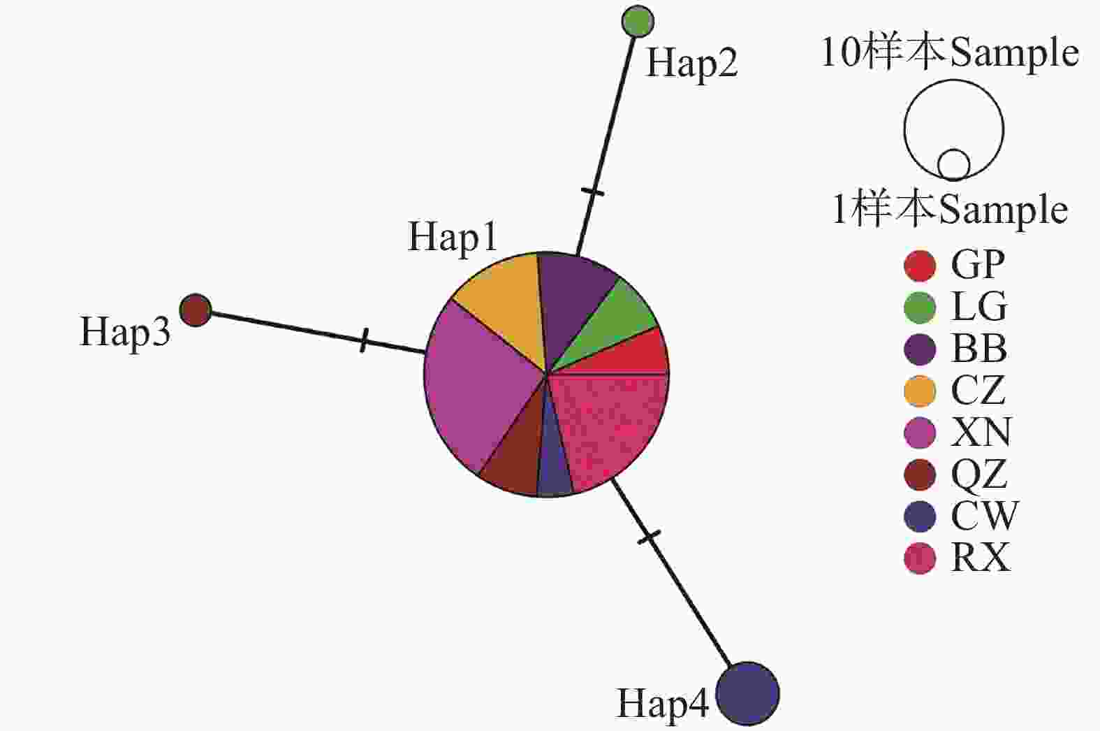 • 广西8个区县67个虫株的松材线虫共有4个单倍型(表4),其中Hap1出现的频率最高,占所有单倍型的91.0%。而Hap2、Hap3和Hap4出现的频率较低,Hap4占所有单倍型的6.0%,Hap2和Hap3均在本研究中出现1次。进一步地分析广西松材线虫单倍型网络图(图1),发现广西松材线虫以Hap1为中心节点,所有种群均包含了Hap1。同时,以Hap1分化出了3个进化分支,Hap2、Hap3和Hap4分别出现在临桂区、全州县和苍梧县内。