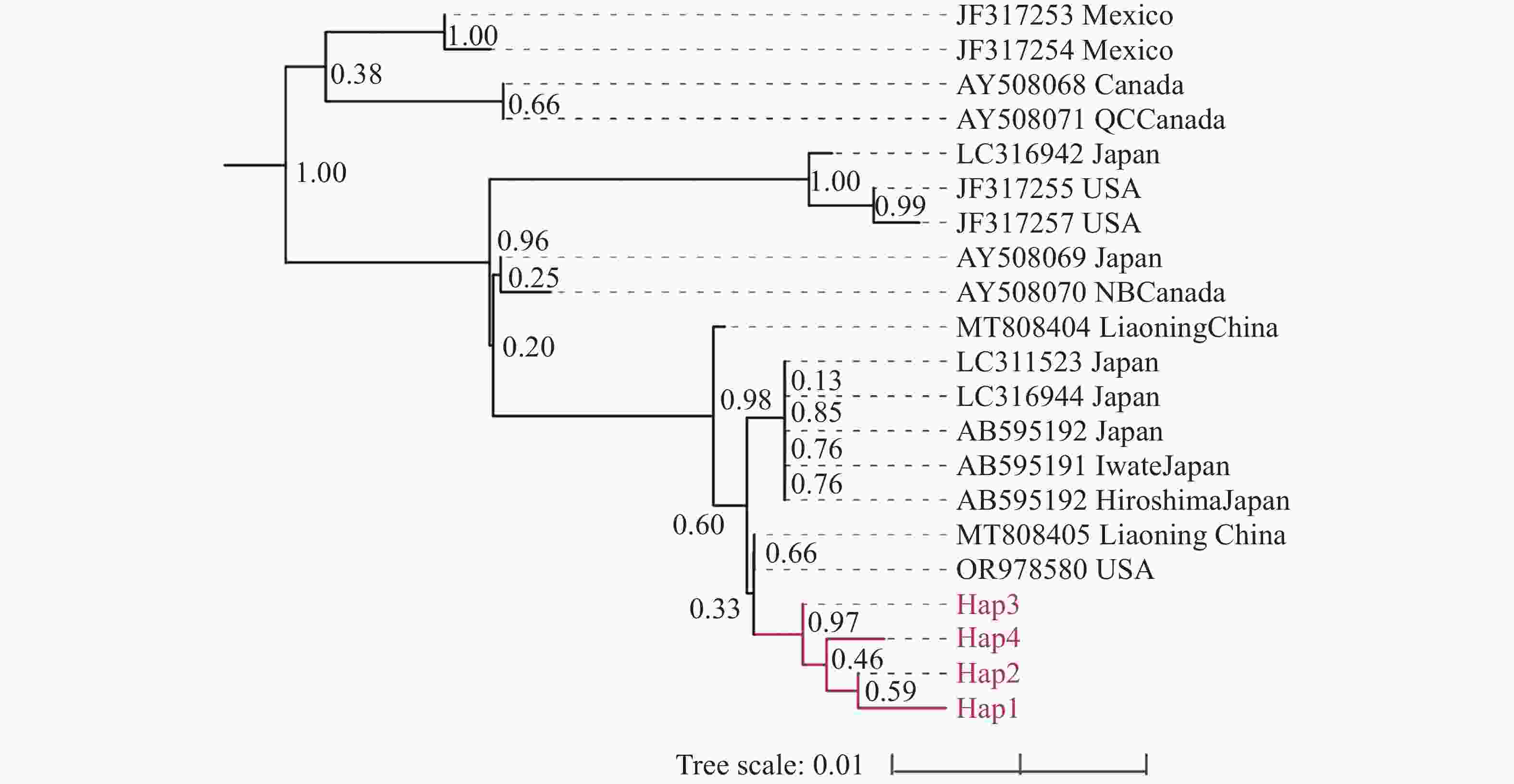 • 基于mt COⅠ基因构建的松材线虫系统发育树,21 条来自不同地区的松材线虫 mt COⅠ 基因分为两个大支(图2)。来自加拿大与墨西哥的松材线虫聚成一支;来自日本、加拿大、美国以及中国的松材线虫聚成一支,其中,中国广西的松材线虫独聚一支,与国内外其他地区的松材线虫明显区分开来。Hap3与其他3个单倍型具有明显区别(支持率 > 0.95)。