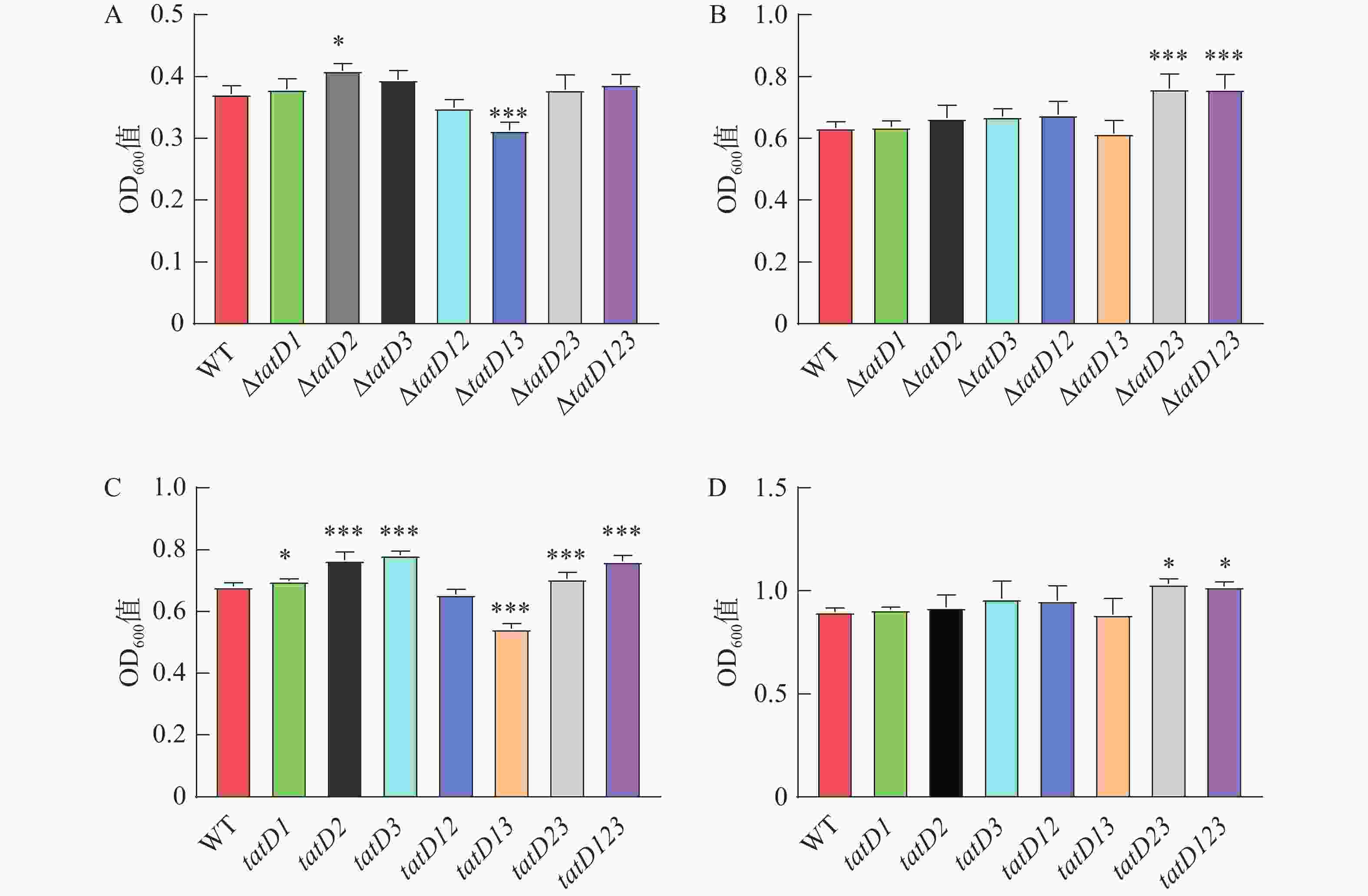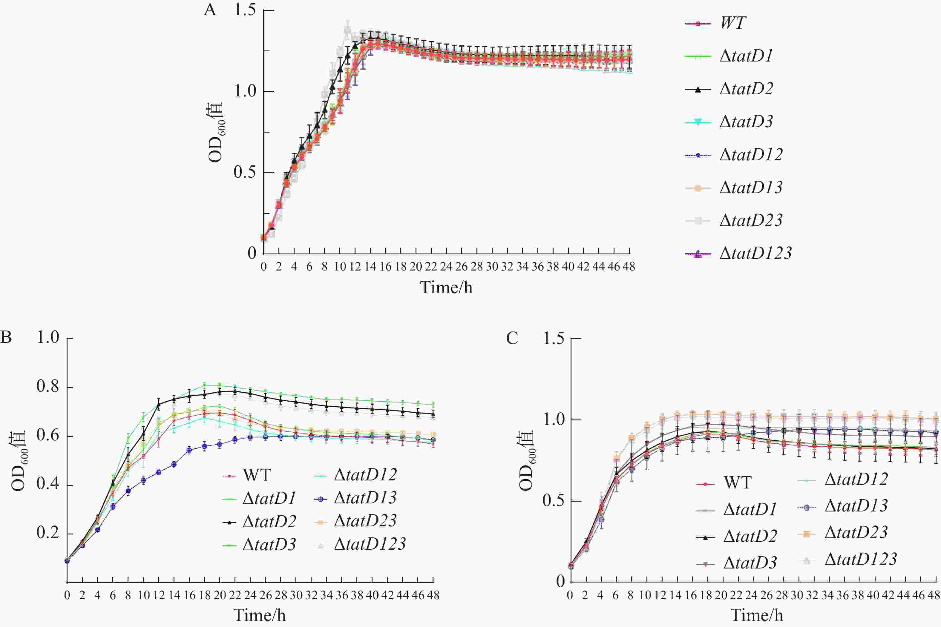 • 溶藻弧菌HN08155(WT)与tatD基因缺失株在正常营养条件下,48h内的生长曲线如图3-A所示, 溶藻弧菌野生株与tatD基因的缺失株生长趋势相似。最初各种菌株都处于生长延迟期,在这个时期内,各菌株生长速度较为缓慢;在对数生长期时,细菌生长迅速,并且细菌数量呈指数级增加,在各菌株进入了生长平台期后,细菌增长稳定,生长曲线基本上趋于一致。结果表明,单独缺失tatD任何一个基因,或者缺失两个基因,以及三者同时缺失,均未对溶藻弧菌HN08155的生长特性产生明显影响。在营养条件较低的M9培养基中,各tatD基因缺失菌株的生长能力明显高于野生株。其中△tatD123、△tatD2与△tatD3菌株生长趋势显著上升( P < 0.000 1)(图3-B),在培养48 h后,tatD基因缺失株菌体浓度均高于野生株。同时,在不添加Fe2+时,野生菌株与缺失菌株生长差异明显,而在添加Fe2+后,各菌株生长差异不显著,菌株生长趋势与菌体浓度差异缩小(图3-C)。表明溶藻弧菌tatD基因在不同营养条件下表现出了不一样的功能。