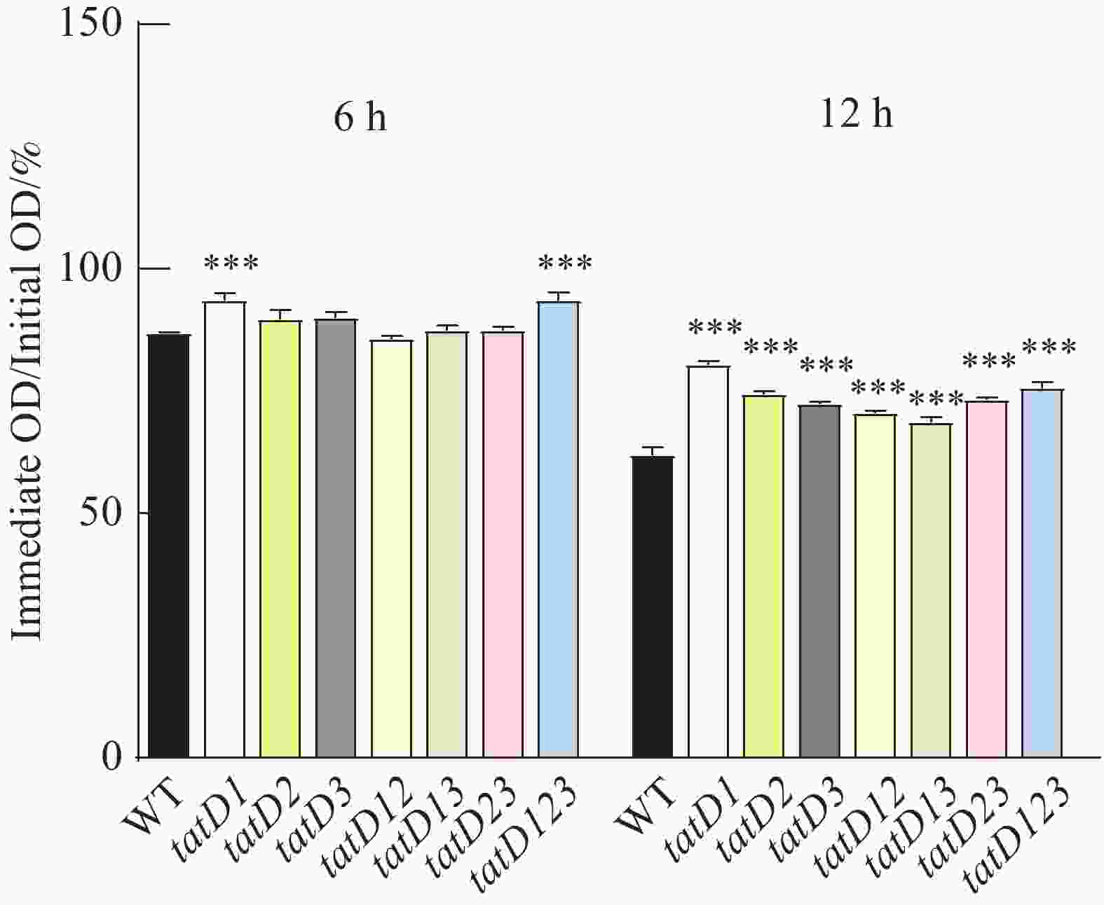 • 在Triton X-100(体积浓度为0.1%)的诱导下。对溶藻弧菌HN08155(WT)及其tatD缺失菌株进行的自溶活性分析结果如图6所示。图7显示了在6和12 h,测定的野生菌株与tatD缺失菌株的自溶率。在0~6 h内,野生株和tatD基因缺失株的自溶活性曲线呈现缓慢下降趋势,在6 h的时候,两者自溶率之间尚无显著性差异,而在6~12 h,野生株和tatD基因缺失株的自溶活性曲线下降速度加快,12 h的时候,tatD基因缺失株自溶率显著高于野生株。结果表明,与野生型菌株相比,tatD基因缺失株的自溶活性显著降低。