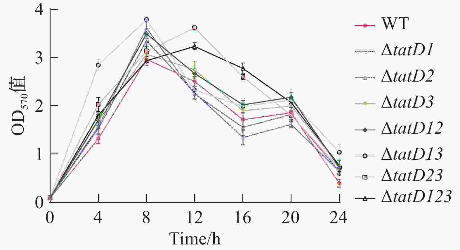• 为了深入研究溶藻弧菌HN08155菌株中tatD基因的功能和作用机制,本研究构建了tatD基因缺失突变株,并对其进行生物学特性分析。实验结果显示,在正常营养条件下,tatD基因的缺失对溶藻弧菌的生长能力没有影响。一些类似研究结果也表明,tatD基因不参与细菌生长调控,如单增李氏特菌、化脓性隐球菌、肺炎链球菌和迟缓型艾德华氏菌在失去tatD基因后,其生长能力并未受到影响[21]。不过,进一步的实验表明,在营养较为匮乏的环境下,tatD基因敲除菌株相较于野生型菌株表现出了更好的生长能力,各缺失株与野生株相比具有明显的生长趋势上的差异,在添加Fe2+后,各菌株生长差异会显著降低。这种差异可能是由于tatD基因缺失菌株能够形成较野生株更多的生物膜,膜中细菌生长缓慢以及被膜的保护能力增强了tatD基因缺失株的生长能力;也有研究结果表明,tatD是铁硫蛋白质控制中心组成成分之一,对于蛋白的输出至关重要[22],在M9培养条件下可能影响了离子相关蛋白的输出,进而影响了菌株的生长;以上实验结果证明了tatD基因并非溶藻弧菌生长核心基因,在正常营养条件下缺失了tatD基因并不会影响溶藻细菌的生长。而在不利的环境条件下,溶藻弧菌可能通过tatD基因调控形成生物被膜,或影响了离子相关蛋白的输出,进而影响了菌株的生长。