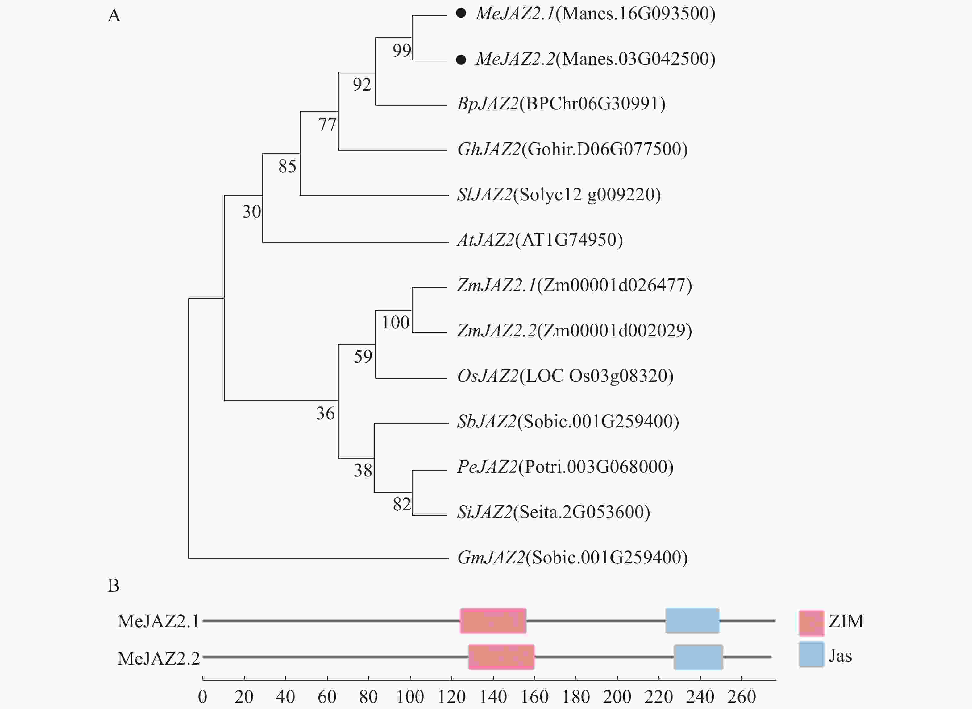 • 为了明确MeJAZ2基因与其他植物的进化关系。将木薯、拟南芥、水稻、番茄等10个植物的JAZ2基因同MeJAZ2基因采用最大似然法构建系统发育进化树(图1-A),Bootstrap method参数设定为1 000。发现木薯MeJAZ2.1MeJAZ2.2同白桦BpJAZ2、棉花GhJAZ2及番茄SIJAZ2具有较近的亲缘关系。为进一步探索MeJAZ2.1MeJAZ2.2的功能,通过保守结构分析可以发现,MeJAZ2.1位于氨基酸序列N端124~156为ZIM保守结构域,位于C端223~249为Jas保守结构域。MeJAZ2.2氨基酸序列在128~160和227~251位置同样含有ZIM和Jas保守结构域(图1-B)。ZIM和Jas作为JAZ家族特有的强保守结构域,从而证实MeJAZ2.1MeJAZ2.2都属于JAZ基因家族。