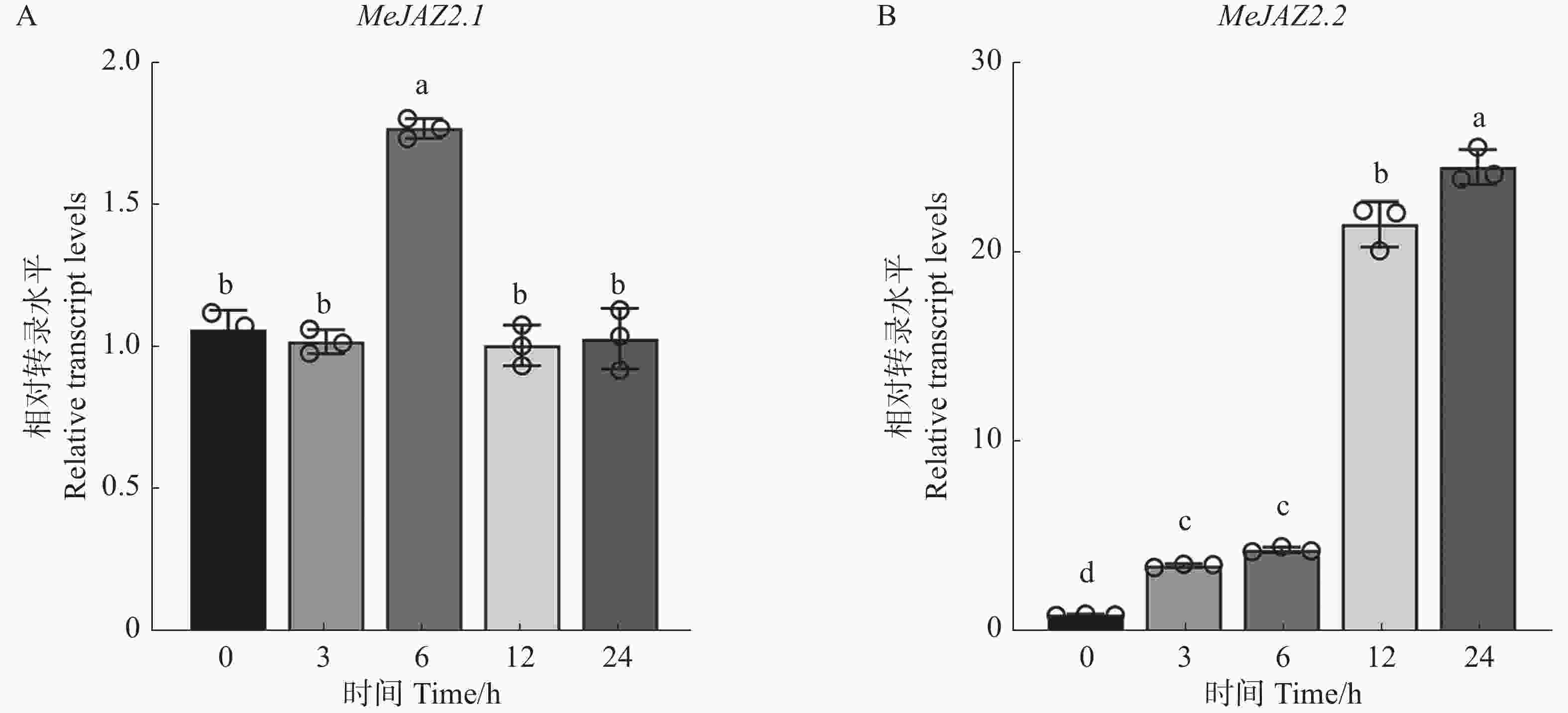 • 为探究MeJAZ2.1MeJAZ2.2在木薯盐胁迫过程中表达量变化。用200 mmol·L−1浓度氯化钠溶液处理样品根部,通过RT-qPCR技术进一步分析MeJAZ2.1MeJAZ2.2在盐胁迫下基因表达水平的变化。结果如图2所示,MeJAZ2.1在盐胁迫条件下其表达量除在6 h略有上调外,均稳定在1倍左右(图2-A)。MeJAZ2.2表达量在受胁迫后显著上调,处理12 h时上调了21倍,在24 h达到峰值,上调至24倍(图2-B)。上述结果表明,MeJAZ2.1MeJAZ2.2参与了对盐胁迫的响应。MeJAZ2.2表达量变化更为明显,选取其进行下一步研究。