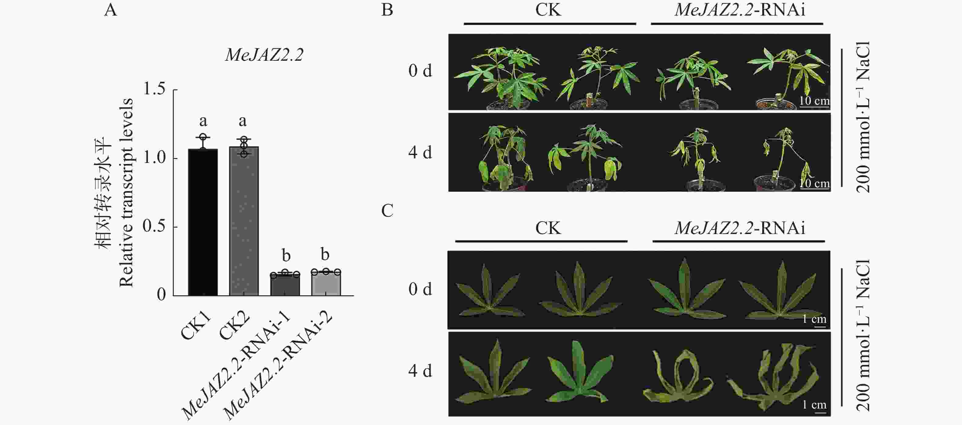 A. 应为MeJAZ2.2相对转录水平。小写字母表示存在显著性差异(P<0.05);B. 应为盐胁迫条件下木薯整株生长情况(标尺为10 cm);C.应为盐胁迫处理条件下木薯叶片表型(标尺为1 cm)。