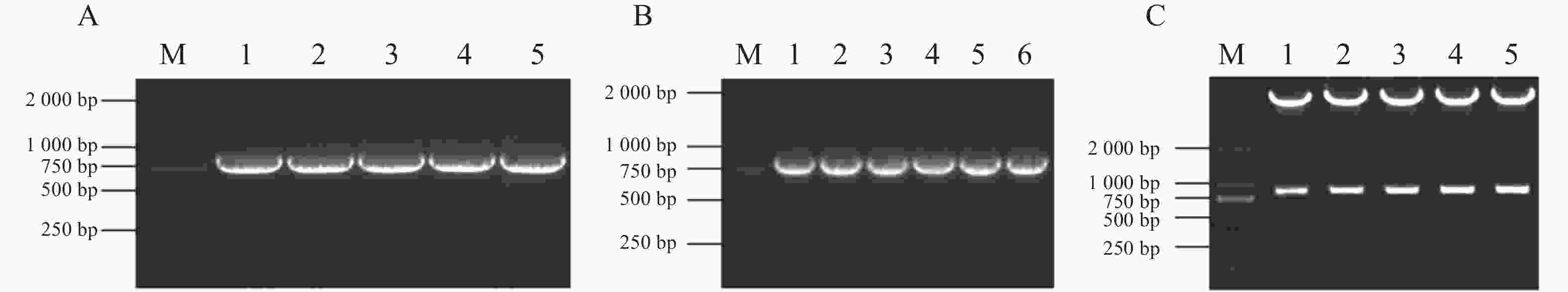 Note: M, DL2000 DNA Maker; A1−A5, Cloning of MeJAZ2.2 gene; B1−B6, Escherichia coli colony PCR; C1−C5, Enzyme digestion validation.