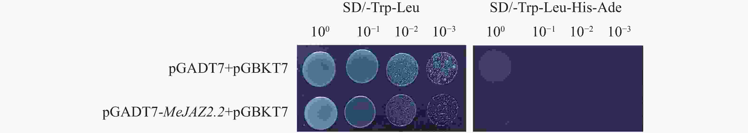 • 将pGADT7-MeJAZ2.2质粒和pGBKT7空载质粒等量混匀,转入制备好的AH109感受态细胞中,以pGADT7空载和pGBKT7空载为负对照。转化后的酵母菌液均匀涂在SD/-Leu/-Trp固体培养基上,28 ℃培养箱放置3~4 d。挑选SD/-Leu/-Trp固体培养基上生长的酵母单菌落,接种到SD/-Leu/-Trp液体培养基中,摇起后稀释100、10−1、10−2、10−3 4个浓度梯度,分别点板于SD/-Leu/-Trp和SD/-Ade-His-Leu-Trp固体缺陷培养基上。检测标准:SD/-Leu/-Trp固体培养基上有酵母菌落生长,SD/-Ade-His-Leu-Trp固体培养基上无酵母菌落生长,可证明MeJAZ2.2蛋白无自激活活性;若2种固体培养基上均有酵母菌落生长,则认定MeJAZ2.2蛋白存在自激活活性。