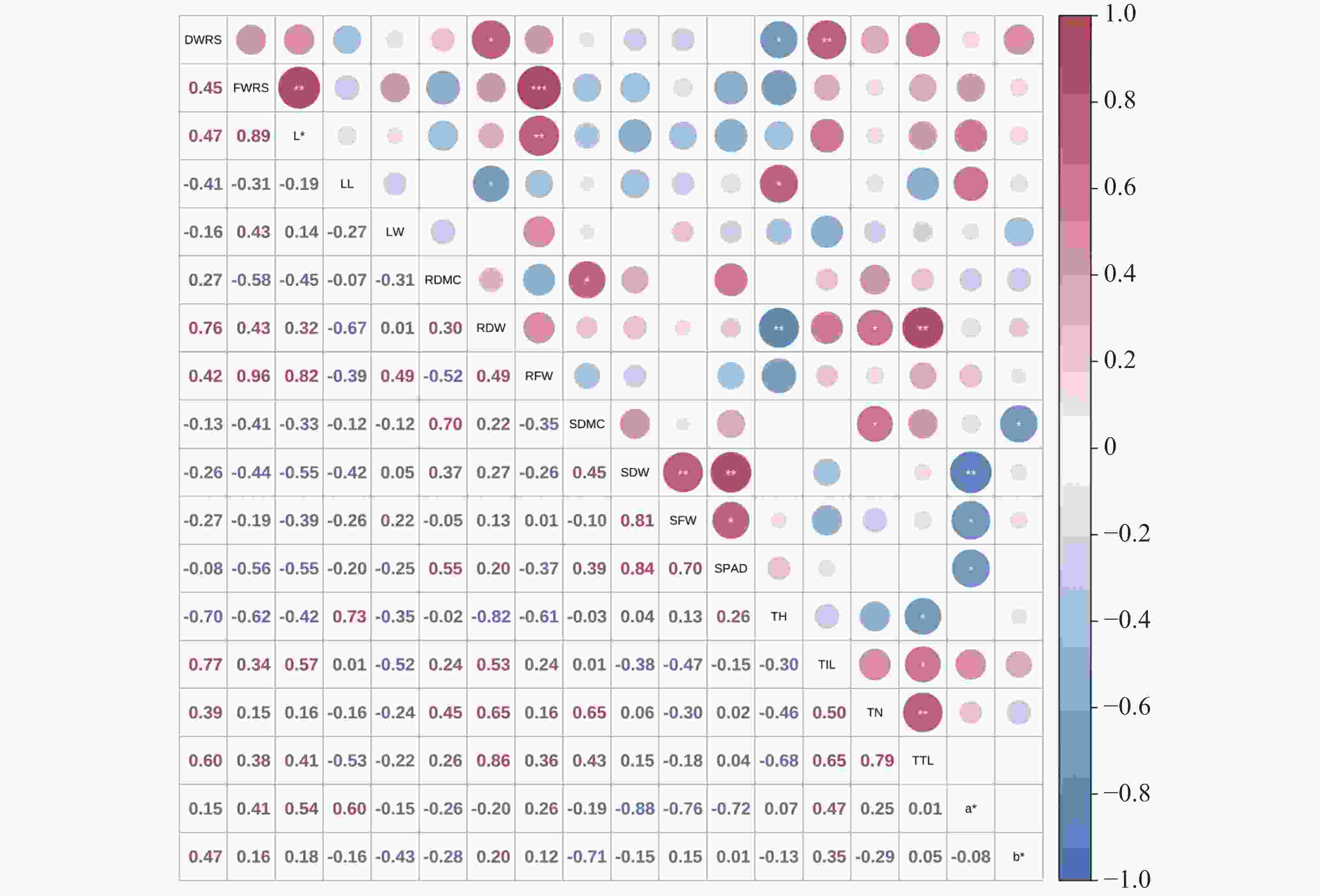 根据每个指标的耐低氮系数(表1)进行相关性分析,结果表明,指标间均存在不同程度的相关性,综合影响着海雀稗的耐低氮能力(图1)。其中,叶绿素含量(SPAD)与地上部鲜质量(SFW)呈显著正相关(P<0.05),相关系数为0.70;与叶色读值2呈显著负相关(P<0.05),相关系数为−0.72;与地上部干质量(SDW)呈显著正相关(P<0.01),相关系数为0.84。地下部鲜质量(RFW)与根冠鲜质量比(FWRS)呈显著正相关(P<0.001),相关系数为0.96;与叶色读值1呈显著相关(P<0.01),相关系数为0.82。分蘖总长度(TTL)与分蘖数(TN)、地下部干质量(RDW)均呈显著相关(P<0.01),相关系数分别为0.79和0.86;与分蘖节间长(TIL)和草层高度(TH)呈显著相关(P<0.05),相关系数分别为0.65和−0.68。指标之间相关性的各种关联,说明存在信息冗余,需采用主成分分析法进一步发掘各指标的内在相关性。