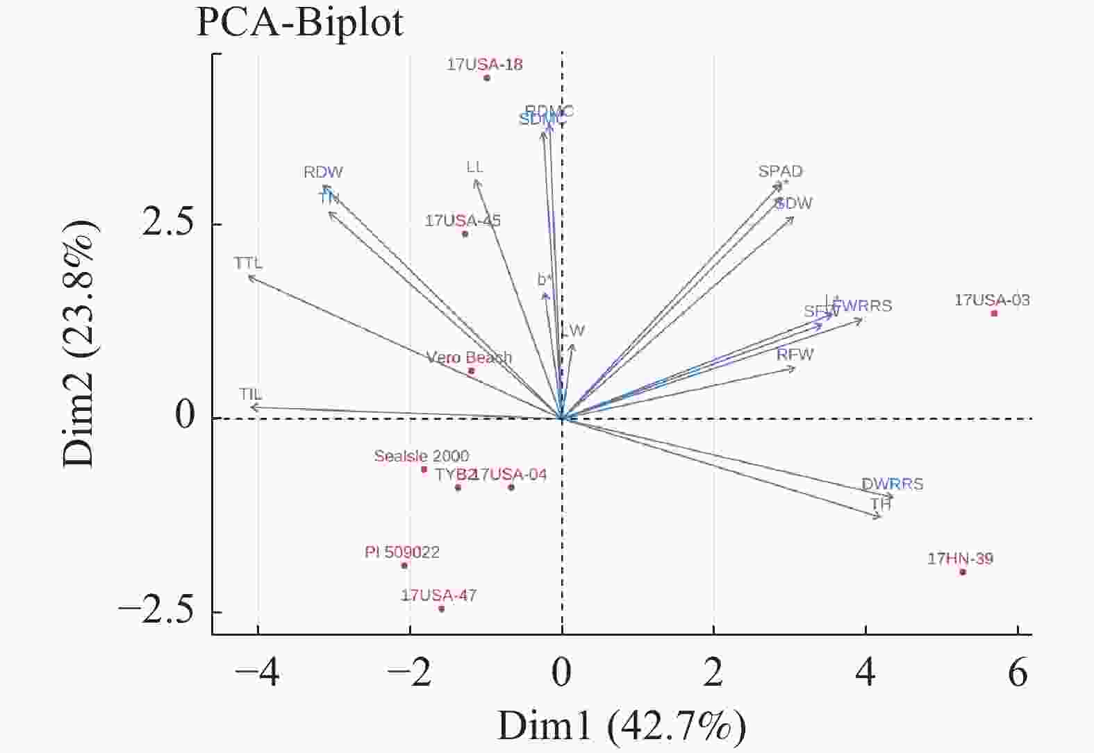 种质 Samples Dim.1 Dim.2 Dim.3 Dim.4 D值 D values 排名 Ranking 17USA-03 5.77 1.27 −2.19 0.33 2.65 1 17HN-39 5.23 −2.10 1.70 −1.08 1.96 2 17USA-18 −1.05 4.31 0.92 −1.82 0.48 3 17USA-45 −1.02 2.56 −1.29 2.31 0.30 4 Vero Beach −1.11 0.70 2.85 0.15 0.13 5 17USA-04 −0.40 −0.68 0.93 2.00 0.08 6 TYB 2 −1.37 −0.85 0.14 0.35 −0.76 7 17USA-47 −1.60 −2.38 0.54 1.03 −1.09 8 Sealsle 2000 −2.21 −0.90 −1.22 −3.04 −1.85 9 PI 509022 −2.23 −1.94 −2.38 −0.25 −1.90 10 -